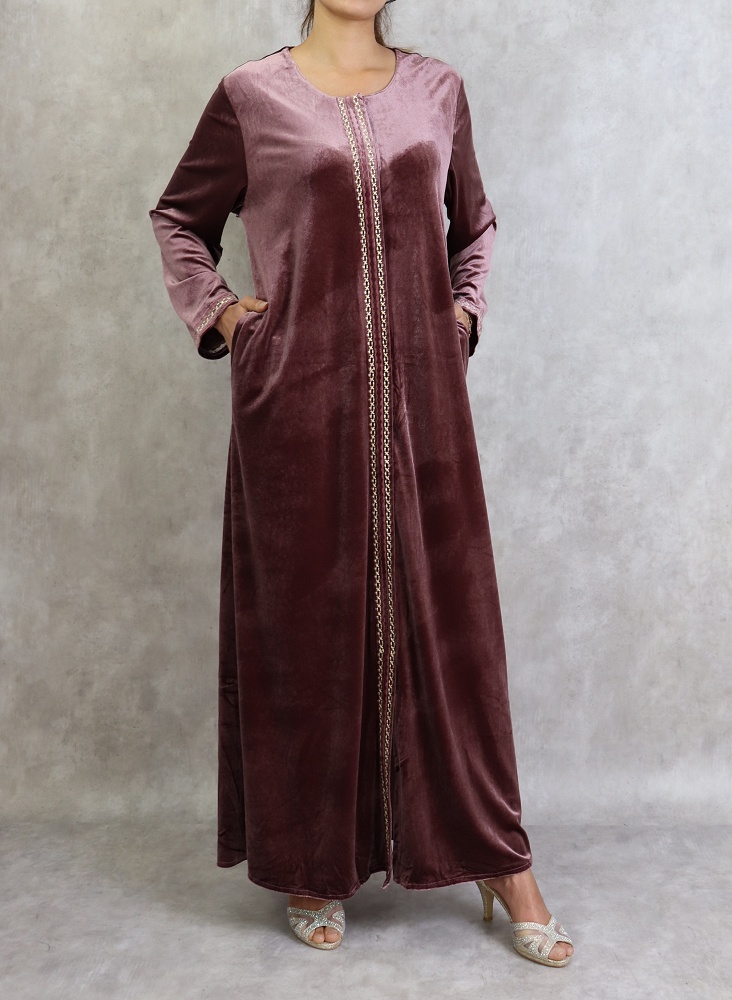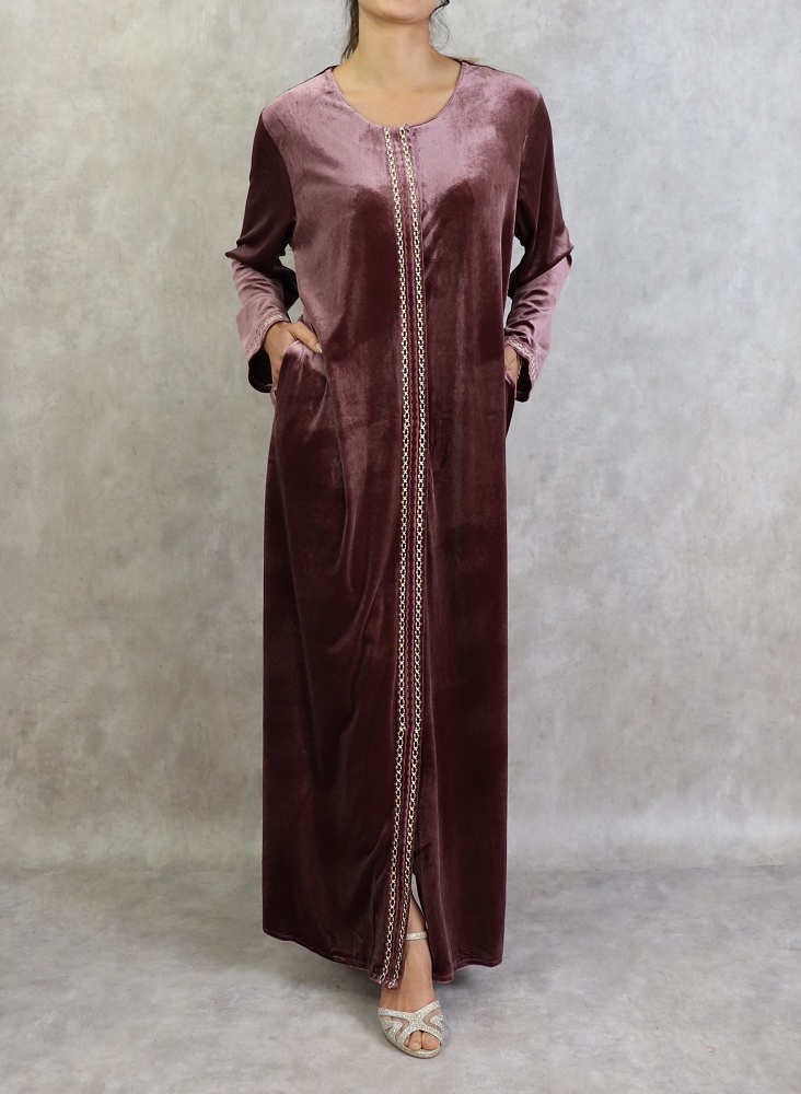 Robe longue, col dégagé, poches latérales, fermeture zip sur toute la longueur, broderies sur le devant ainsi que sur les poignets, tissu doux et fluide, effet velours, coupe droite.
