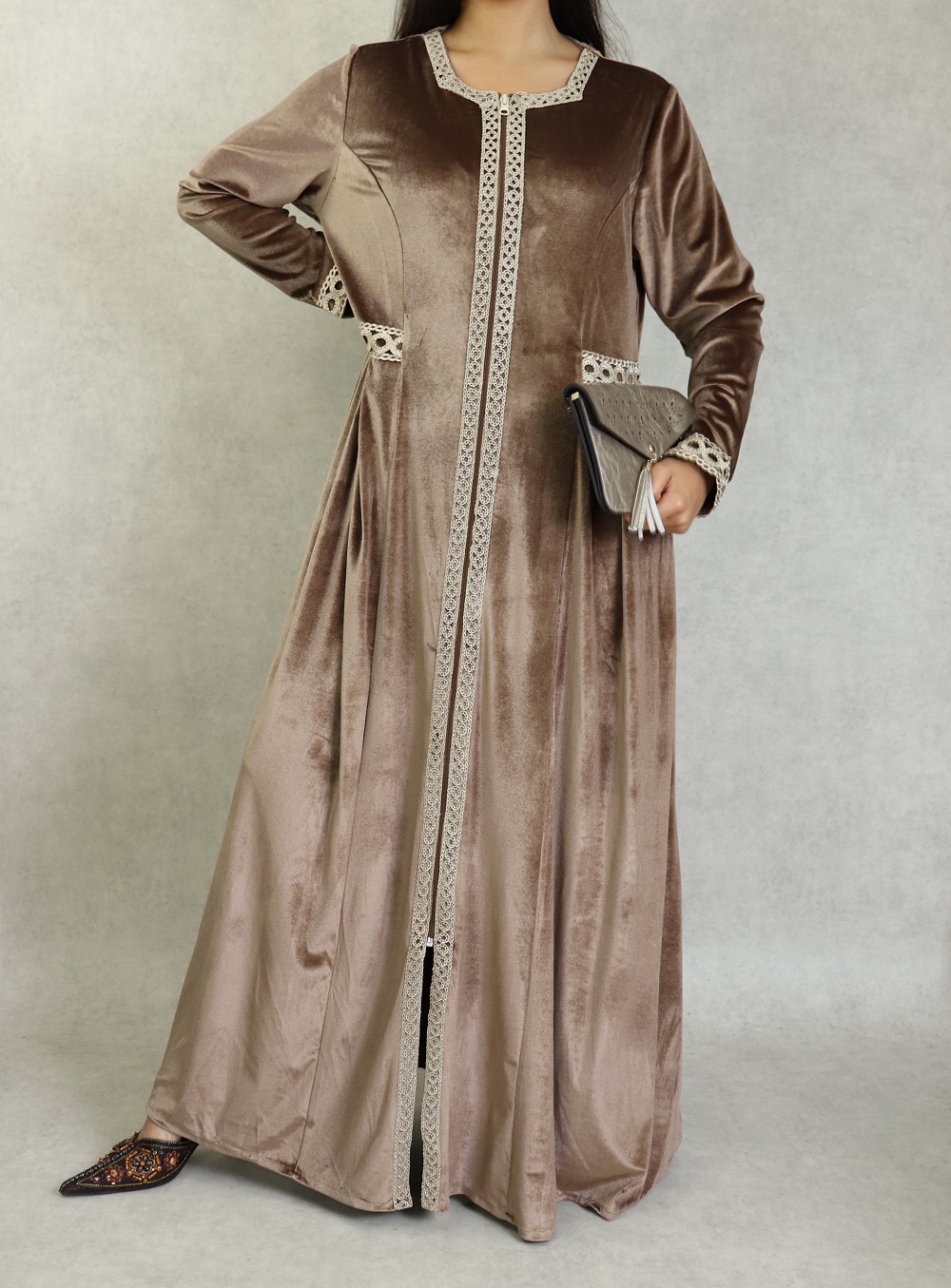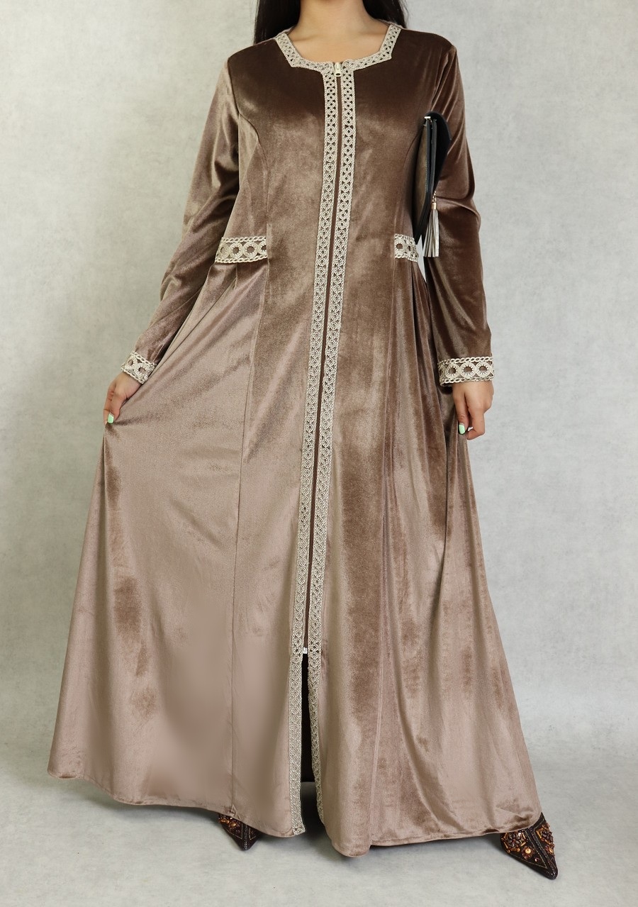Robe longue, encolure en cœur, fermeture zip sur toute la longueur, broderies sur le devant et sur la taille ainsi que sur les poignets, tissu extensible et fluide, effet velours très doux, coupe évasée.