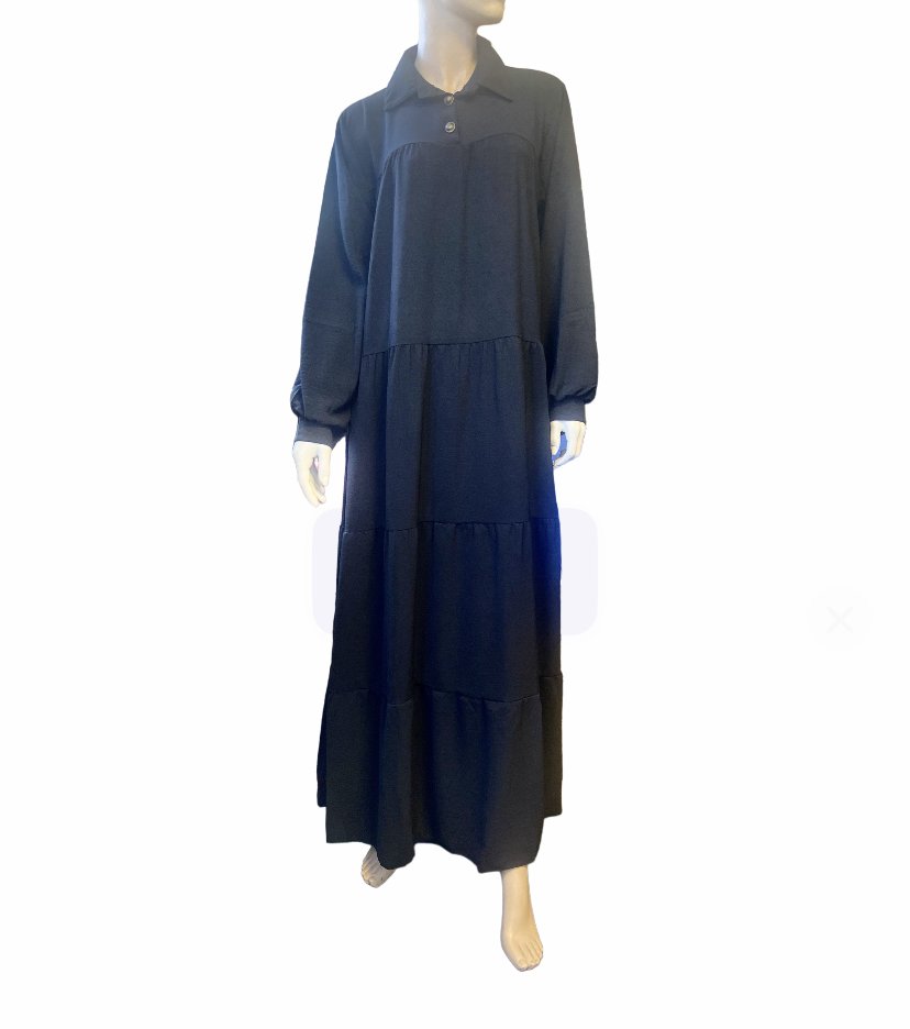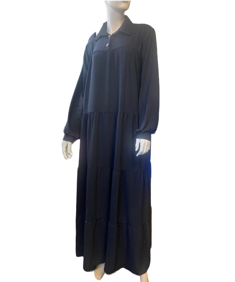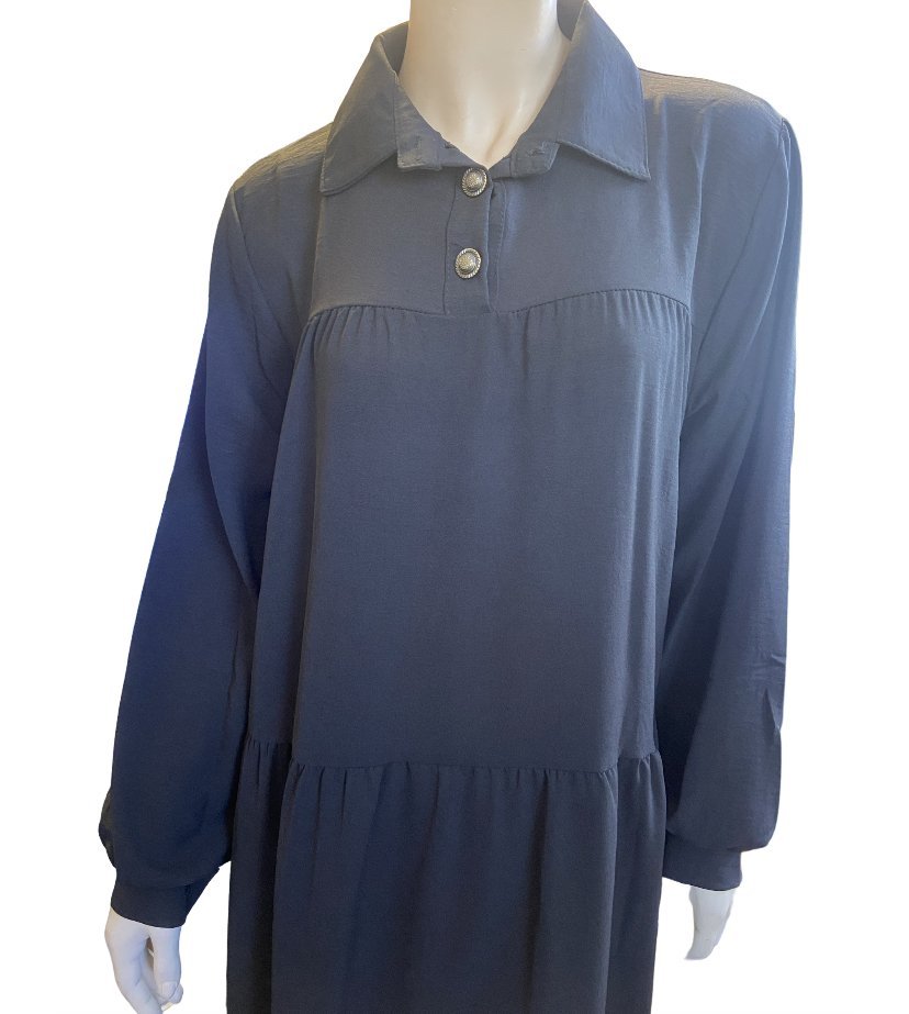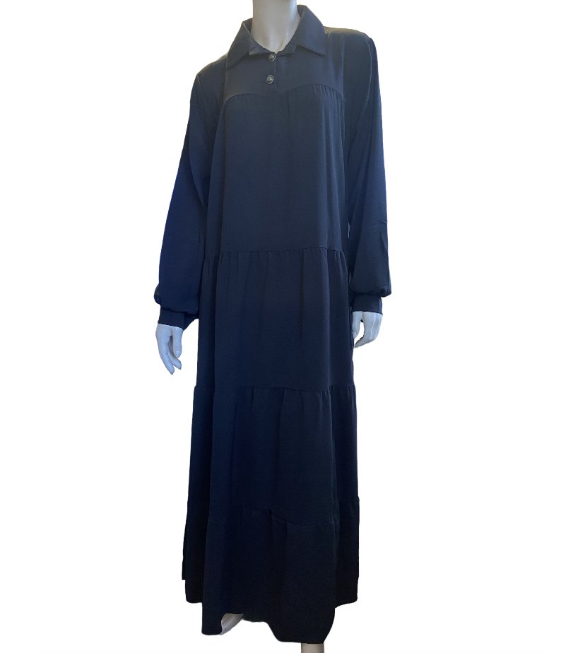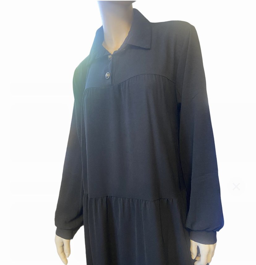 Robe longue et évasée en tissu fluide, avec des boutons au col et aux manches.