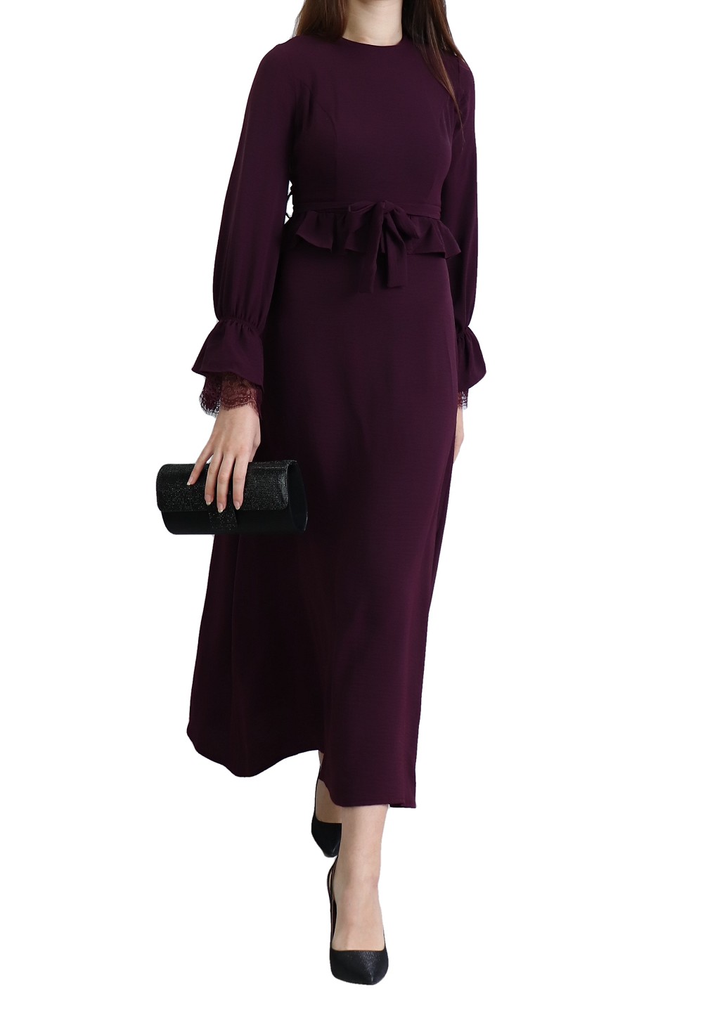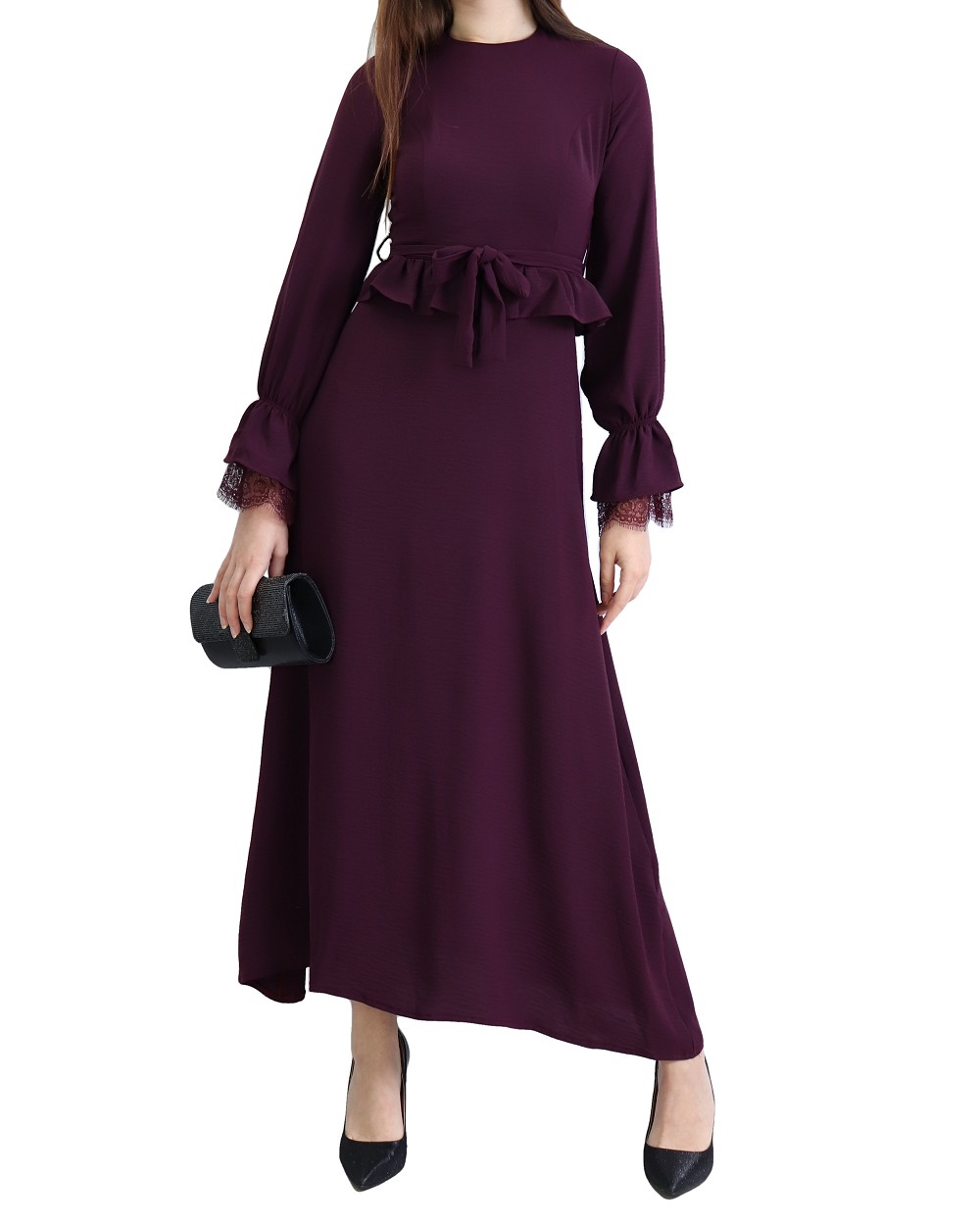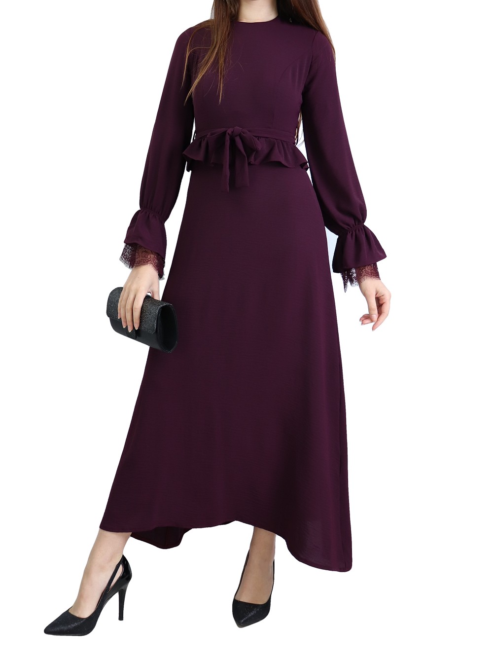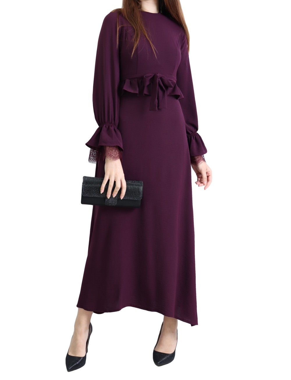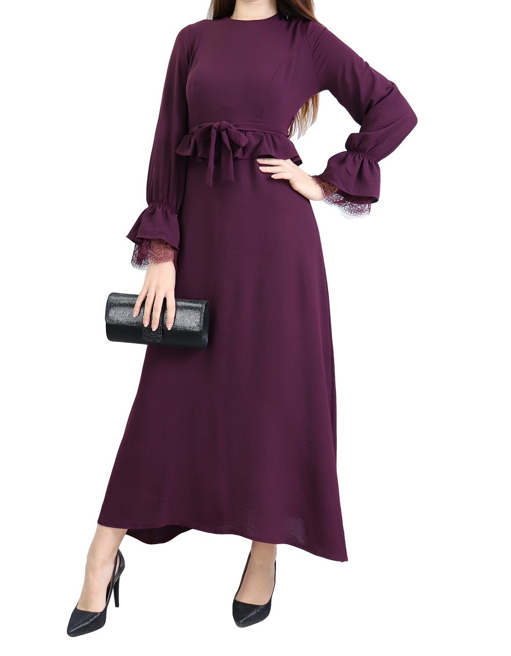 Robe longue évasée fluide et chic à volants pour femme - Couleur Aubergine Vetement & Accessoire
