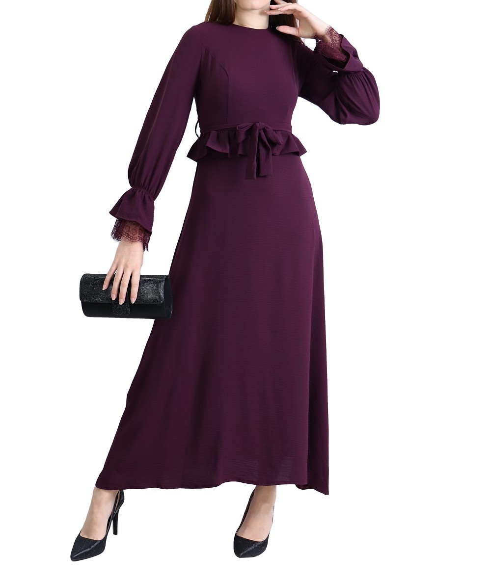 Robe longue evasee fluide et chic a volants pour femme - Couleur Aubergine