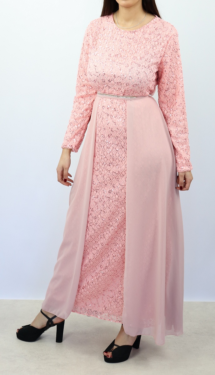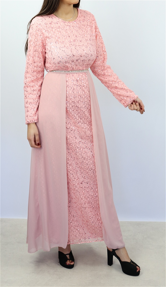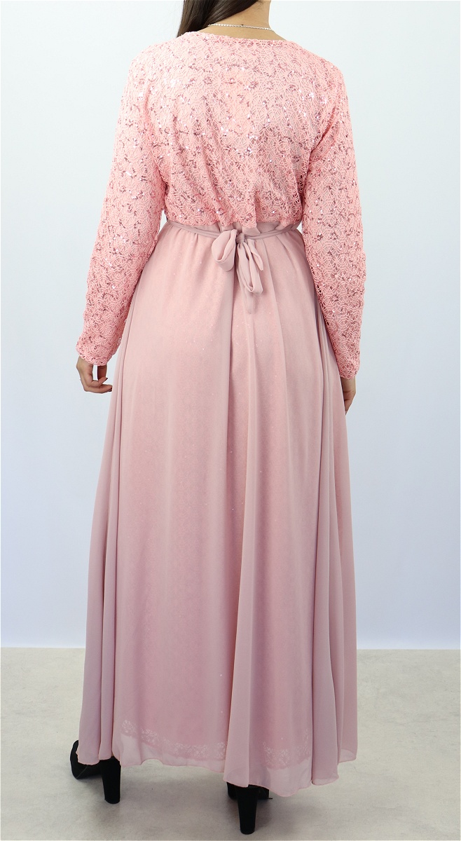 Robe longue évasée pailletée avec doublure et ceinture couleur rose clair Vetement & Accessoire