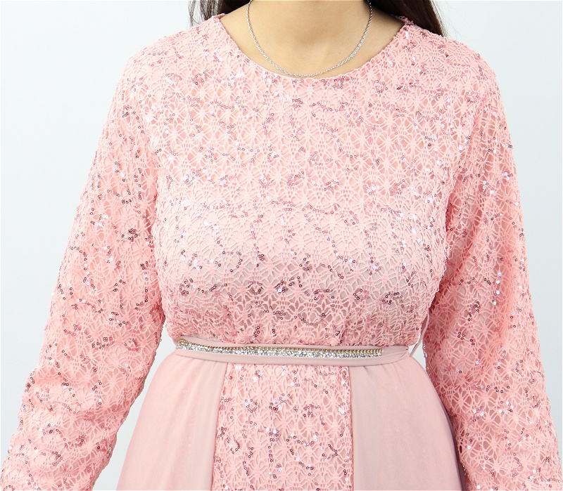 Robe longue evasee pailletee avec doublure et ceinture couleur rose clair