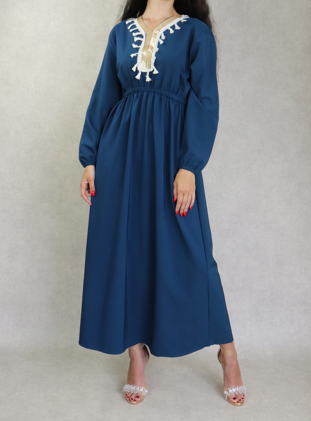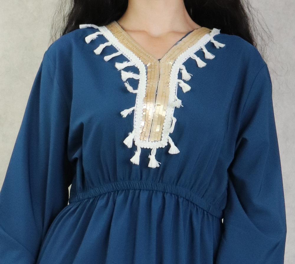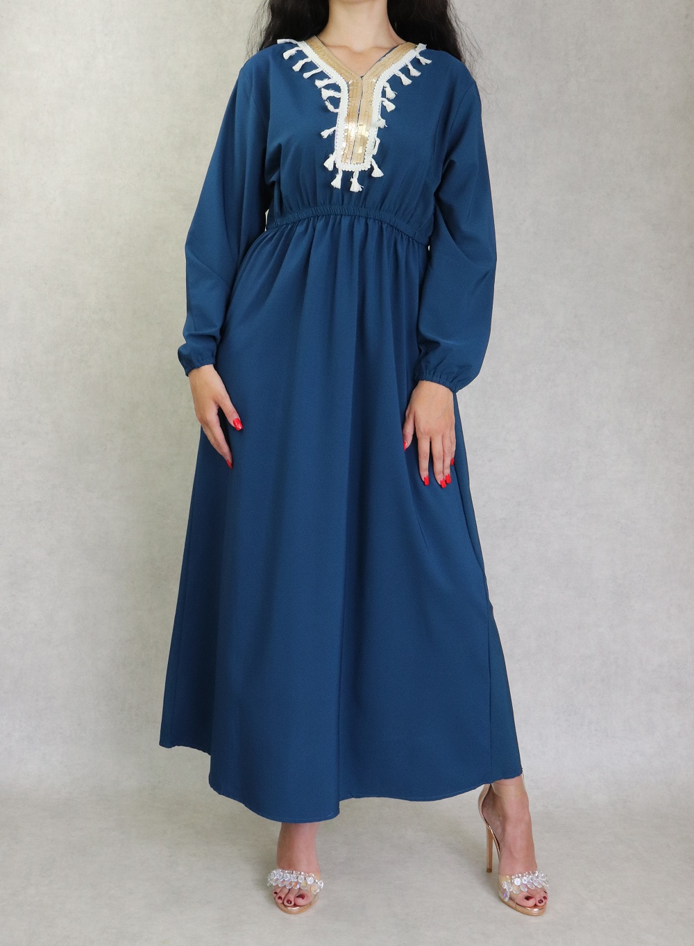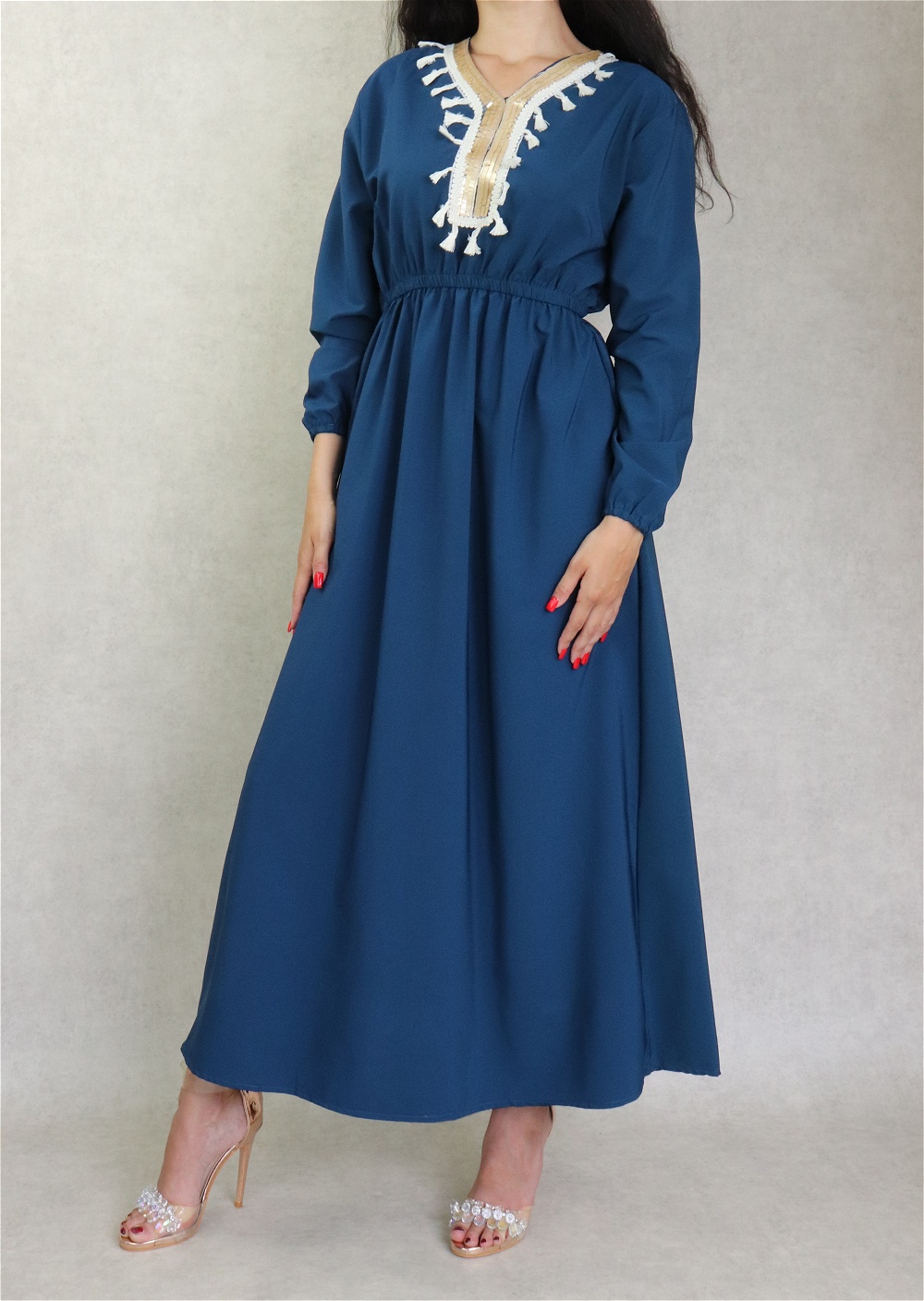 Robe longue féminine avec décoration écailles dorées et pompons - Couleur Bleu Vetement & Accessoire