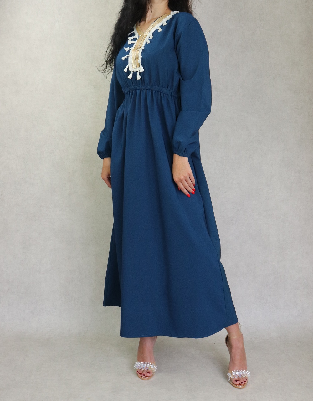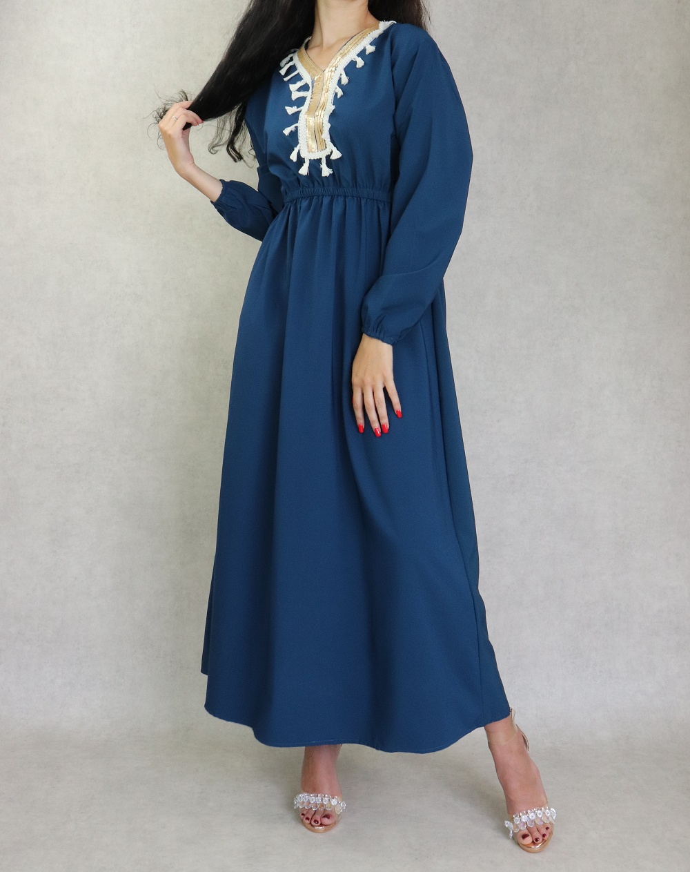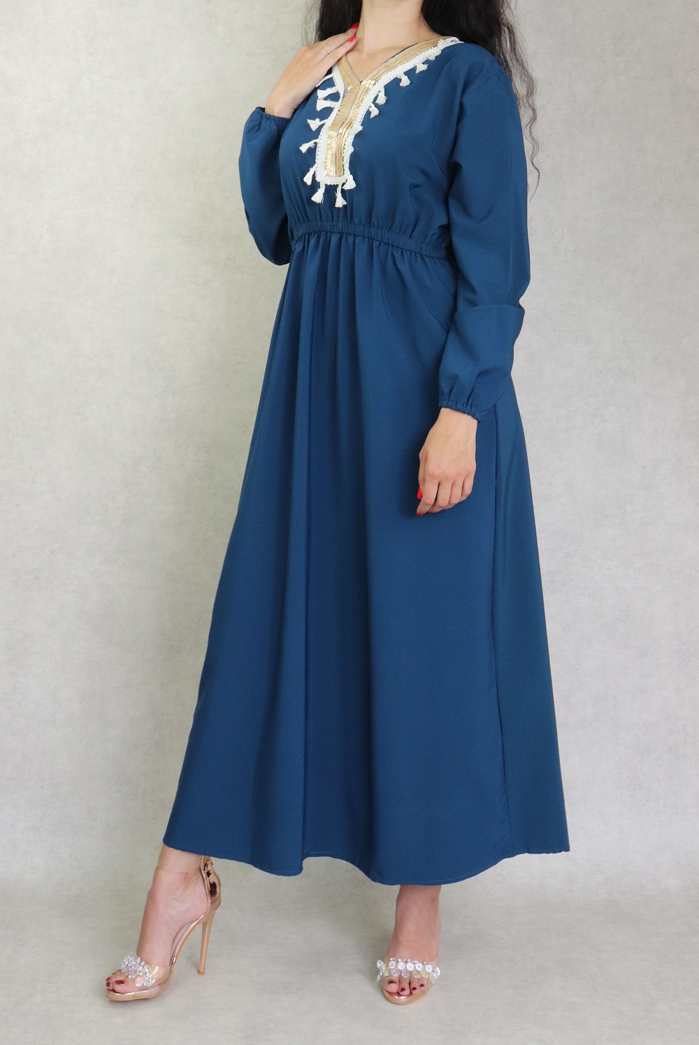 Robe longue féminine avec décoration écailles dorées et pompons - Couleur Bleu Vetement & Accessoire