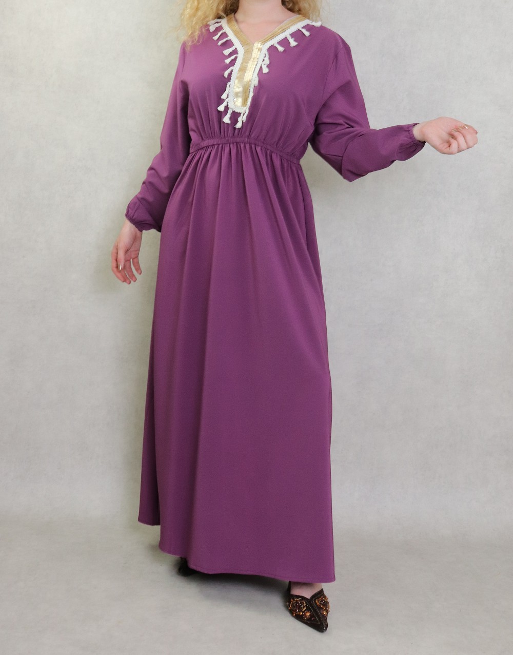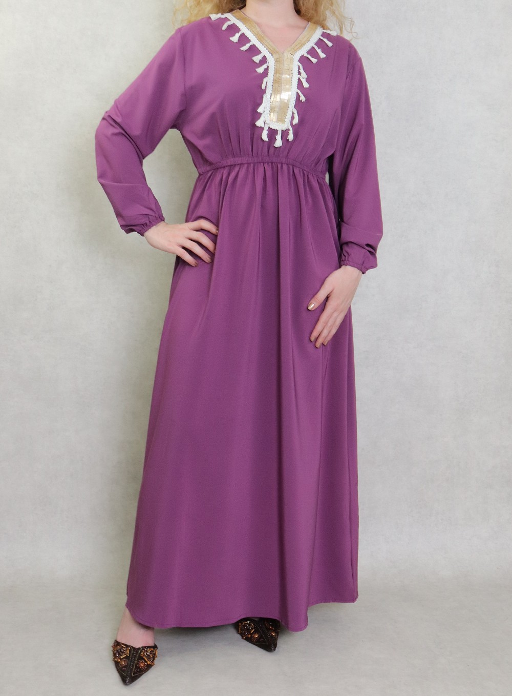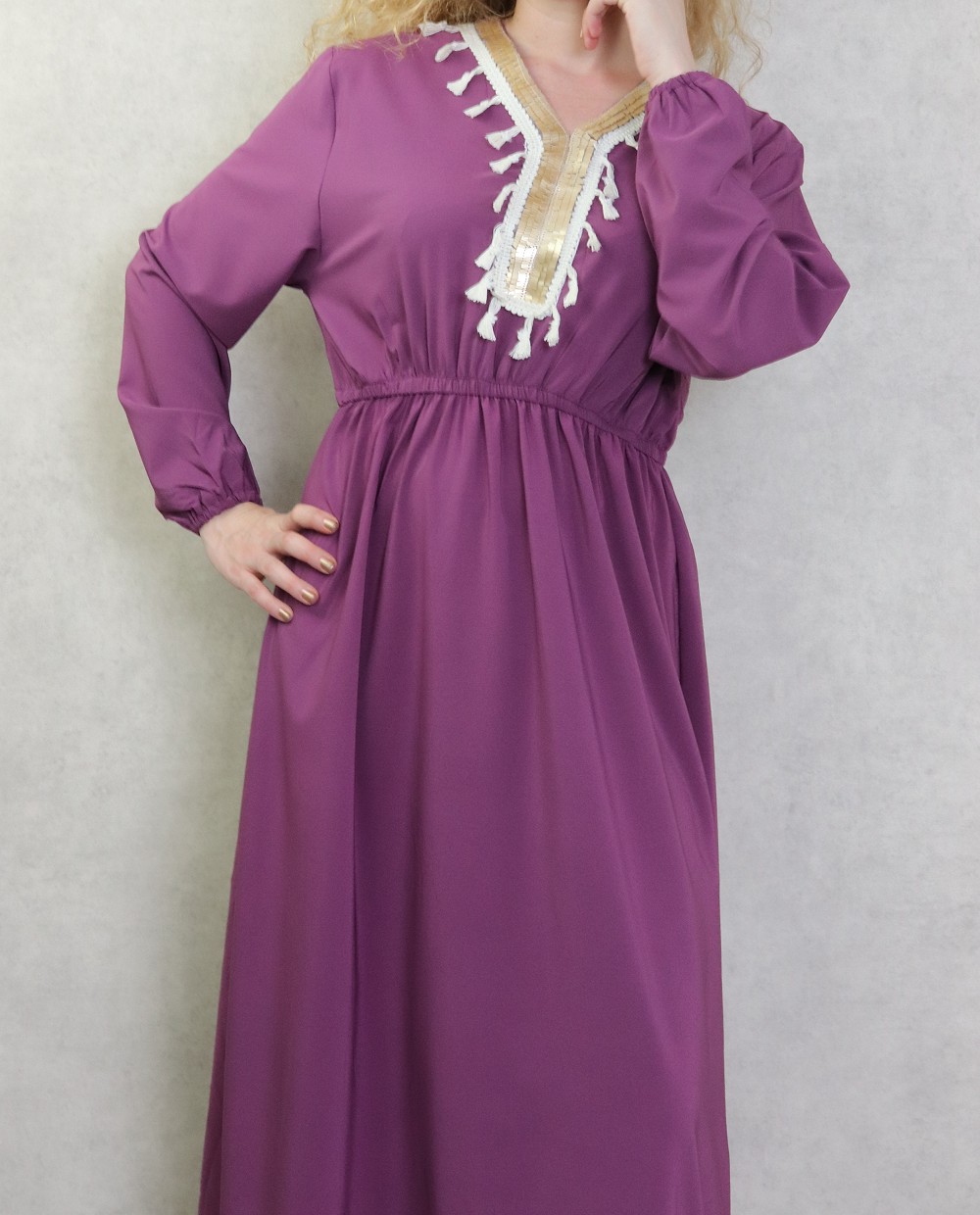 Robe longue féminine avec décoration écailles dorées et pompons - Couleur violet Vetement & Accessoire