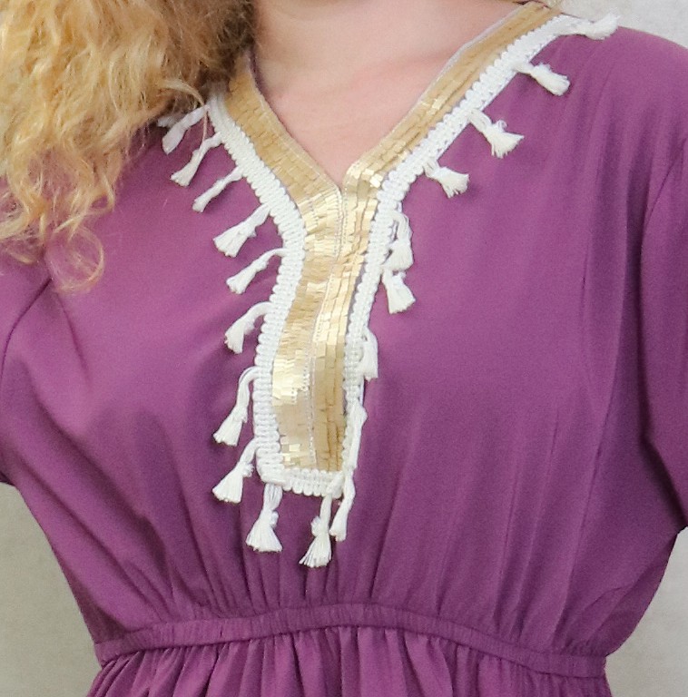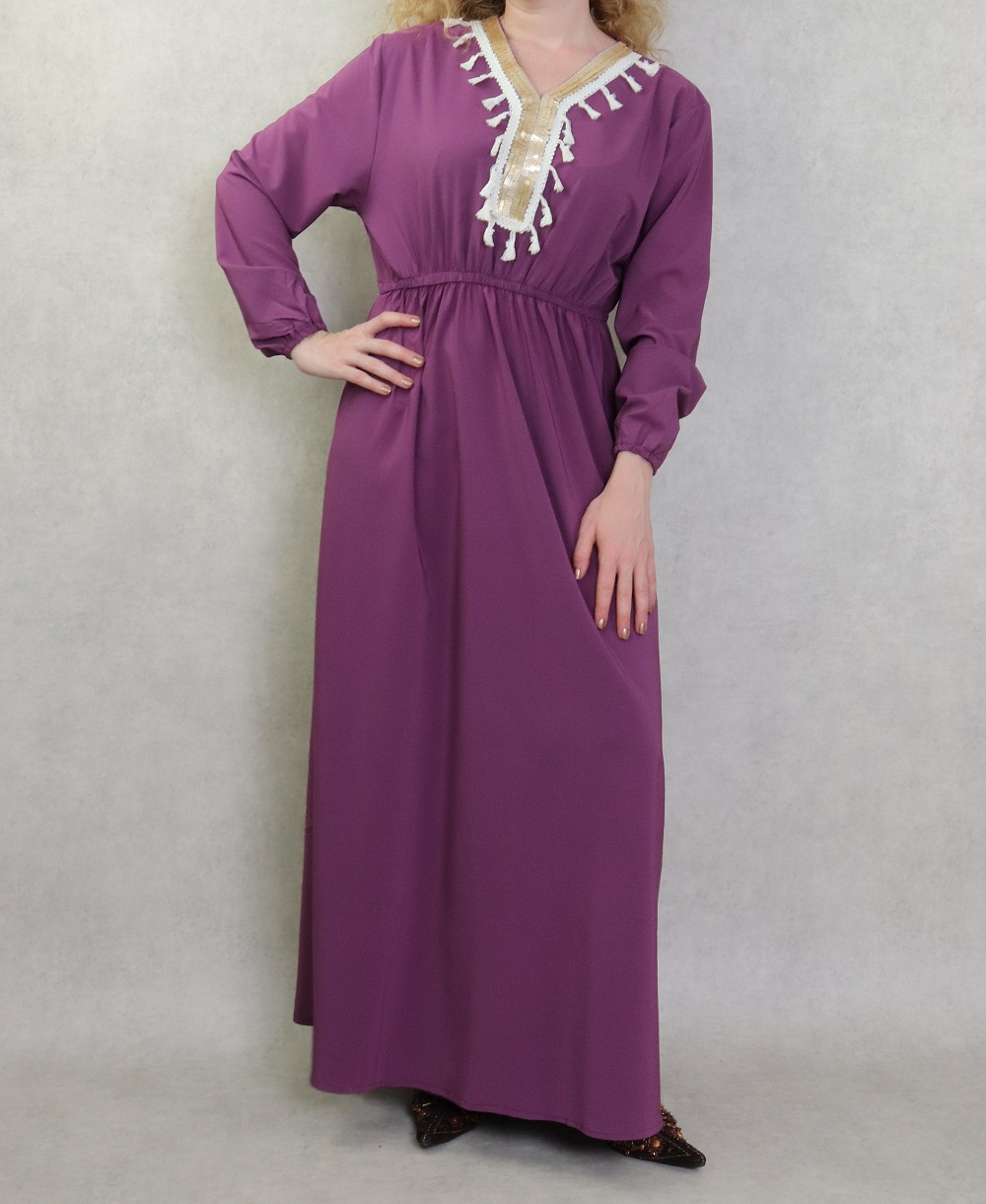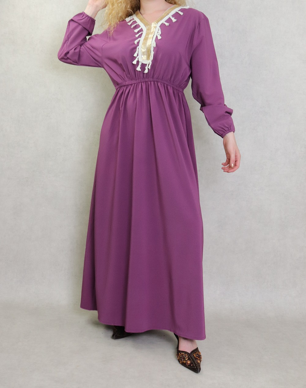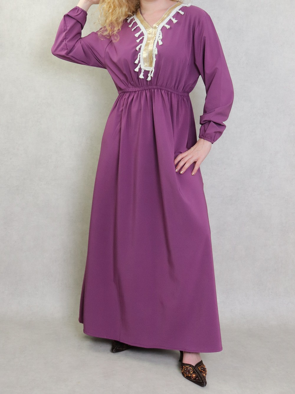 Robe longue féminine avec décoration écailles dorées et pompons - Couleur violet Vetement & Accessoire