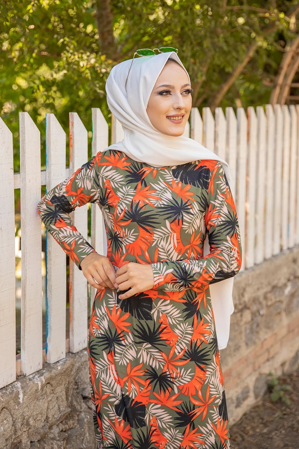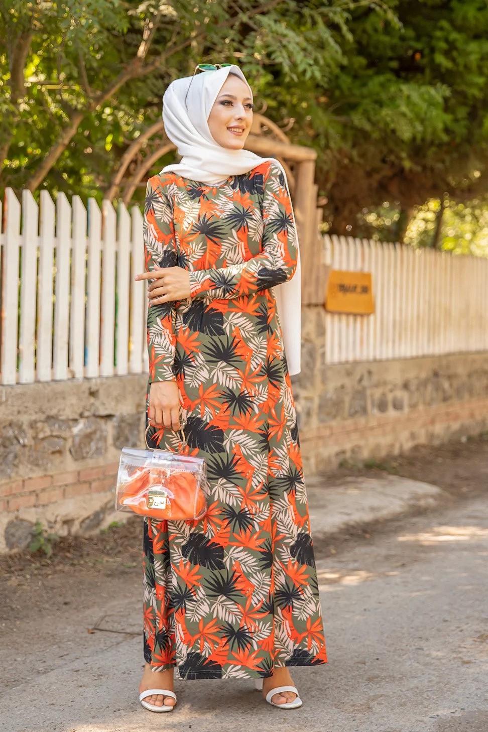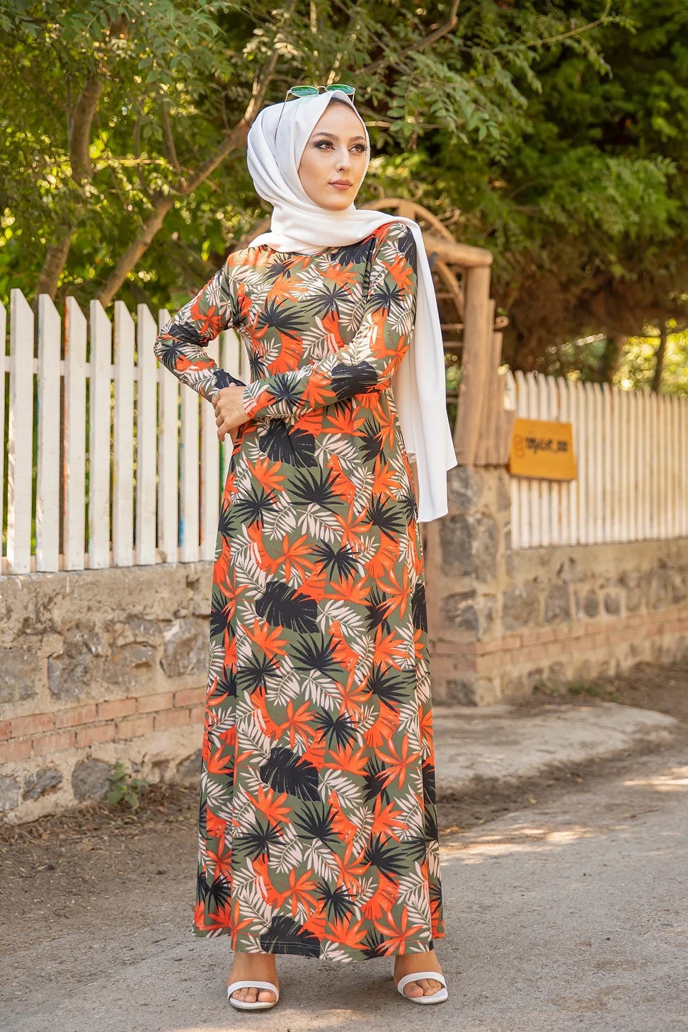 Robe longue fleurie coupe evasee pour femme (Mode Musulmane) - Couleur motifs kaki et orange