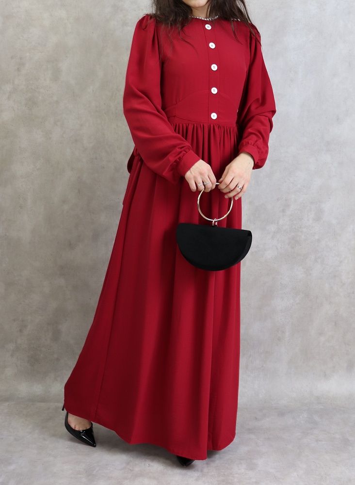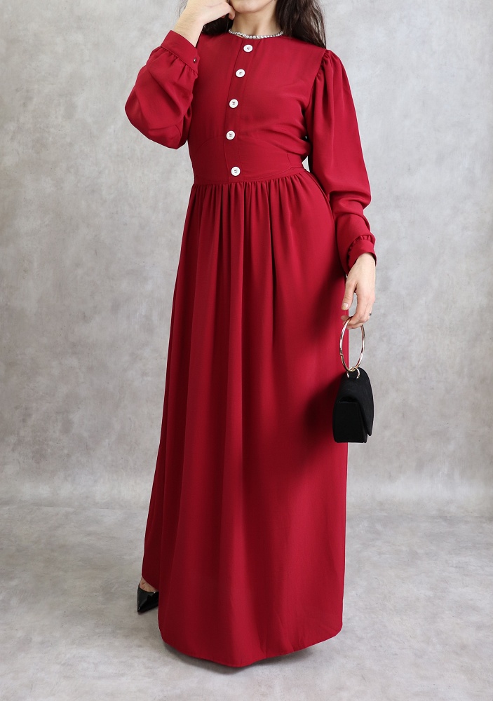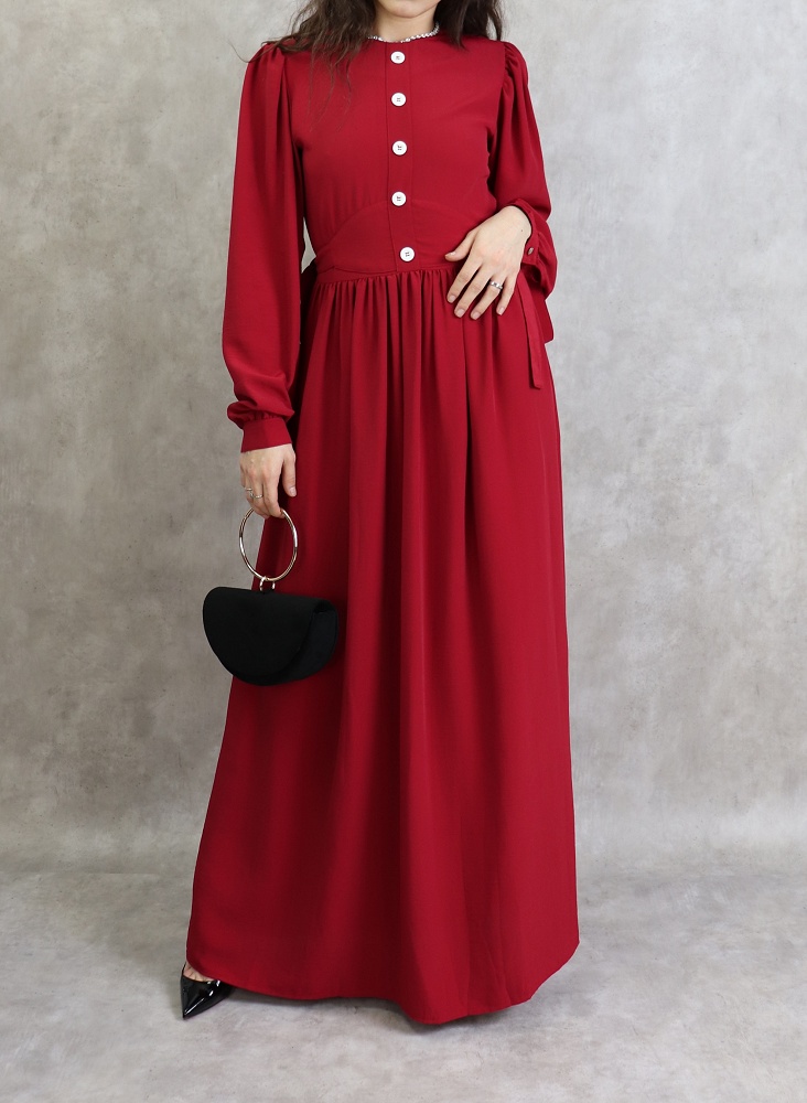 Robe longue, col rond, fermeture éclair dans le dos, manches longues finition bouton aux poignets, taille cintrée et froncée assortie de sa ceinture cousue qui peut s'attacher sur les côté, par derrière ou devant... Décoration boutons sur le buste. Coupe évasée sur le bas, tissu opaque et léger.