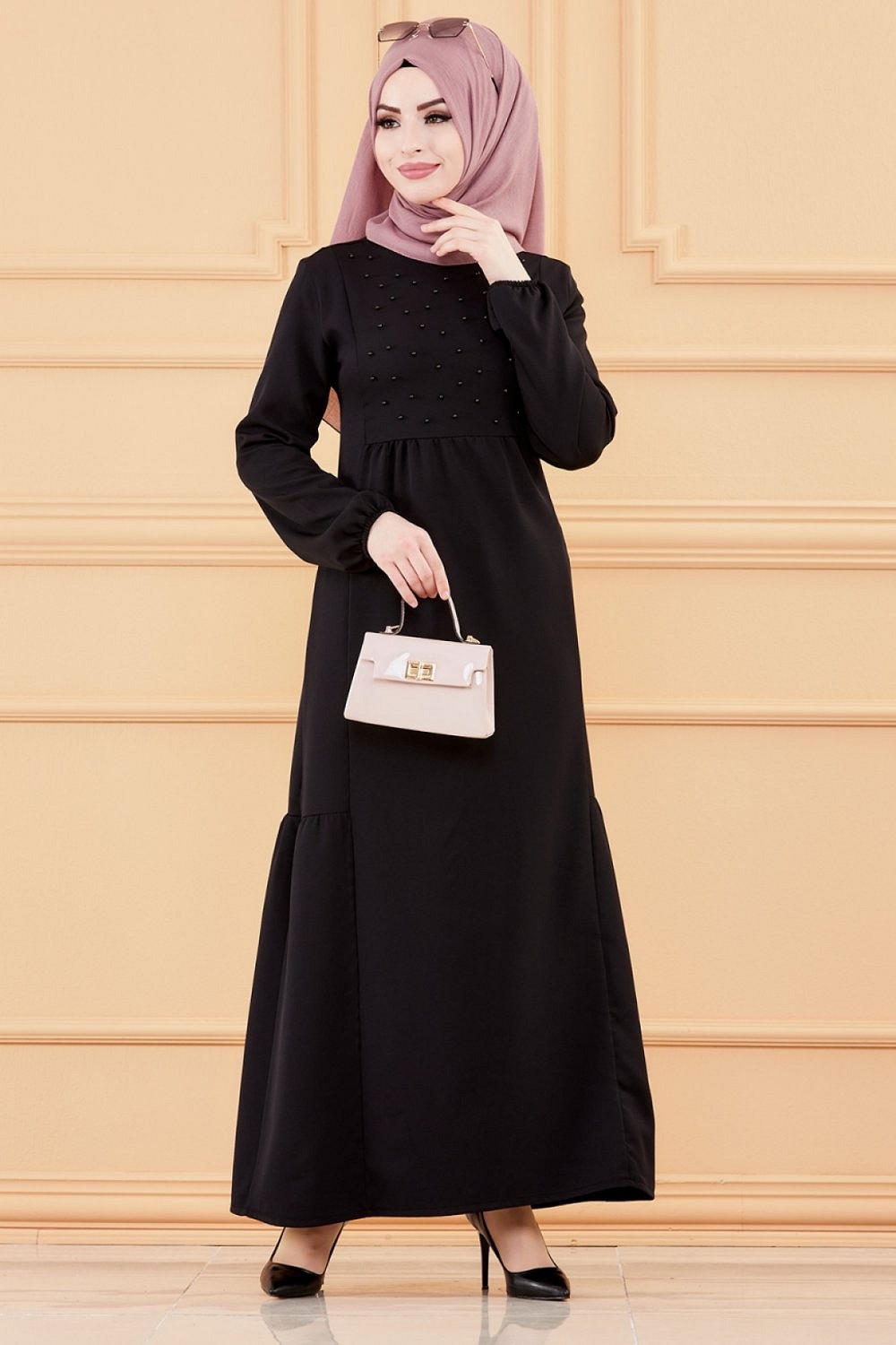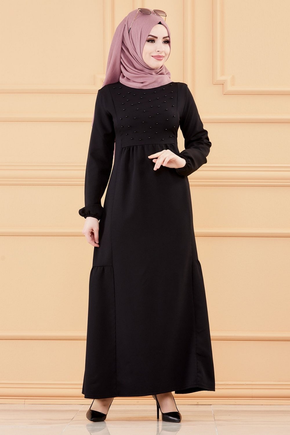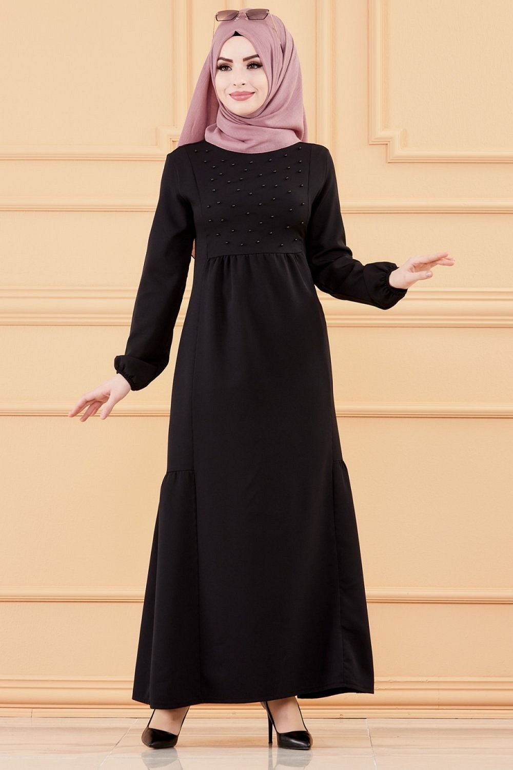 Robe longue habillee et chic avec perles (Vetement mastour classe pour femme voilee) - Couleur noir