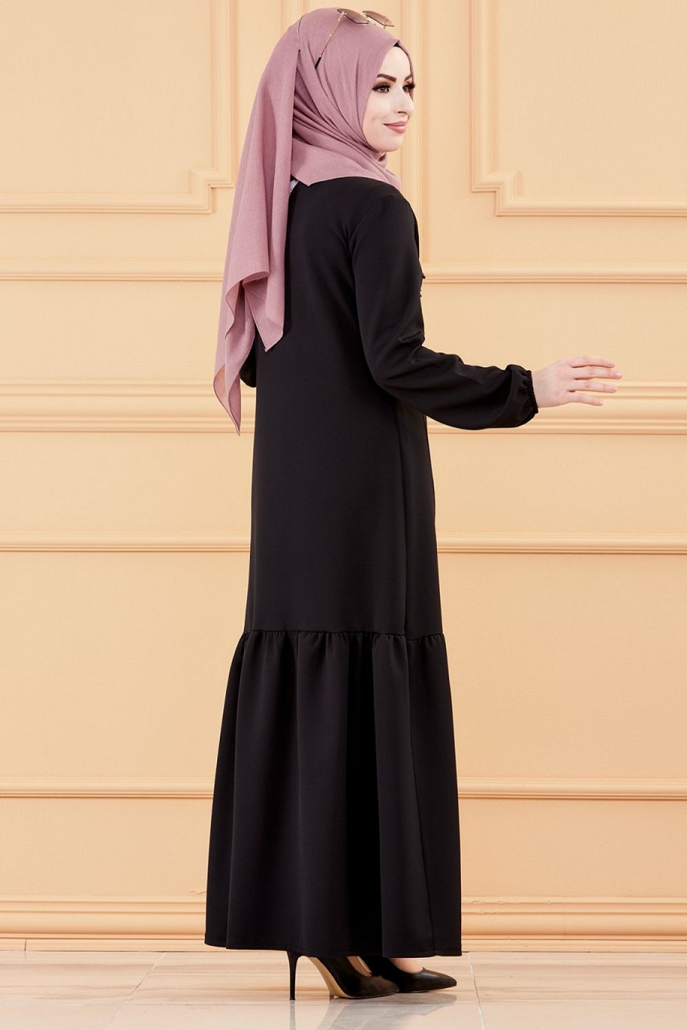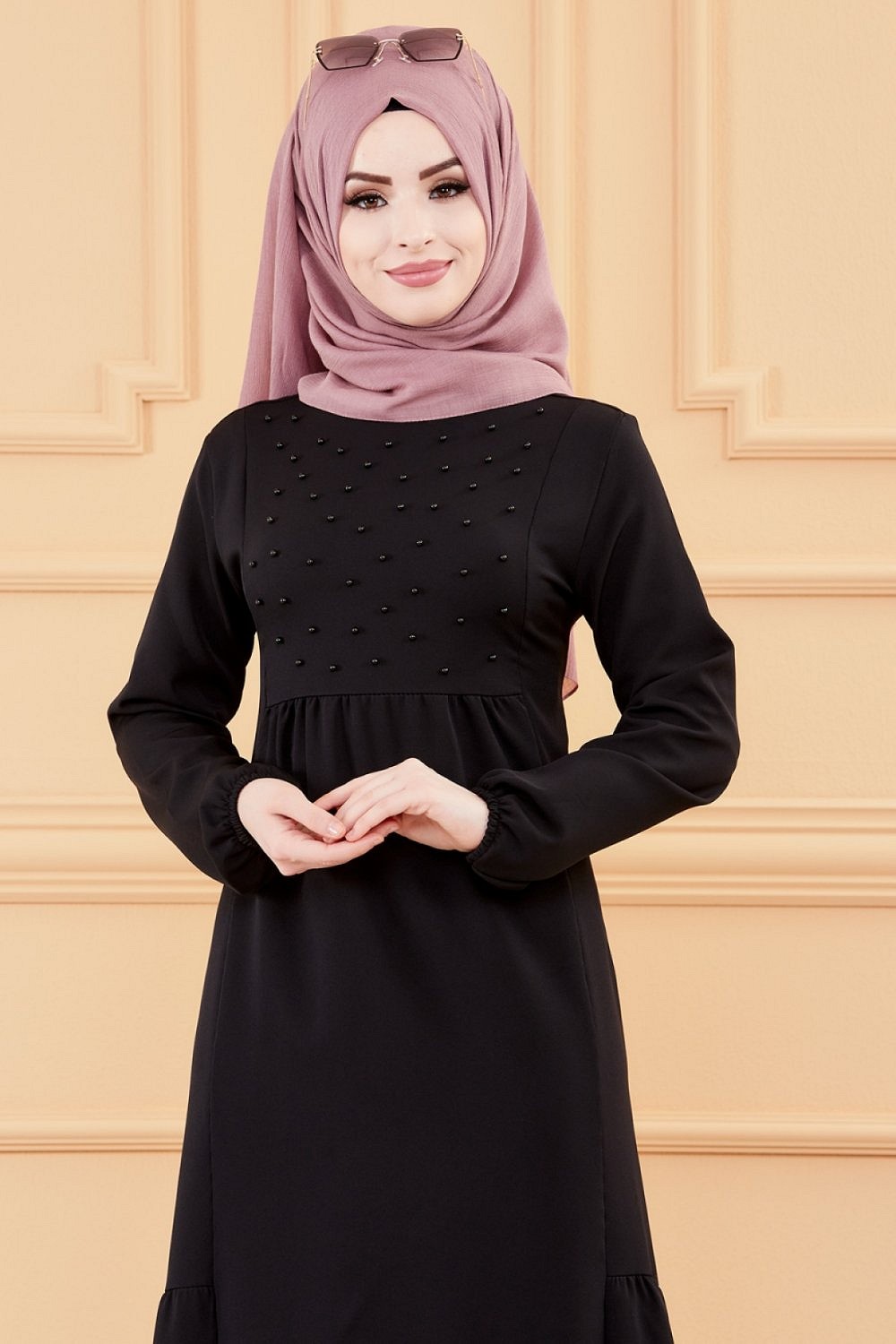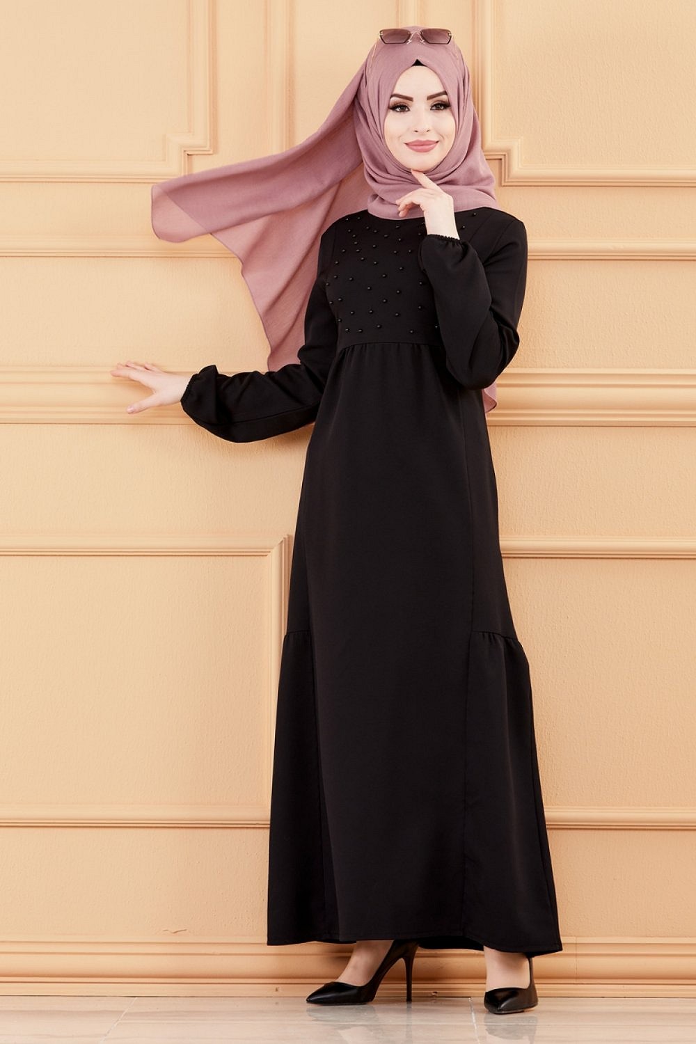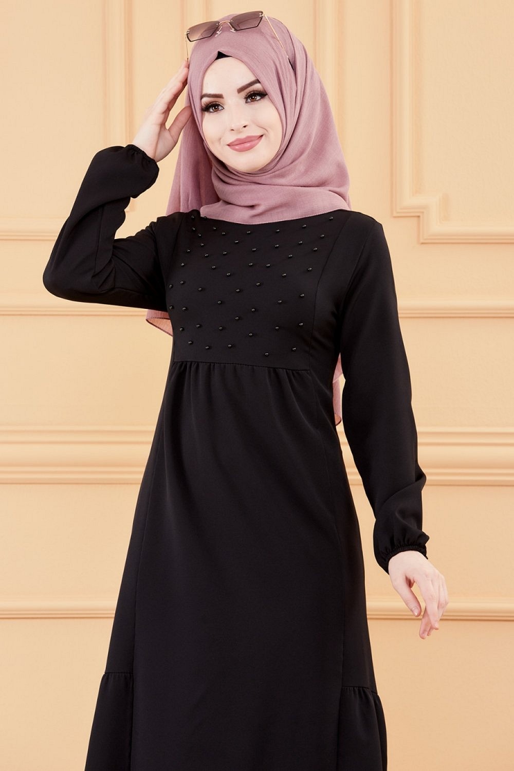 Robe longue habillee et chic avec perles (Vetement mastour classe pour femme voilee) - Couleur noir