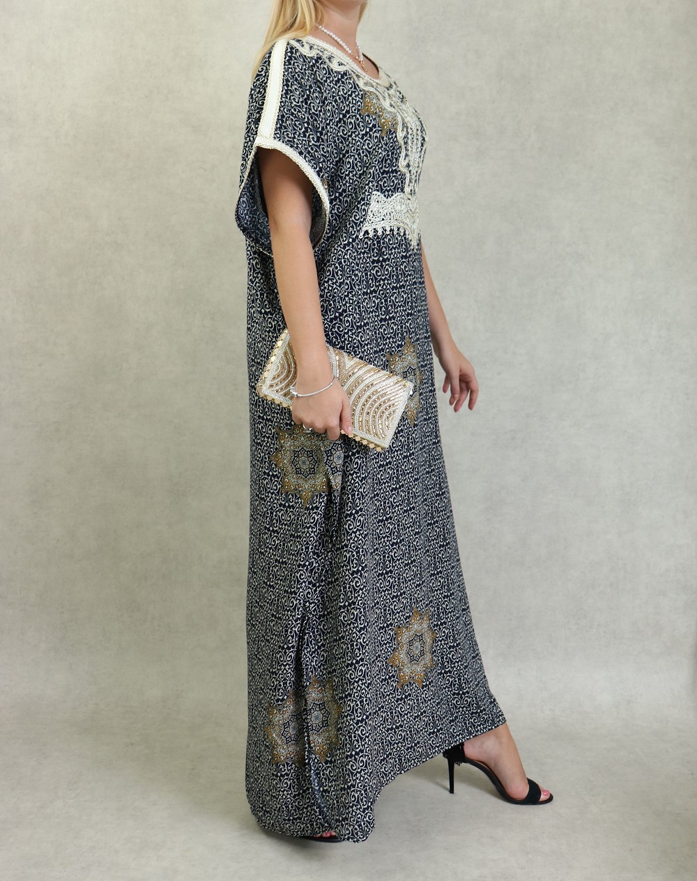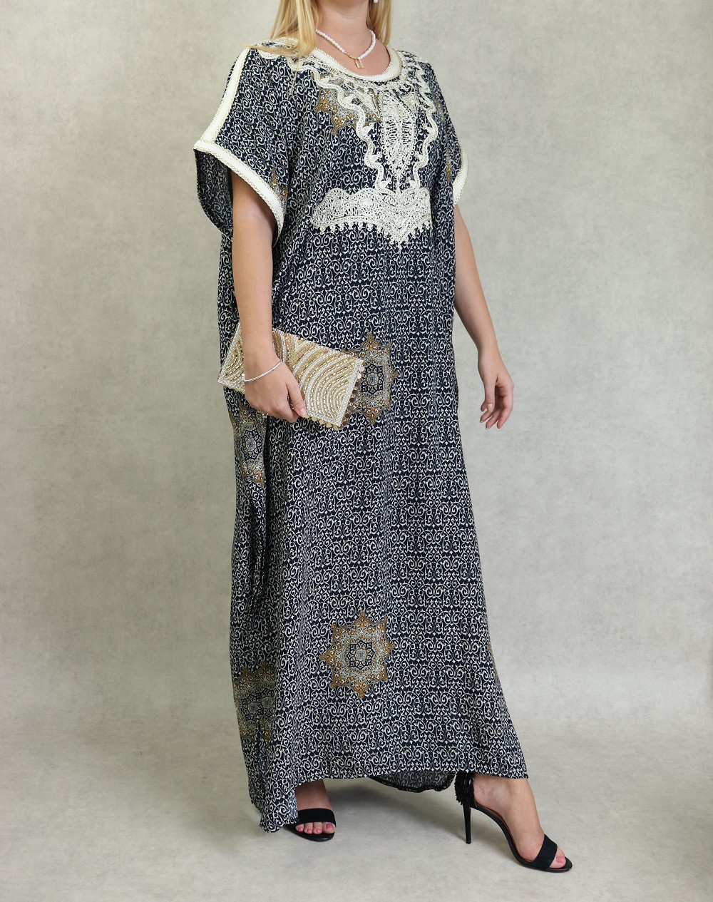 Robe longue imprimee a motif fleuri arabesque et broderie pour femme - Couleur Bleu nuit