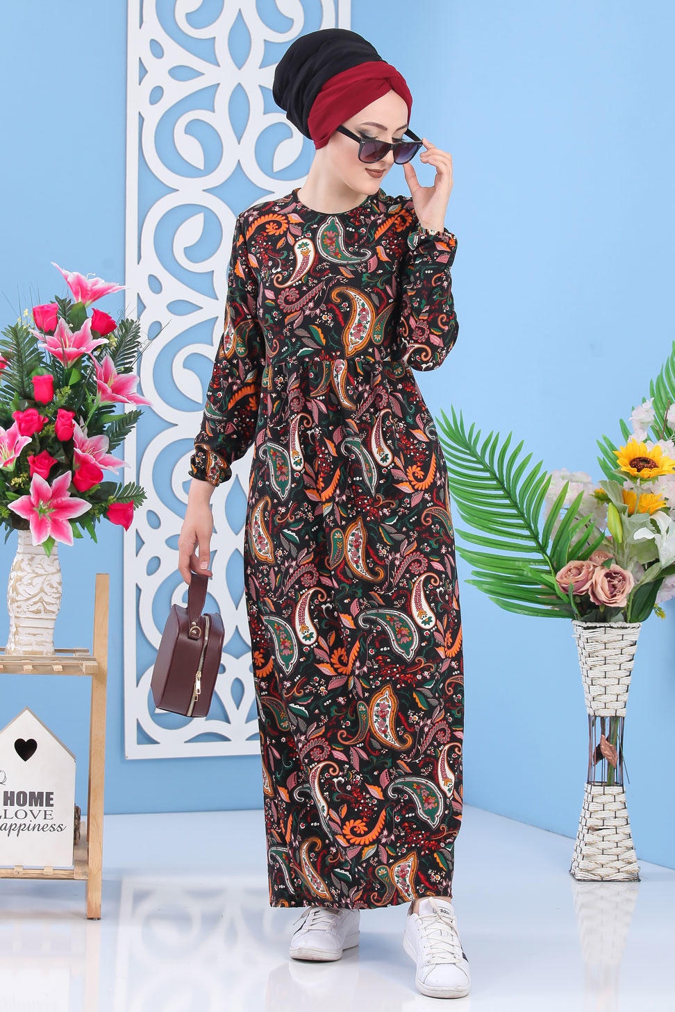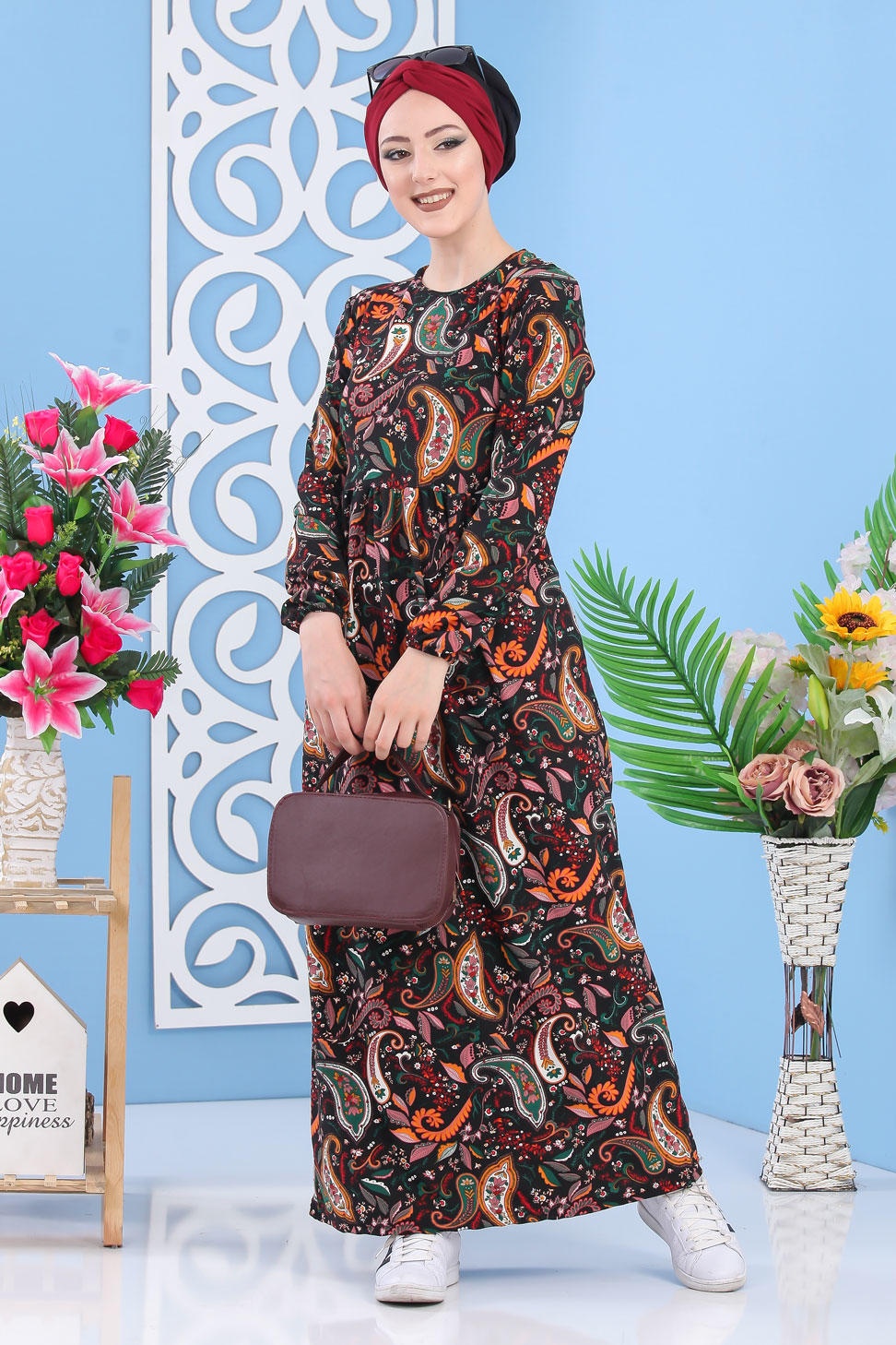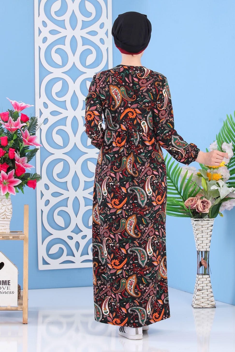 Robe longue, col rond, manches finition élastiques aux poignets, taille élastique, tissu fluide. Cette robe à imprimés "motifs cachemire" un style unique, oriental, tout simplement indémodable, il vous suffit de sélectionner votre taille habituelle.