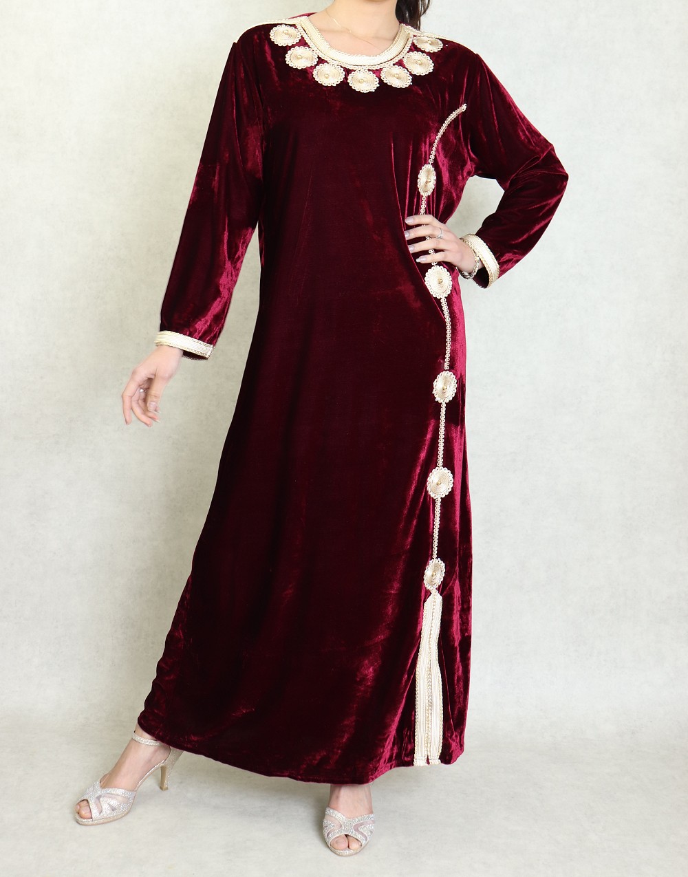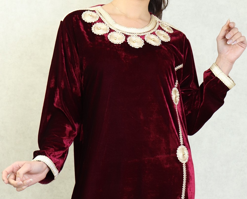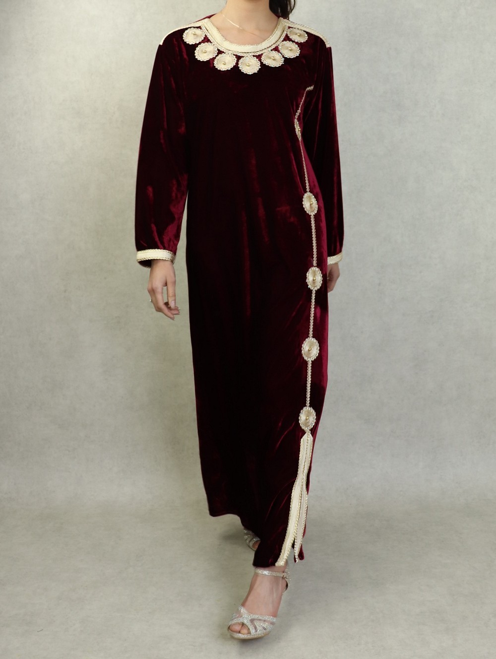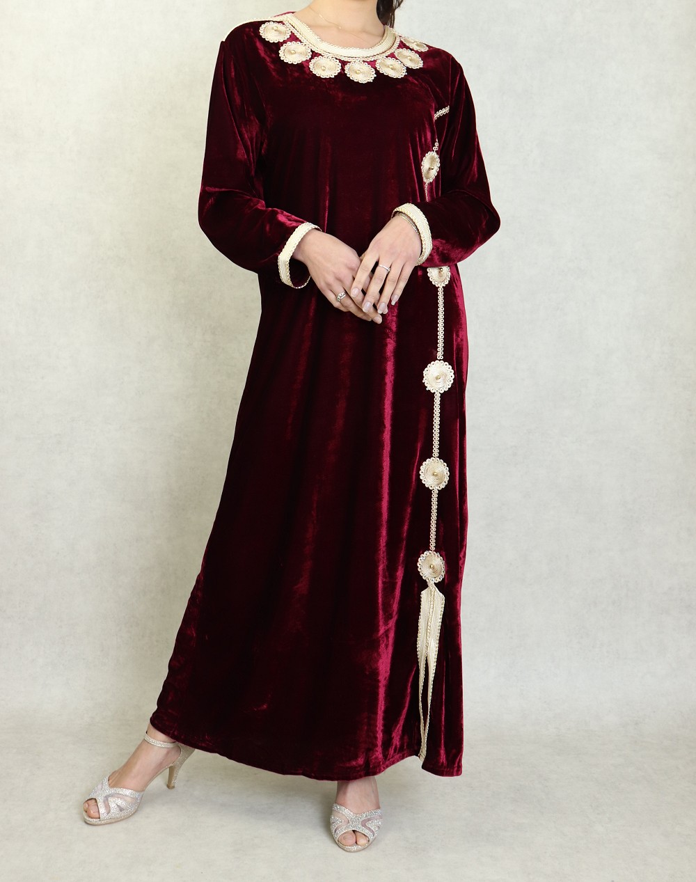 Robe longue orientale algérienne en velours brodée et perlée pour femme - Couleur Bordeaux Vetement & Accessoire