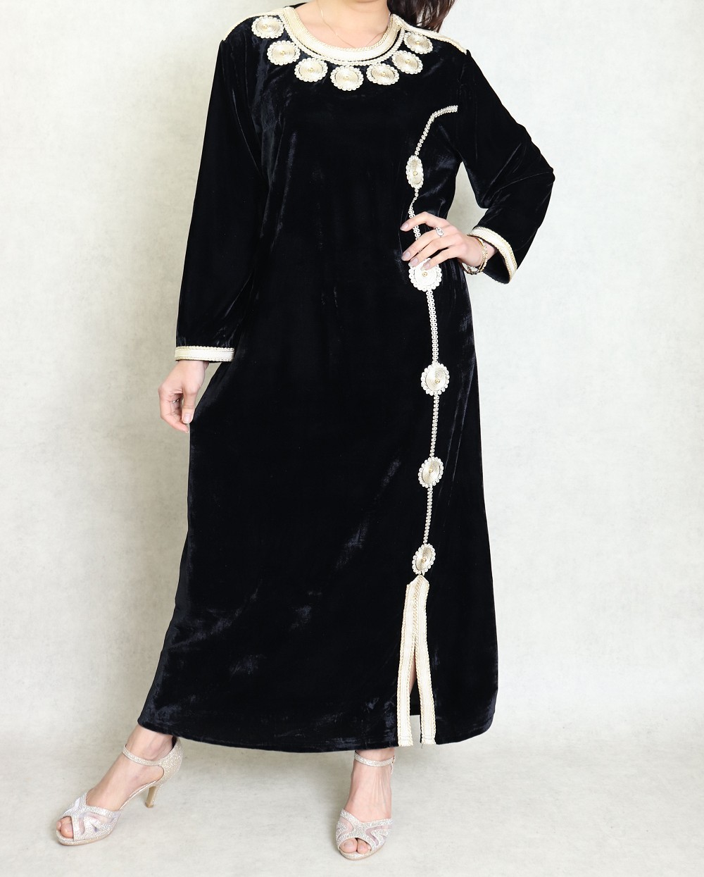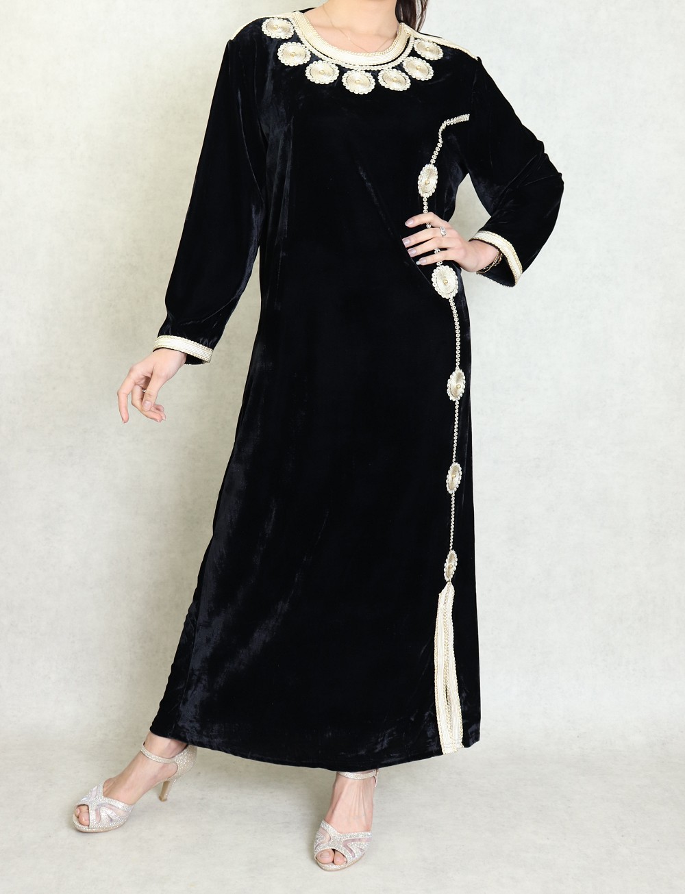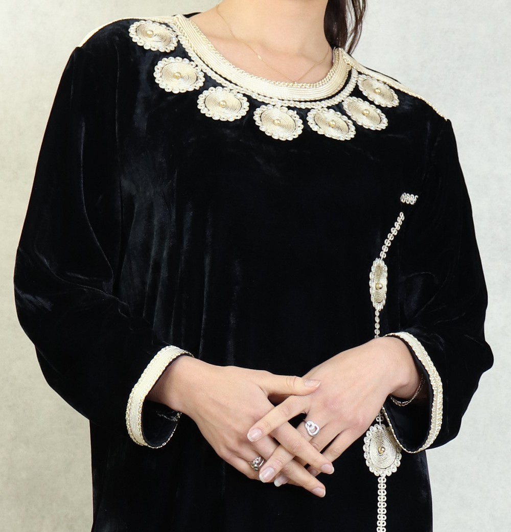 Belle robe en velours style oriental à manches longues avec broderies de qualité sur l'encolure et toute la longueur. Tenue sobre et élégante, parfaite pour occasions et événements.