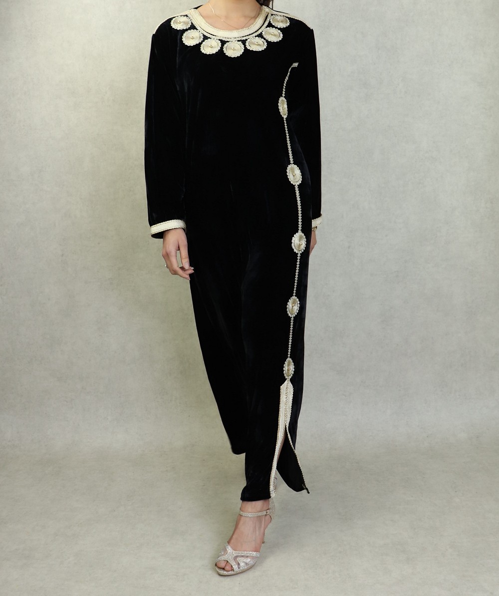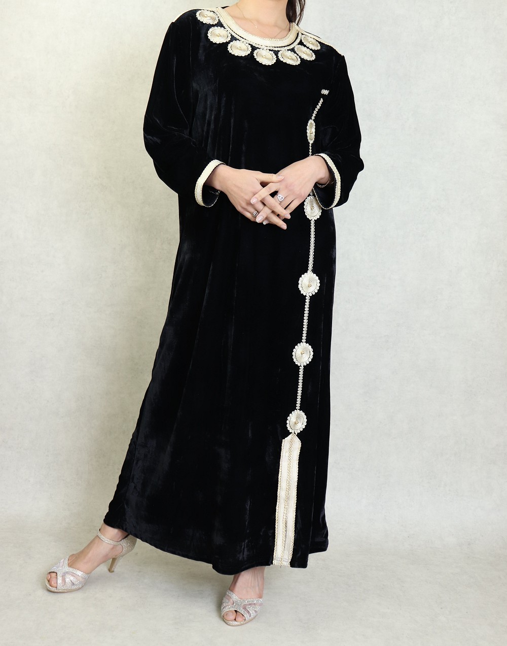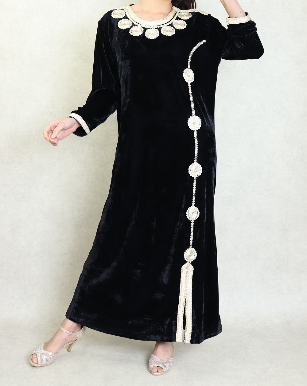 Belle robe en velours style oriental à manches longues avec broderies de qualité sur l'encolure et toute la longueur. Tenue sobre et élégante, parfaite pour occasions et événements.