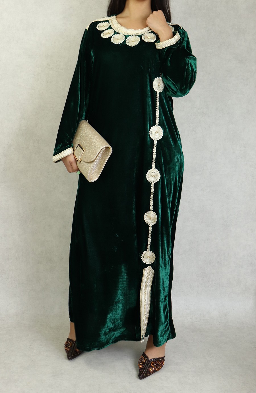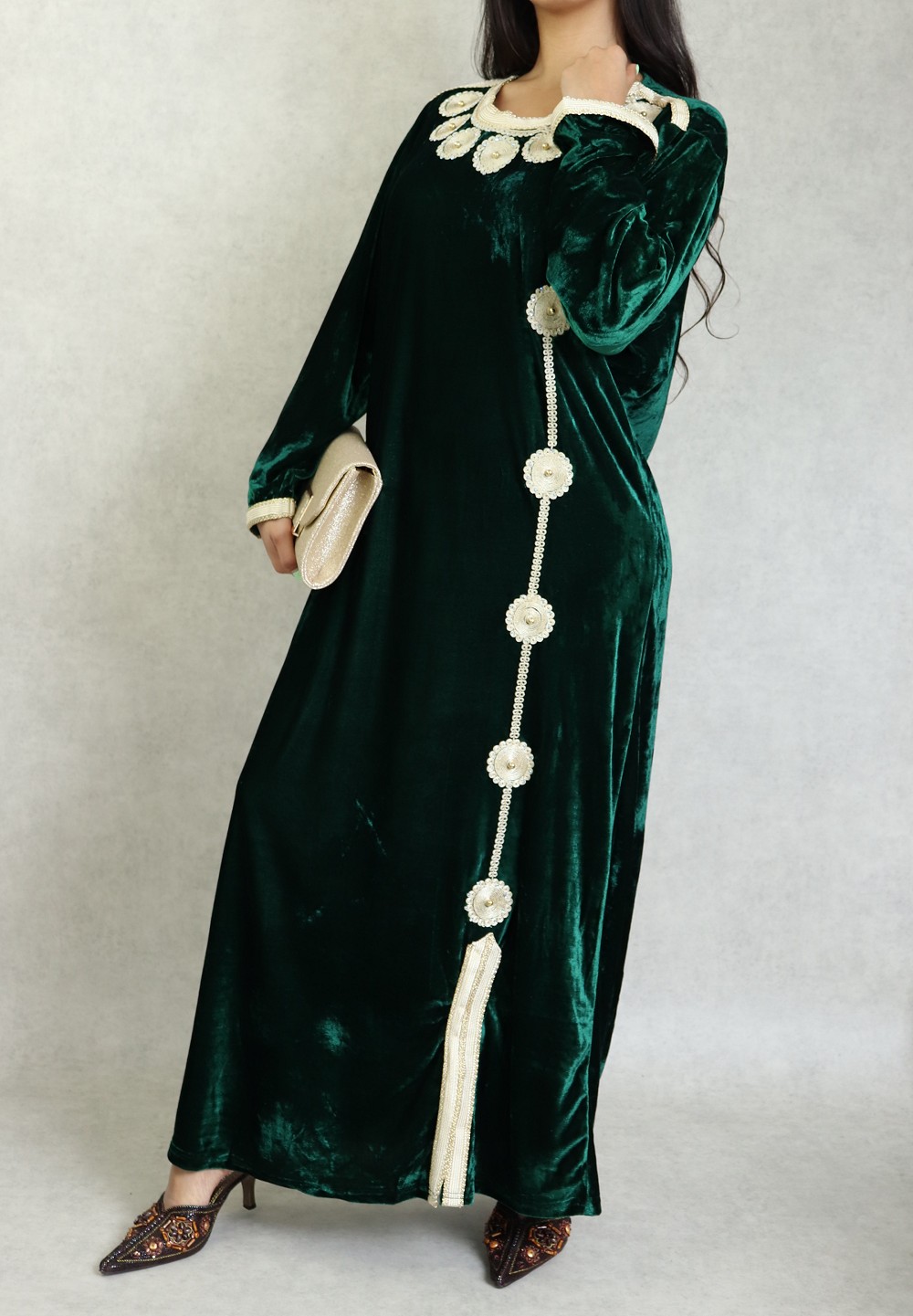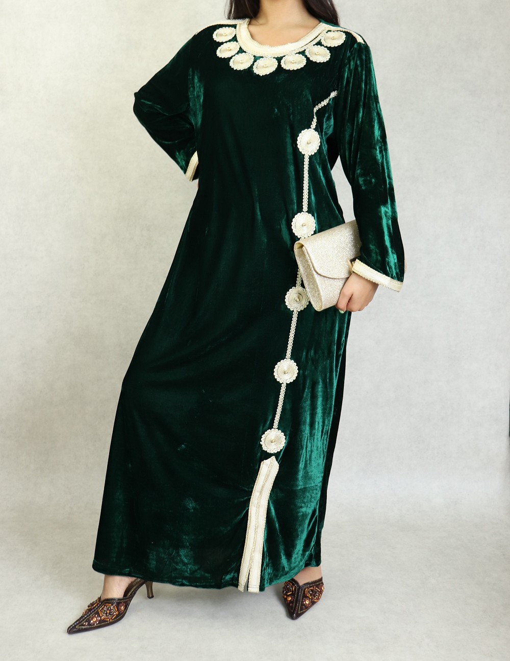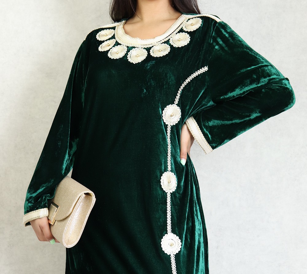 Belle robe en velours style oriental à manches longues avec broderies de qualité sur l'encolure et toute la longueur. Tenue sobre et élégante, parfaite pour occasions et événements.