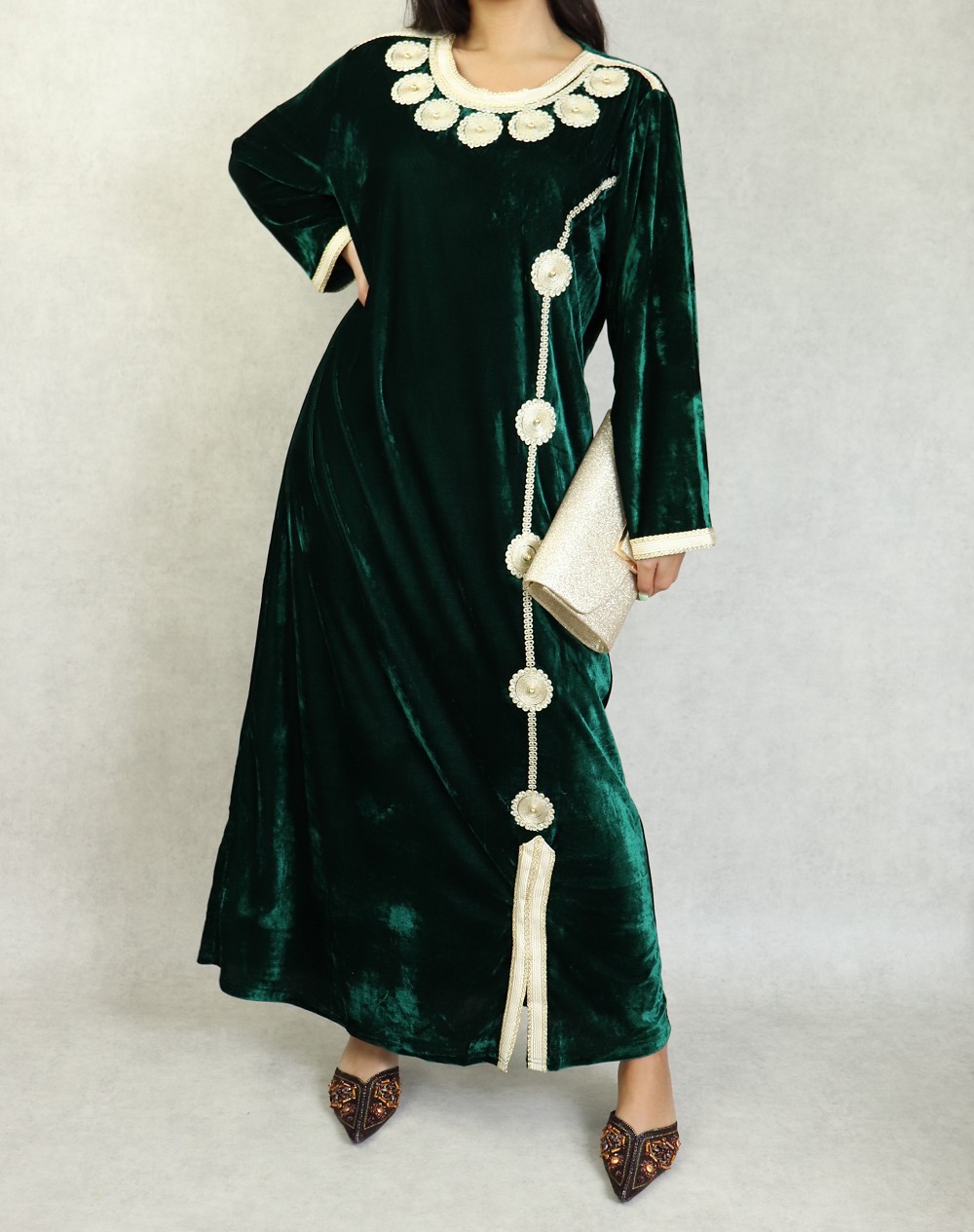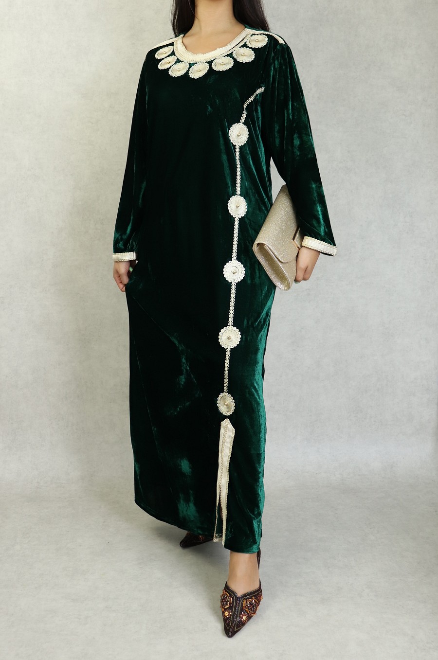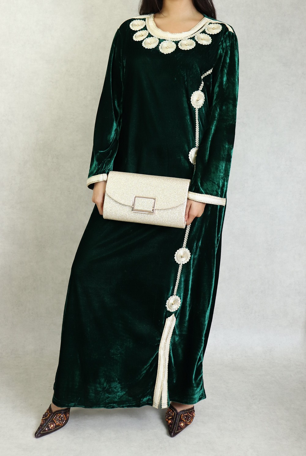 Belle robe en velours style oriental à manches longues avec broderies de qualité sur l'encolure et toute la longueur. Tenue sobre et élégante, parfaite pour occasions et événements.