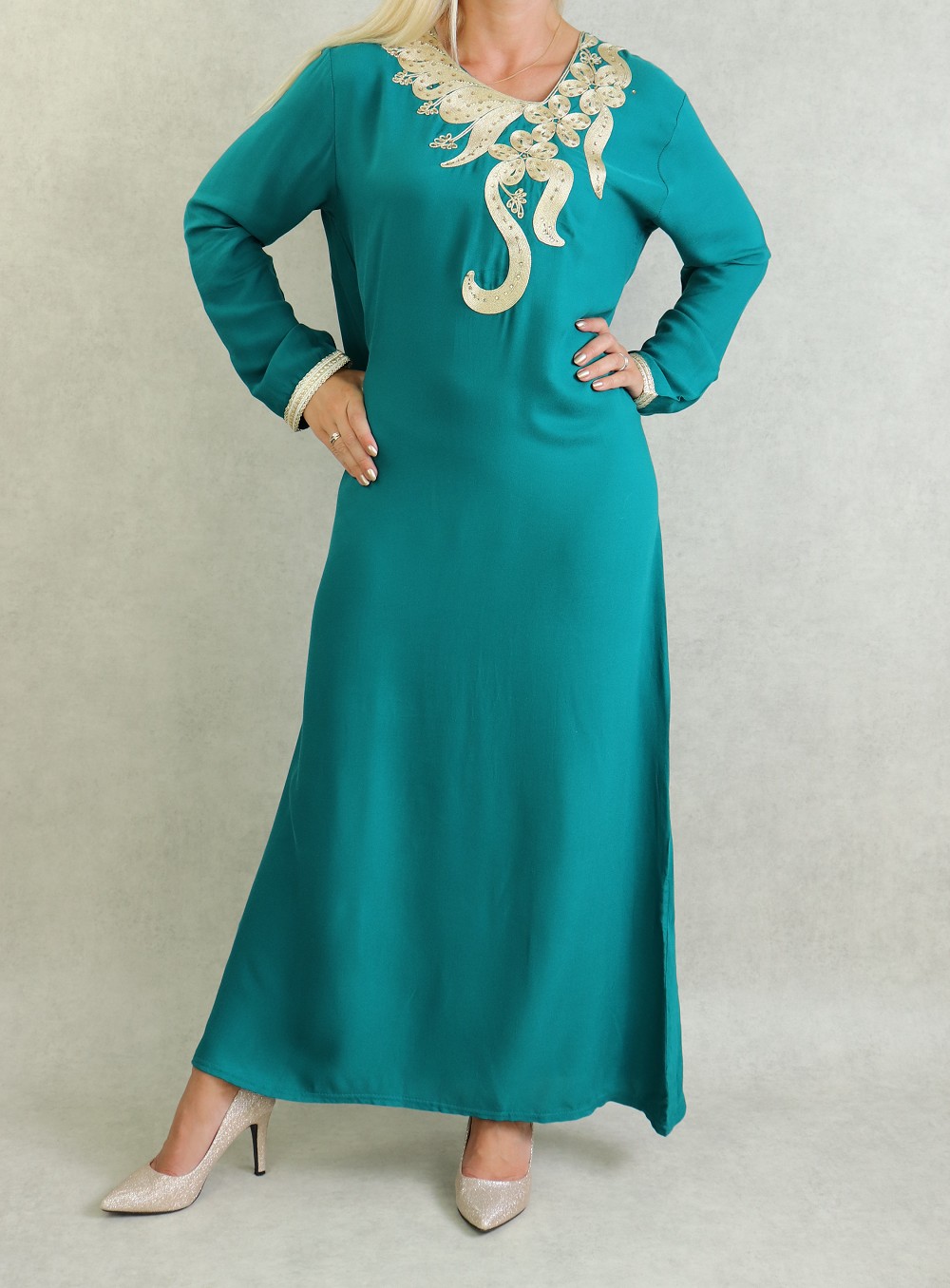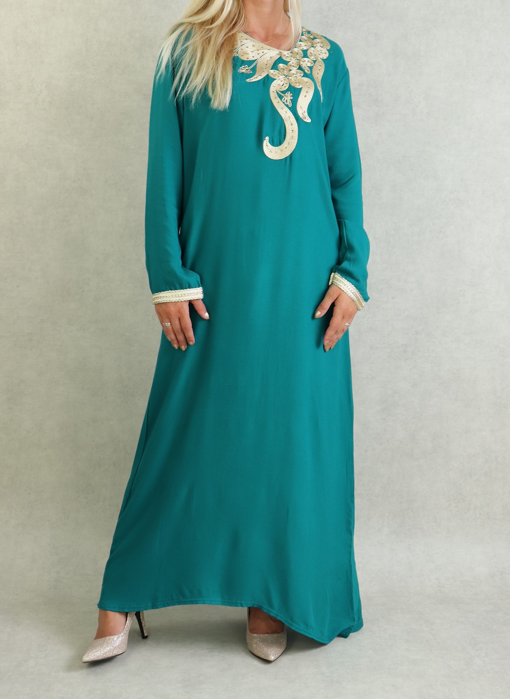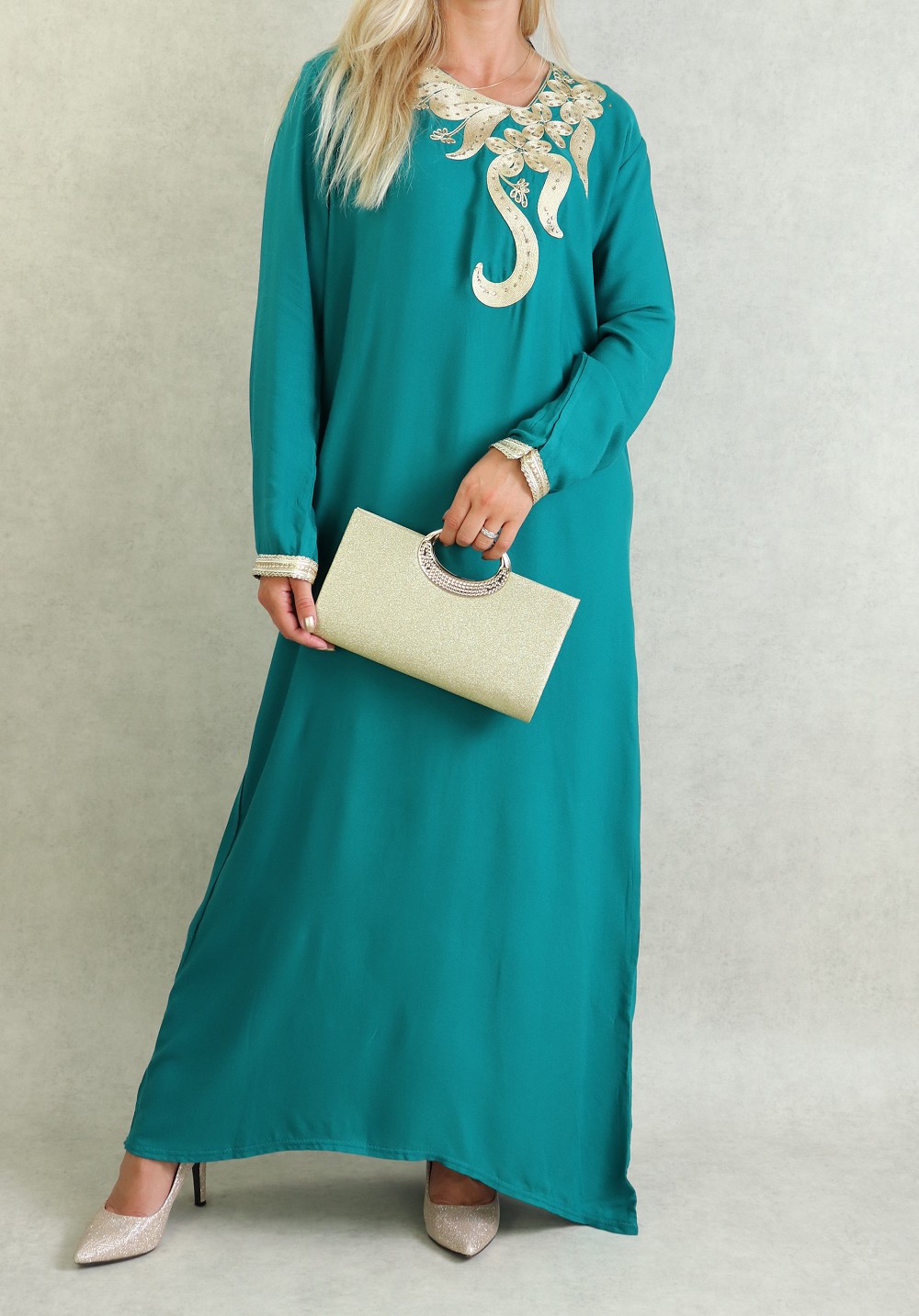Robe longue orientale pour femme avec broderies et strass dorés - Couleur vert émeraude Vetement & Accessoire