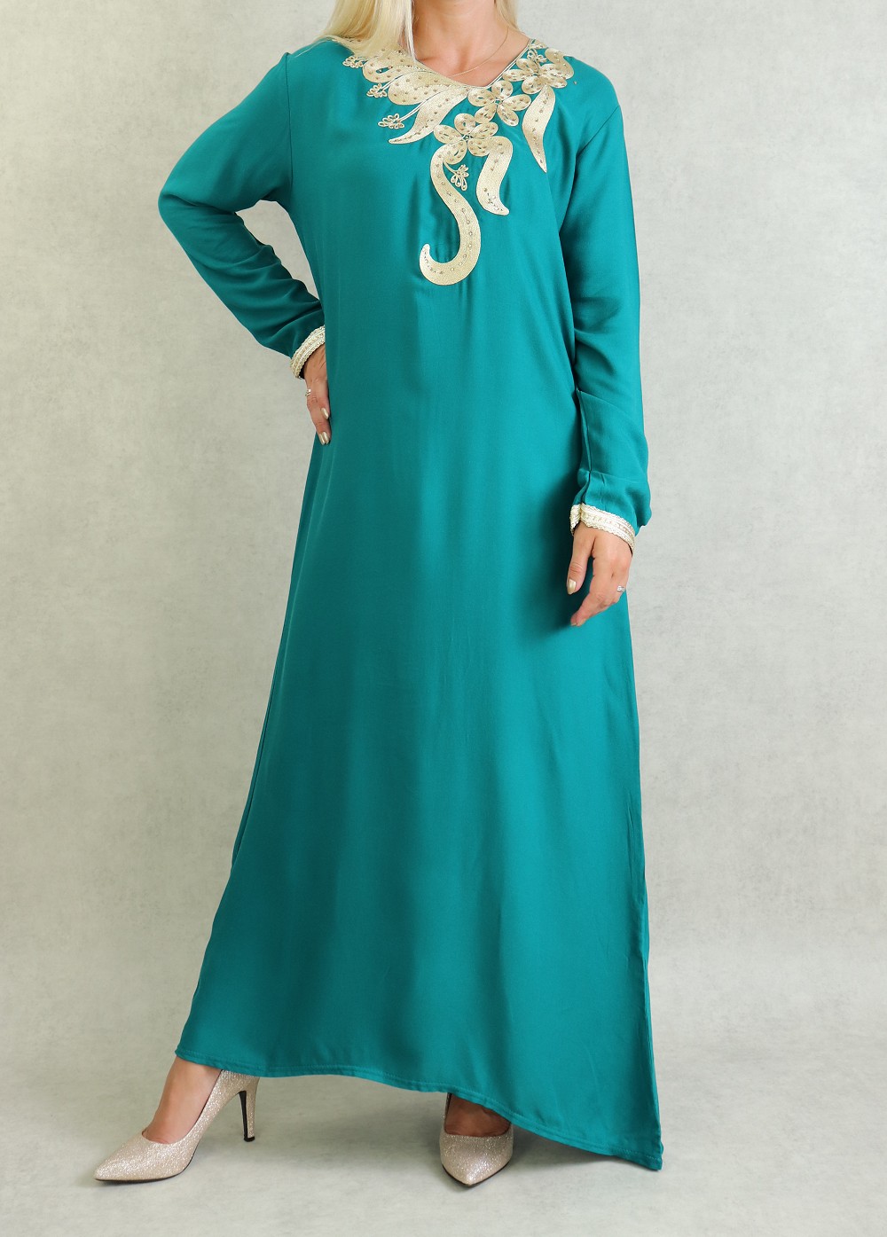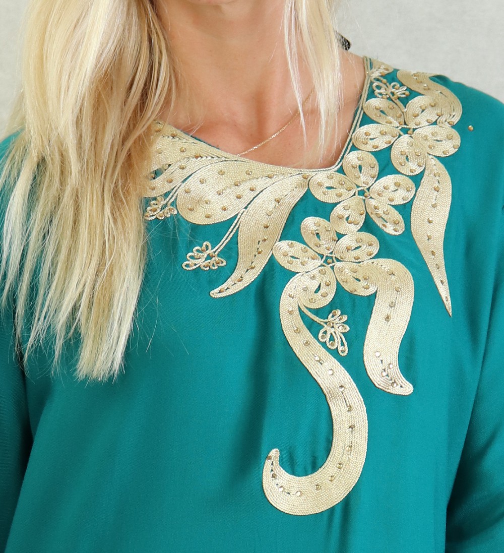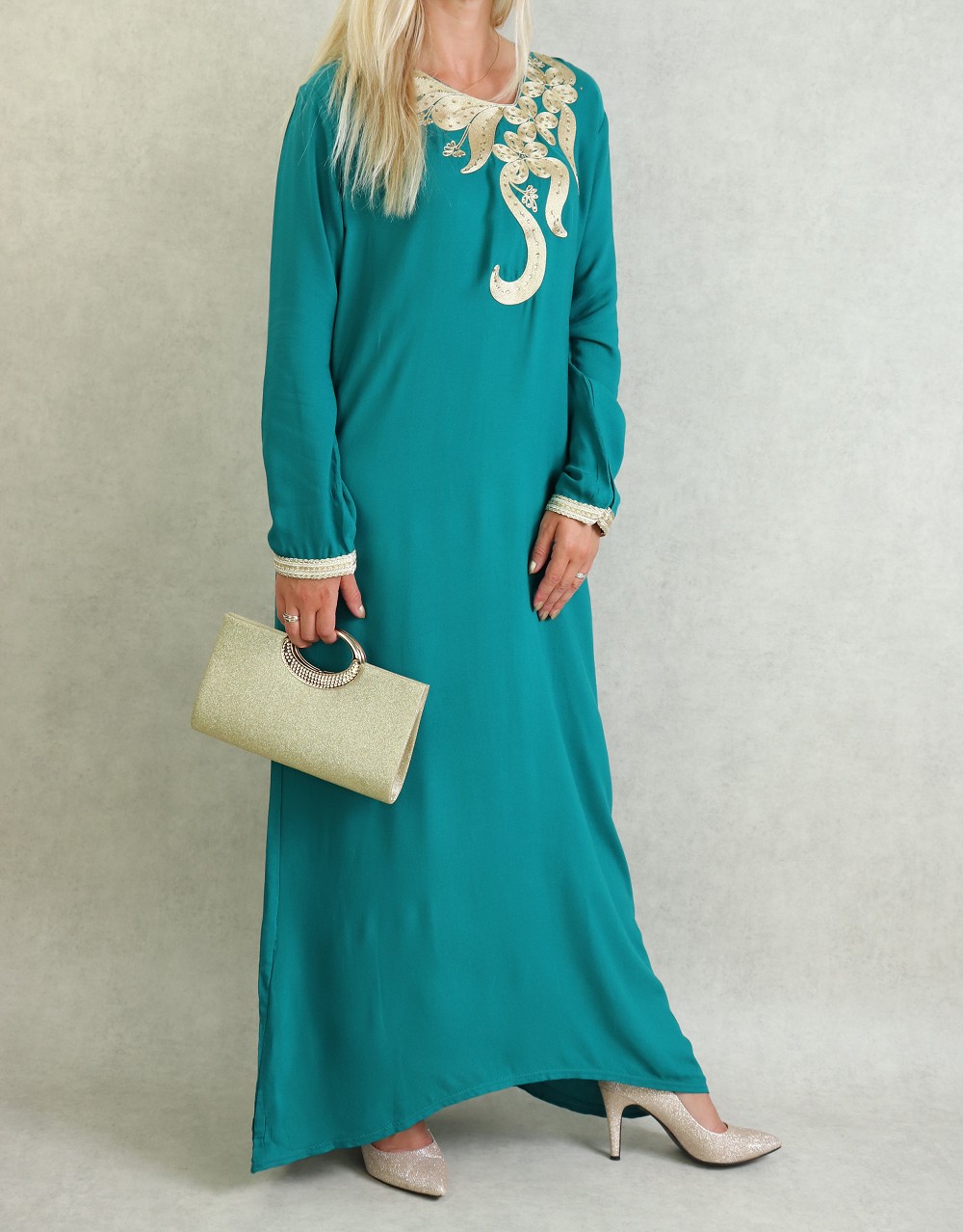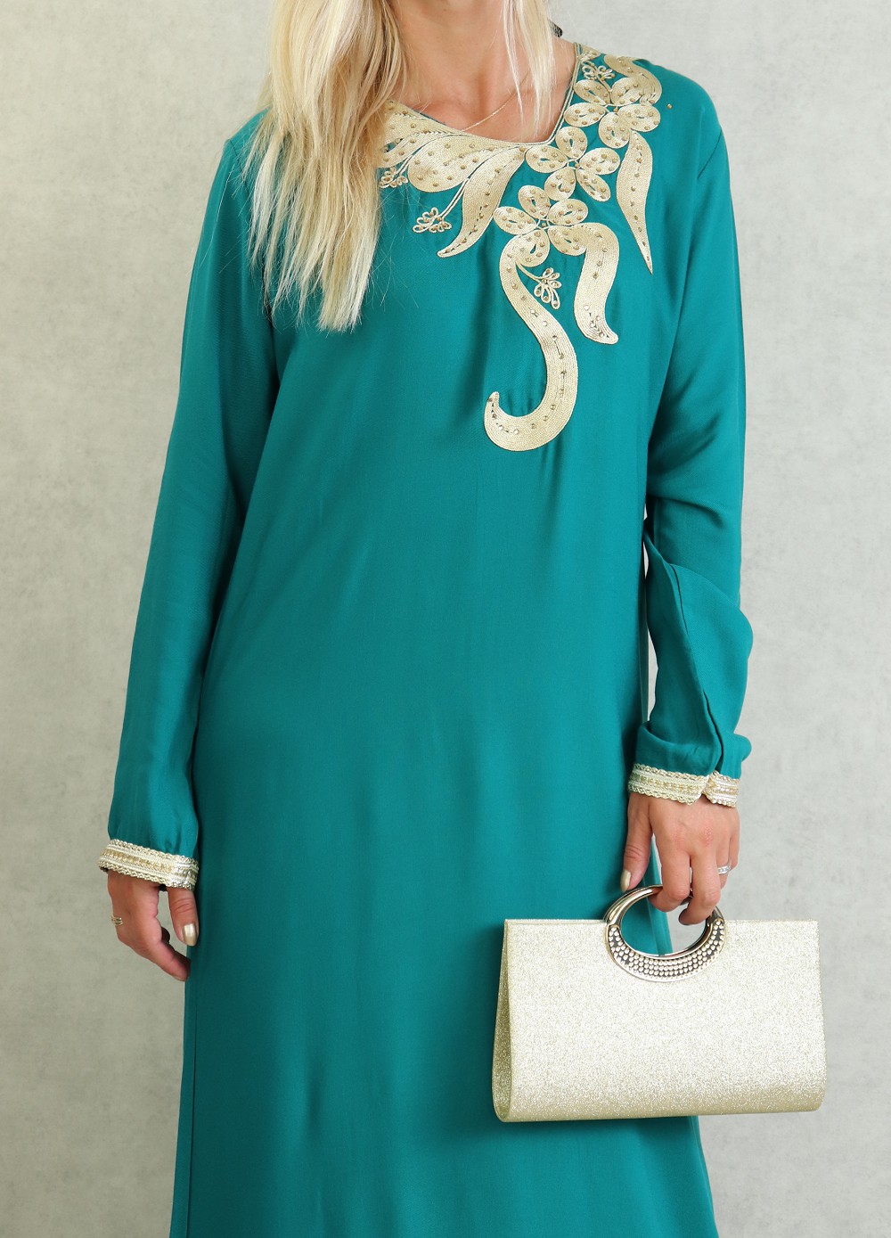 Robe longue orientale pour femme avec broderies et strass dorés - Couleur vert émeraude Vetement & Accessoire