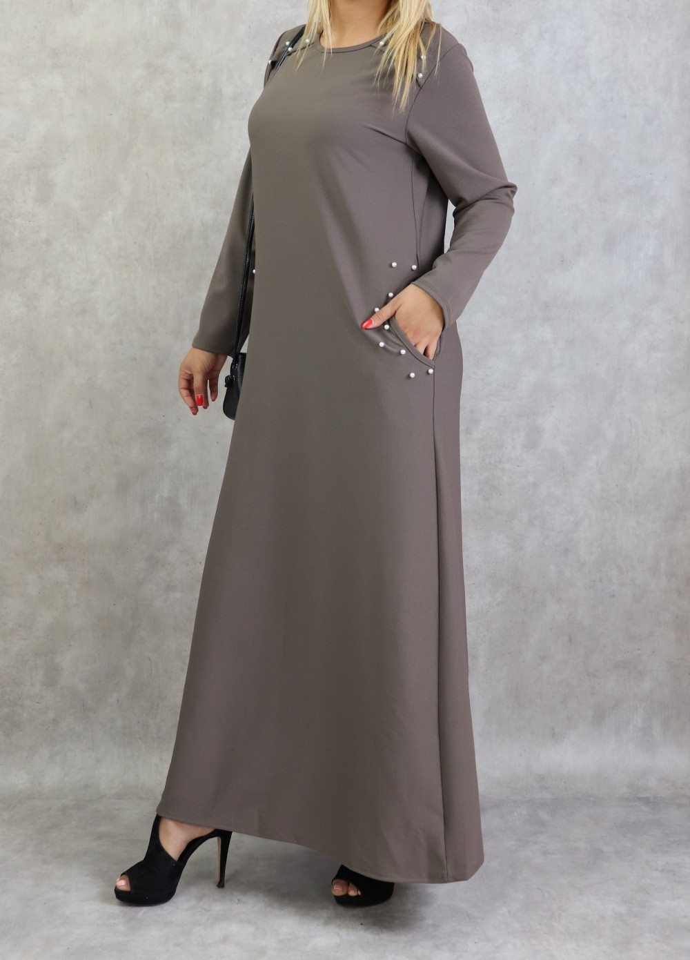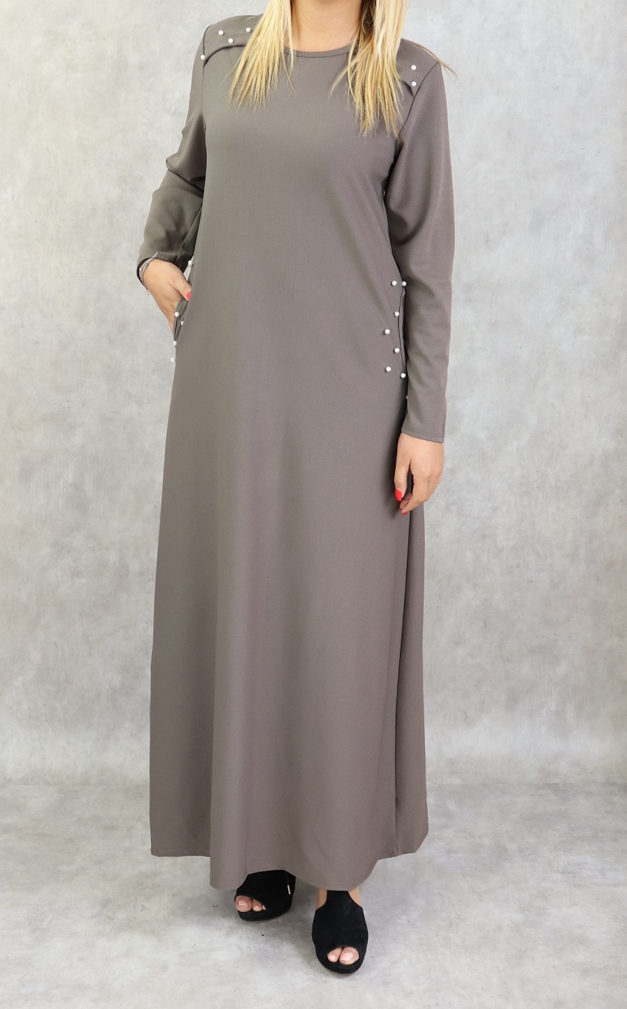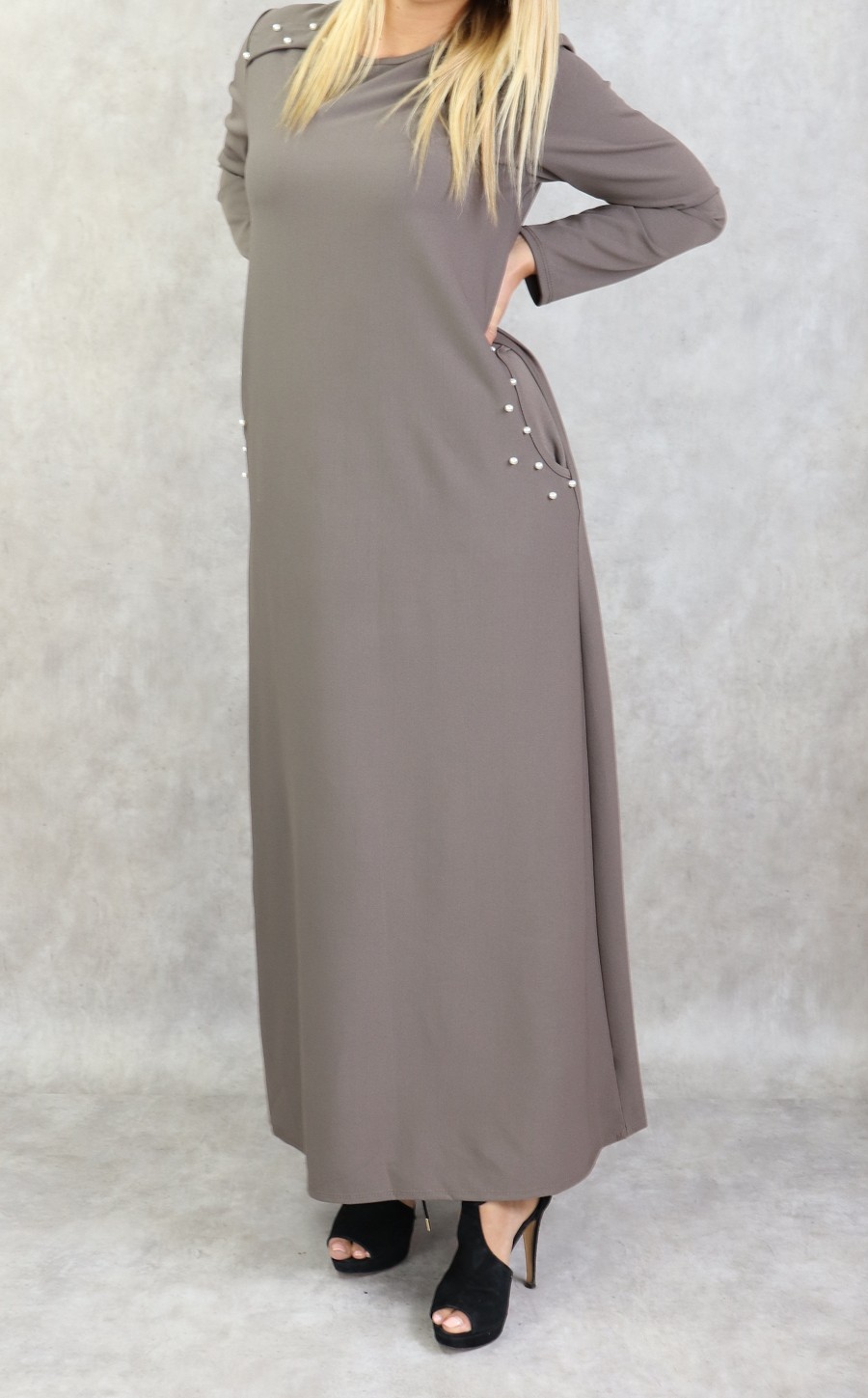 Robe longue, col rond, coupe droite, avec perle blanches sur les épaules et sur les deux poches latérales, Tissu assez épais non transparent.