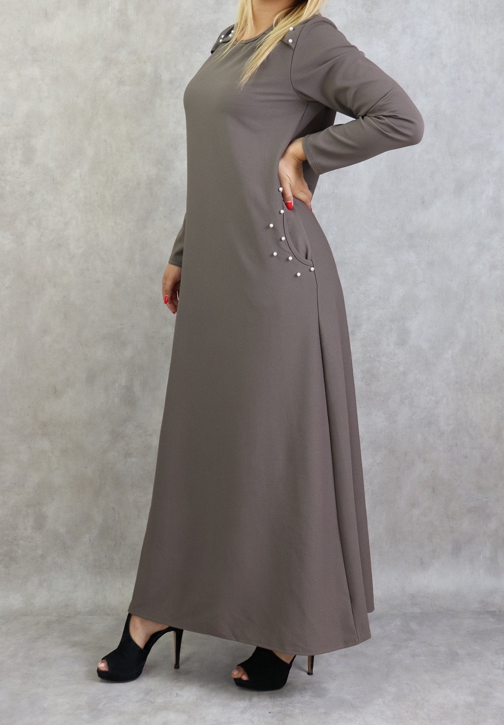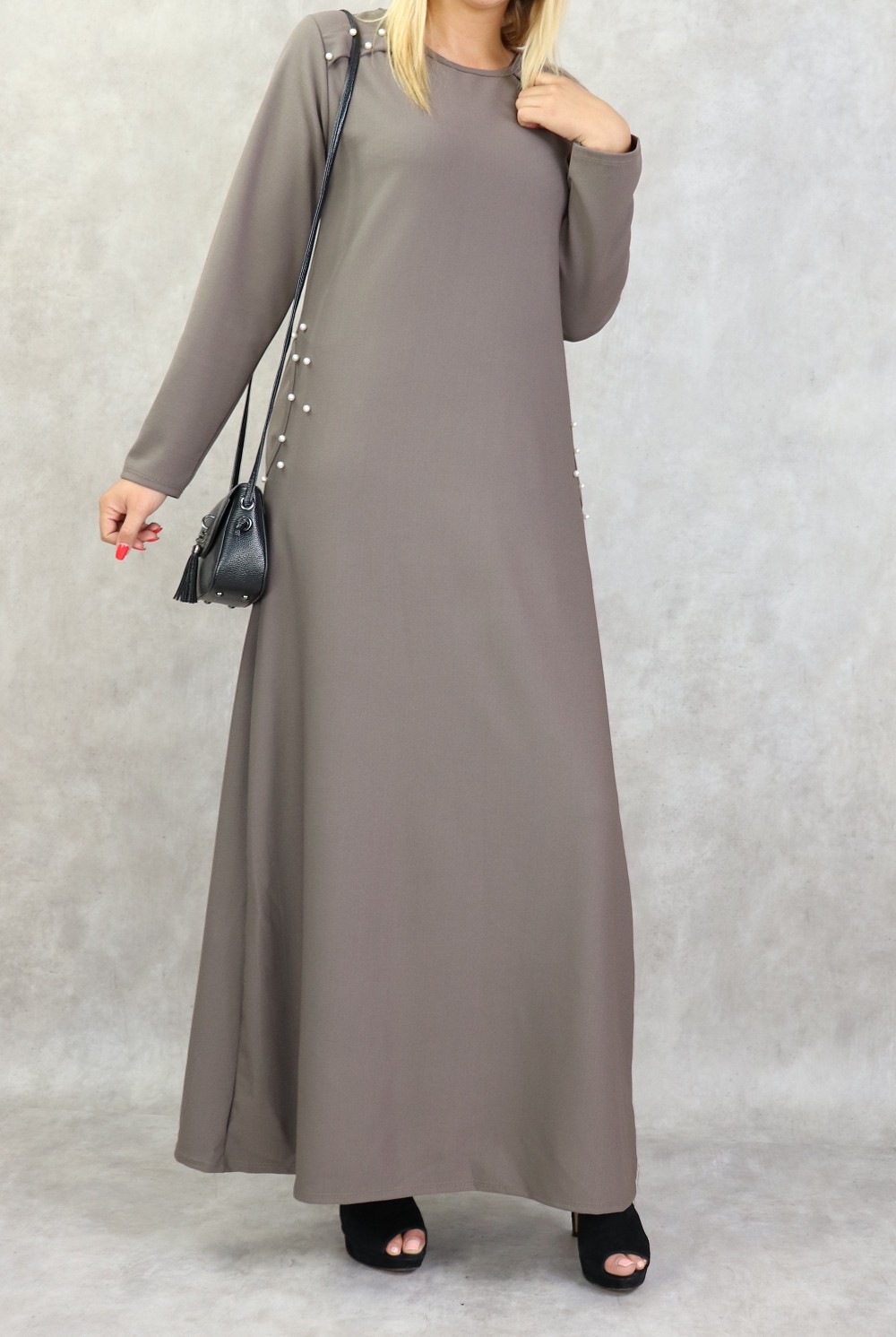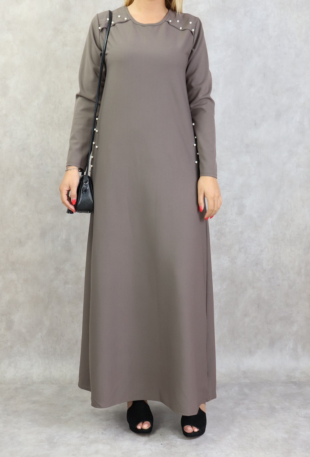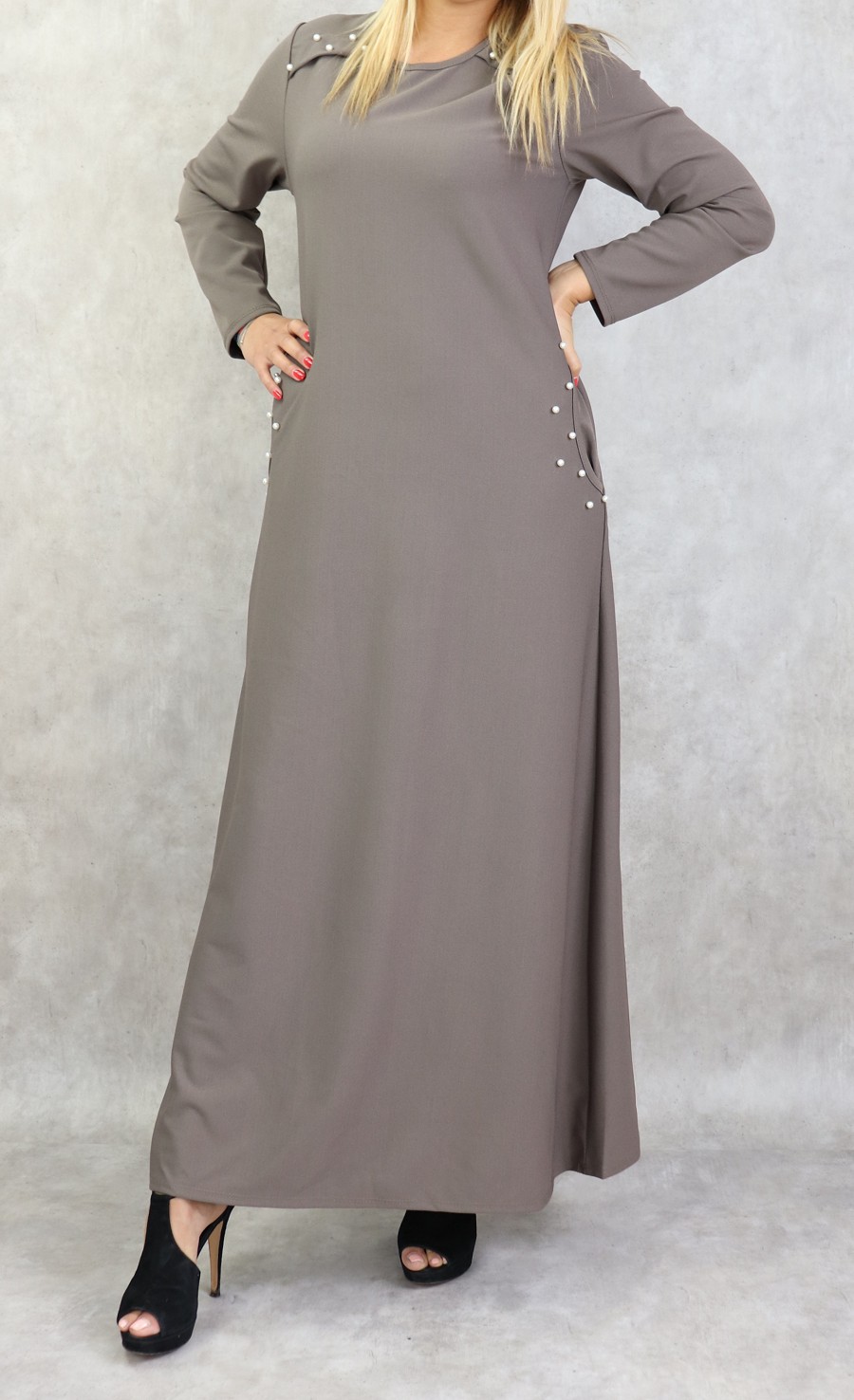 Robe longue, col rond, coupe droite, avec perle blanches sur les épaules et sur les deux poches latérales, Tissu assez épais non transparent.