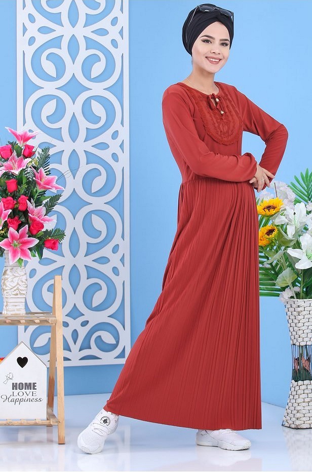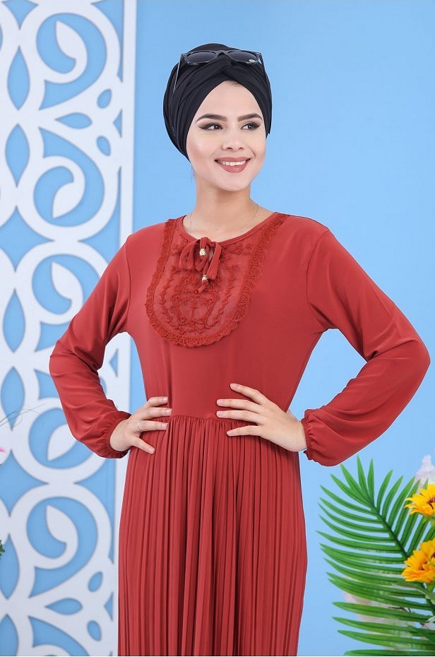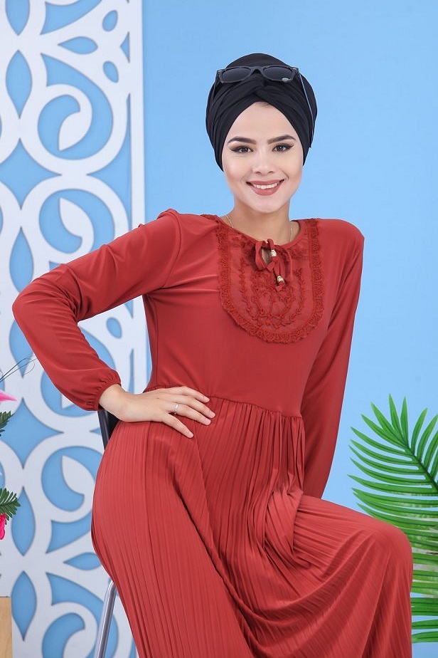 Robe longue plissée avec broderies pour femme - Couleur orange brique Vetement & Accessoire