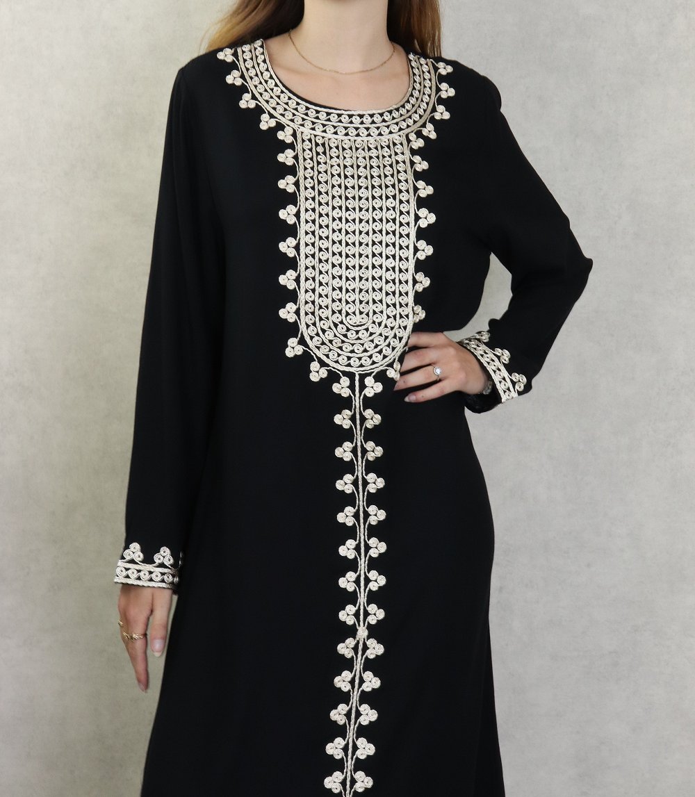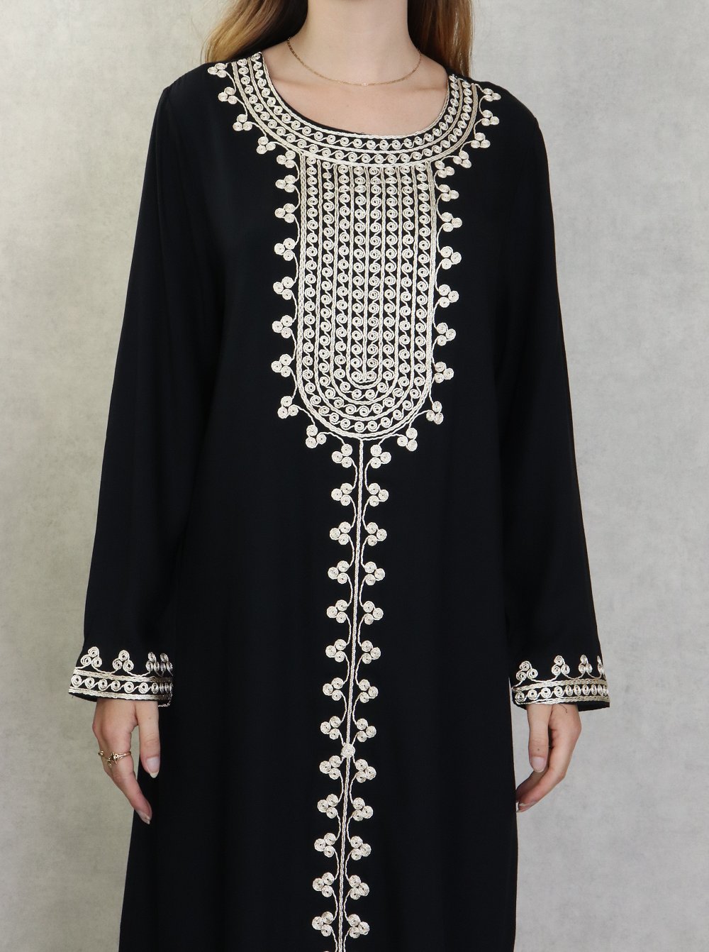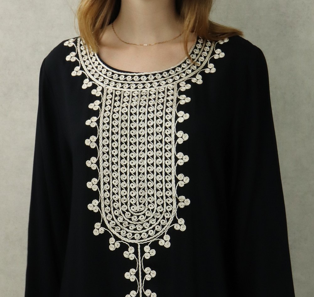 Robe longue avec nombreuses broderies assorties sur les manches et sur le buste et toute la longueur. Col rond, coupe droite, tissu léger et fluide. Modèle classique et sobre, sera parfait pour le quotidien, son style et sa matière vous mettront tout de suite à l'aise.