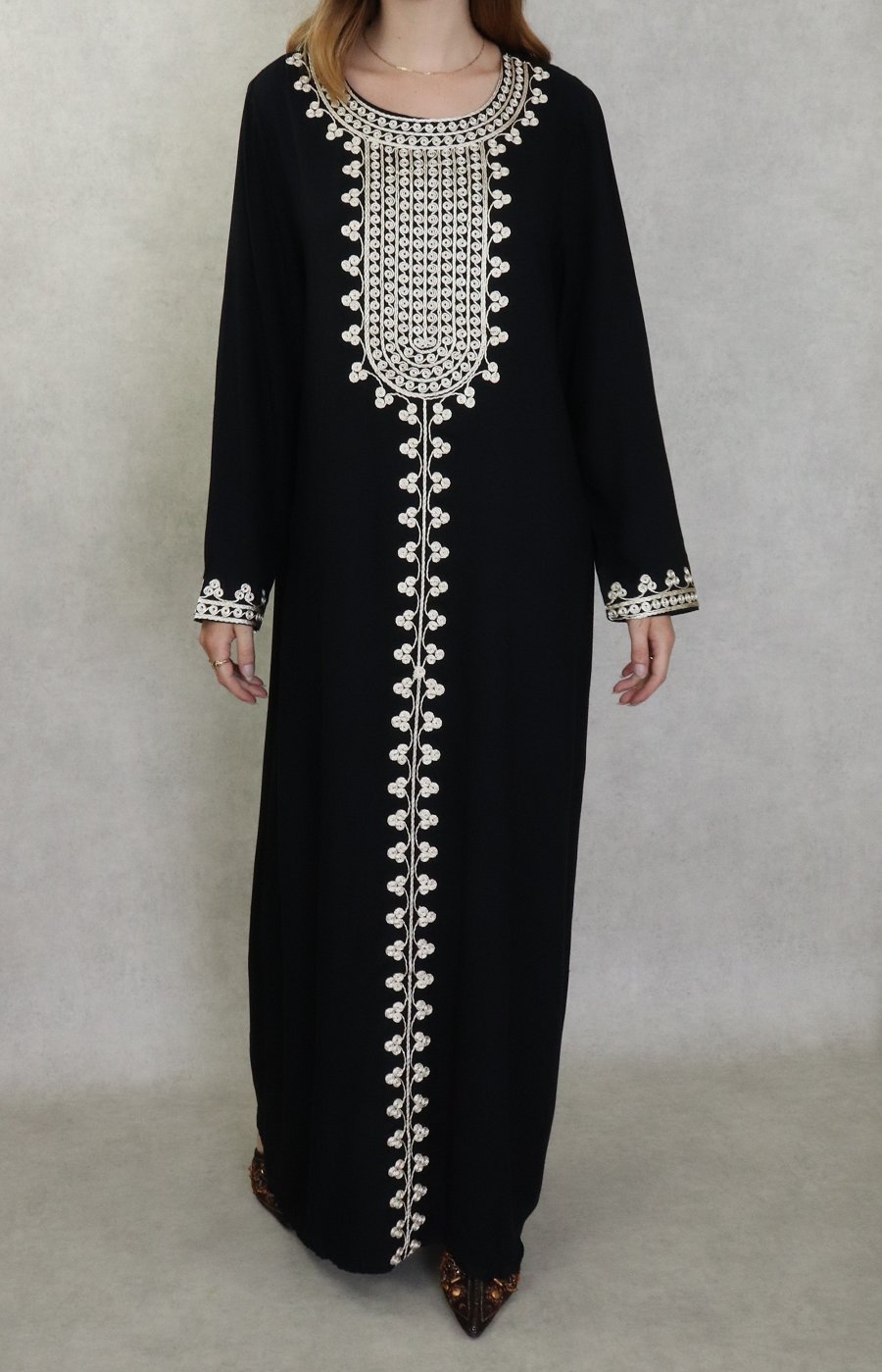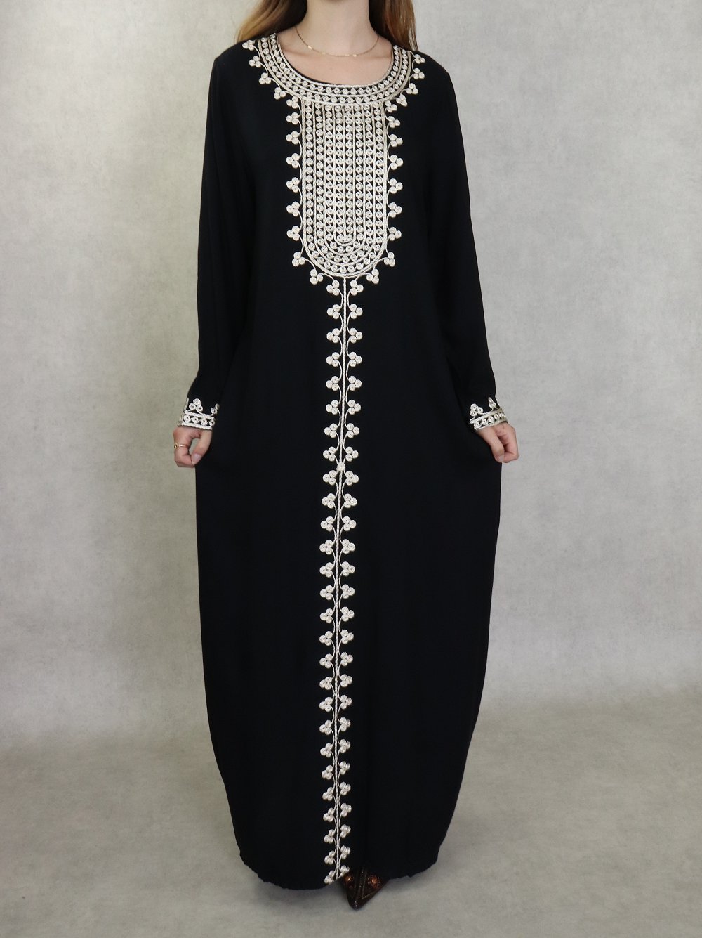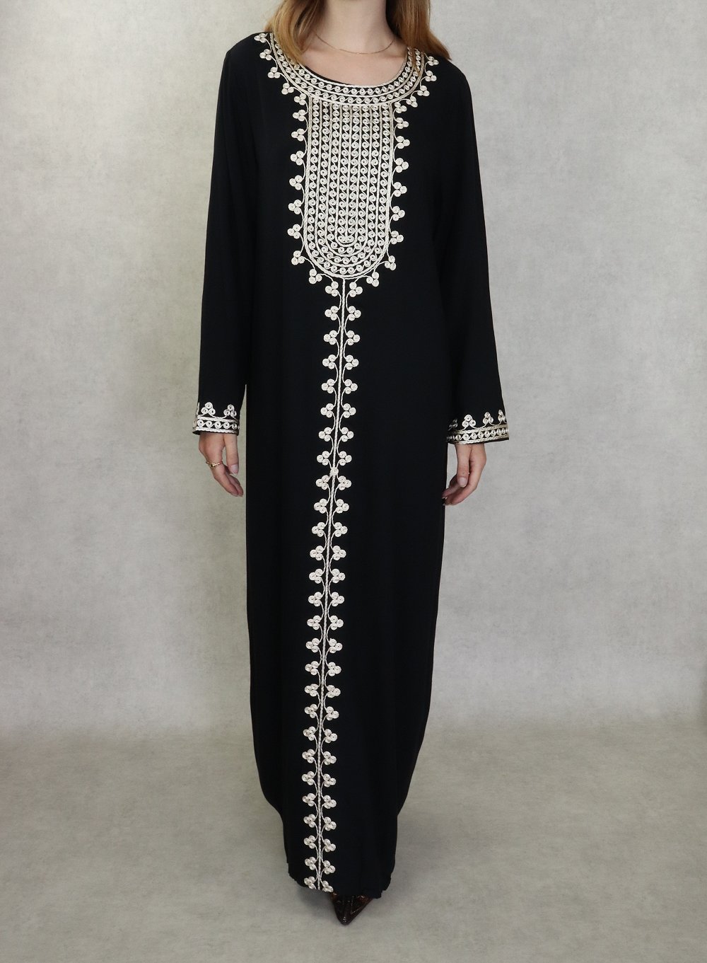 Robe longue avec nombreuses broderies assorties sur les manches et sur le buste et toute la longueur. Col rond, coupe droite, tissu léger et fluide. Modèle classique et sobre, sera parfait pour le quotidien, son style et sa matière vous mettront tout de suite à l'aise.