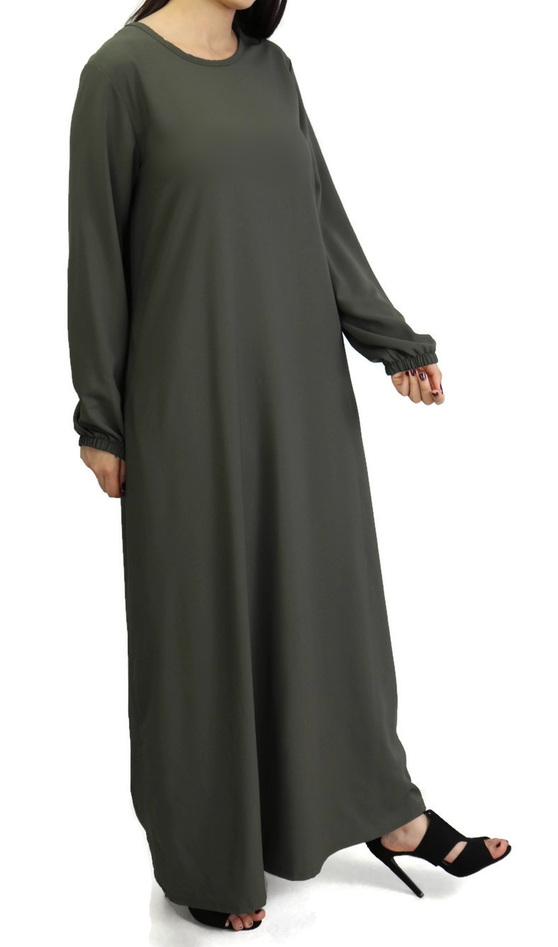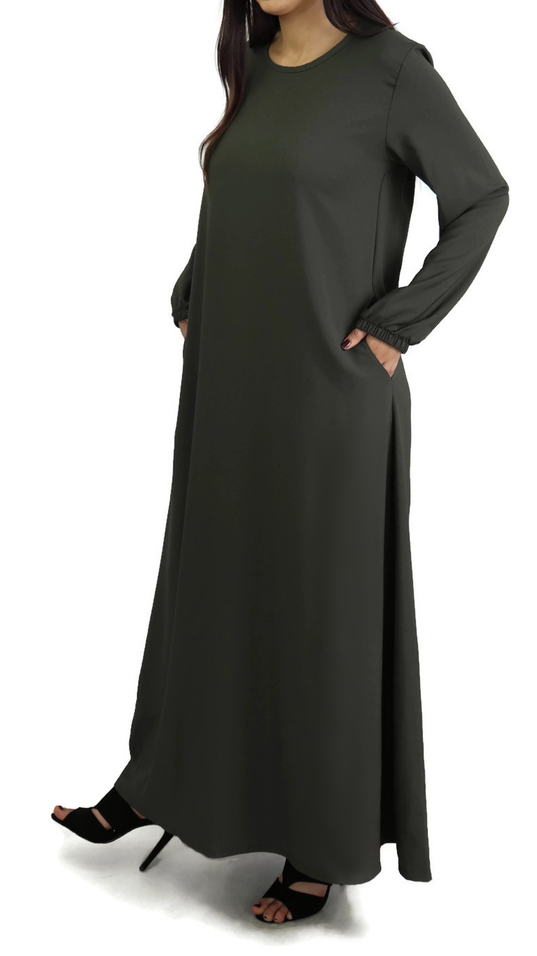 Robe évasée, avec deux poches latérales, tissu fluide et léger, légèrement élastique.