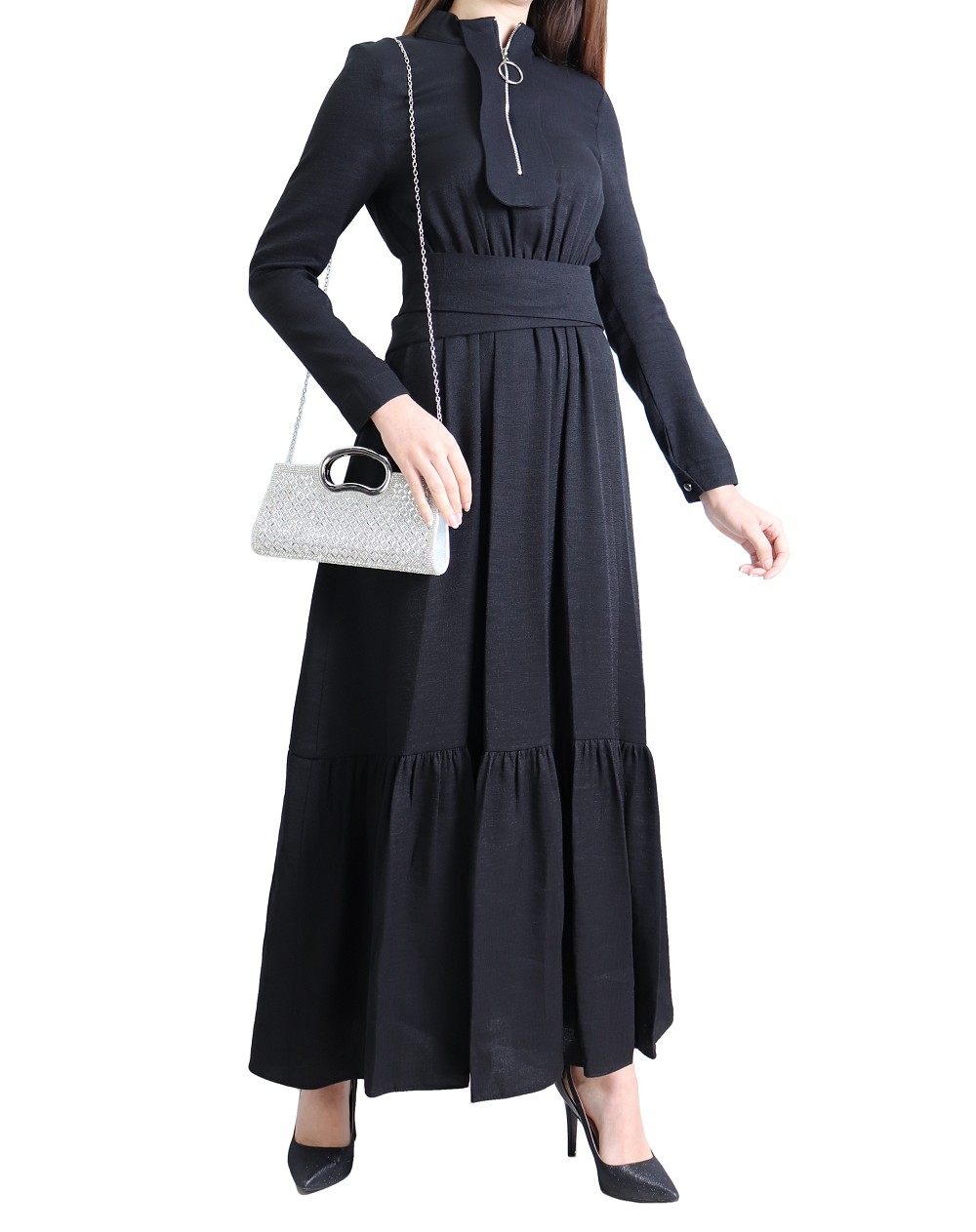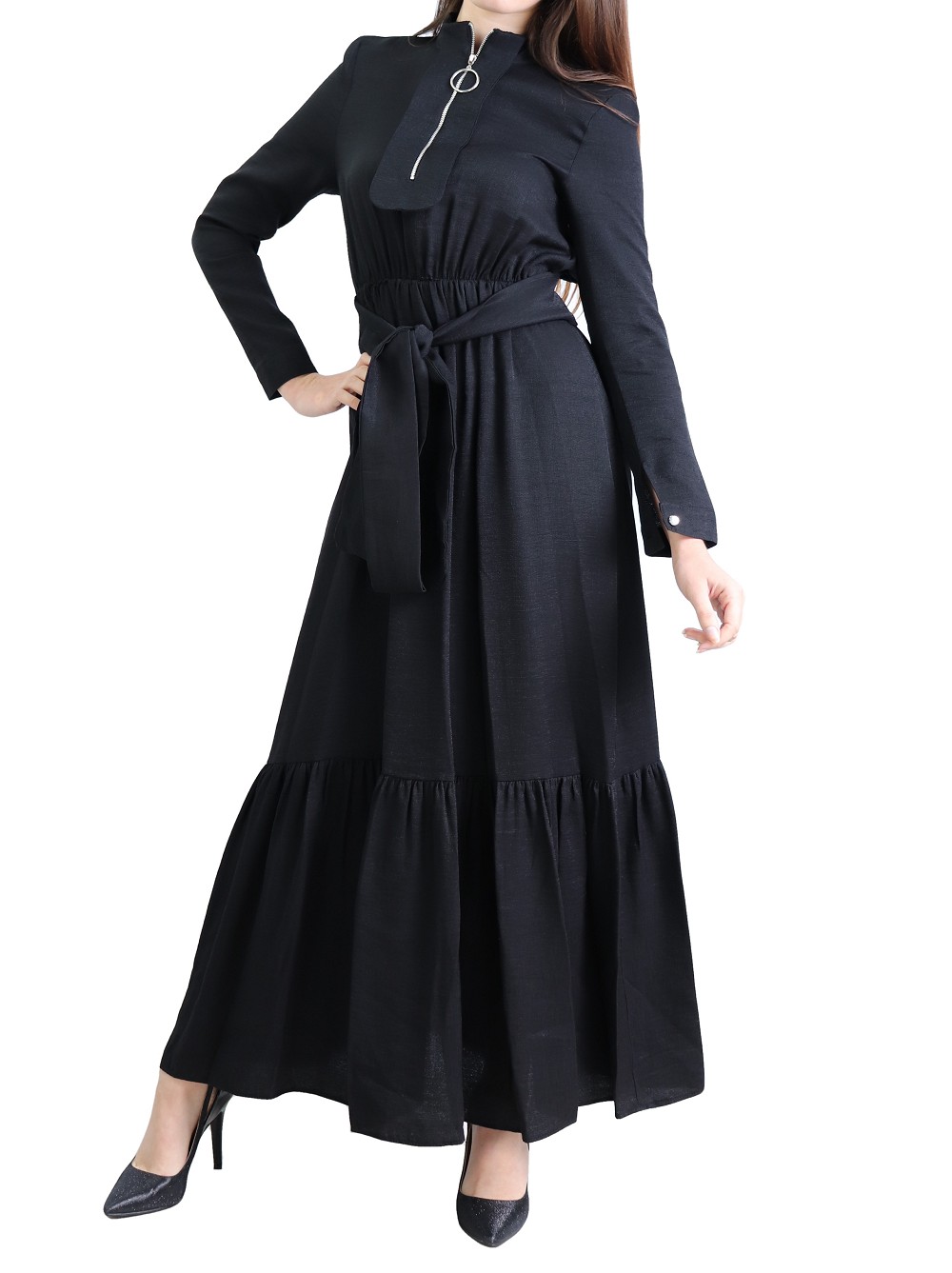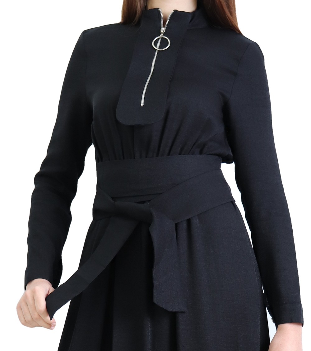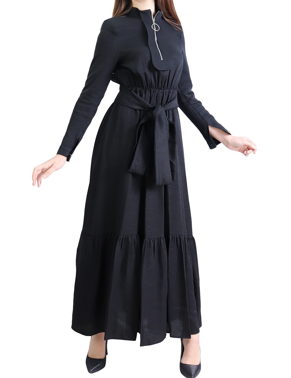 Robe longue, col Mao, fermeture éclair sur le buste, manches finition bouton, taille cintrée élastique, large ceinture assortie, tissu effet lin tissé.