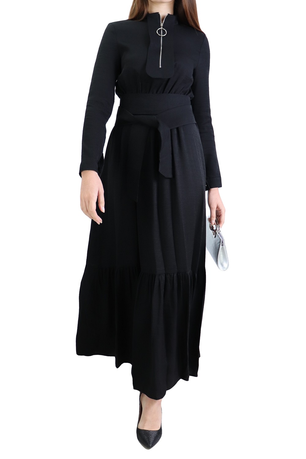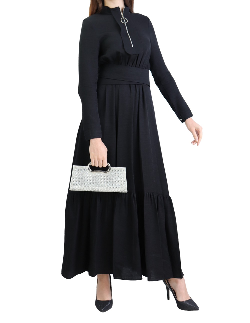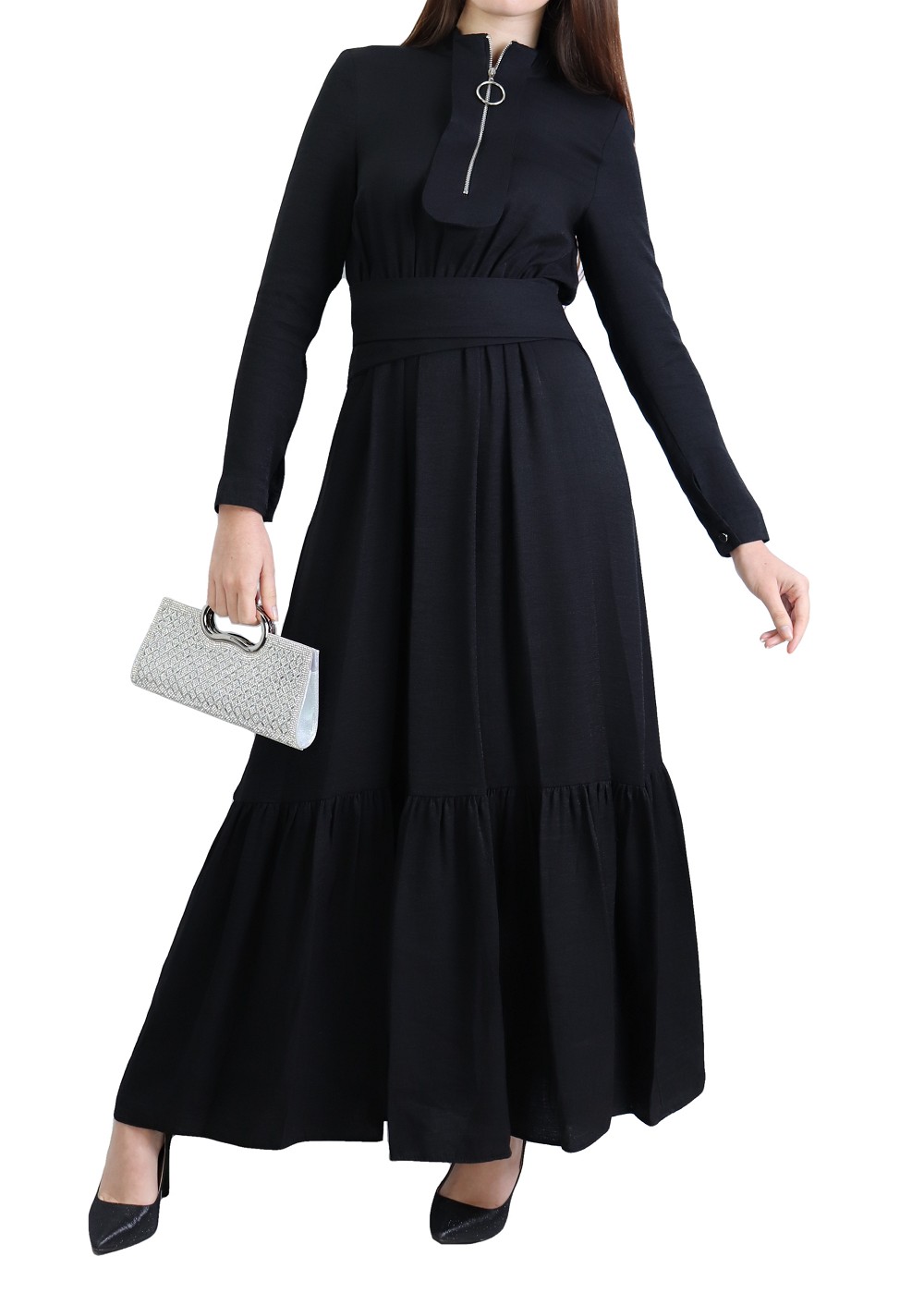 Robe longue, col Mao, fermeture éclair sur le buste, manches finition bouton, taille cintrée élastique, large ceinture assortie, tissu effet lin tissé.