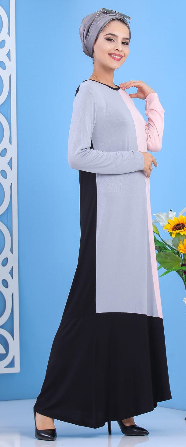 Robe longue tricolore pour femme (noir, gris et rose)
