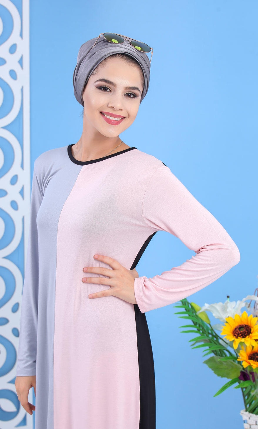 Robe longue à capuche effet plissée pour femme (Vetement moderne pour hijab - Mode Musulmane) - Couleur Gris et Blanc - REF. 33983 (28.00 €)