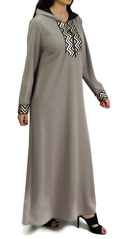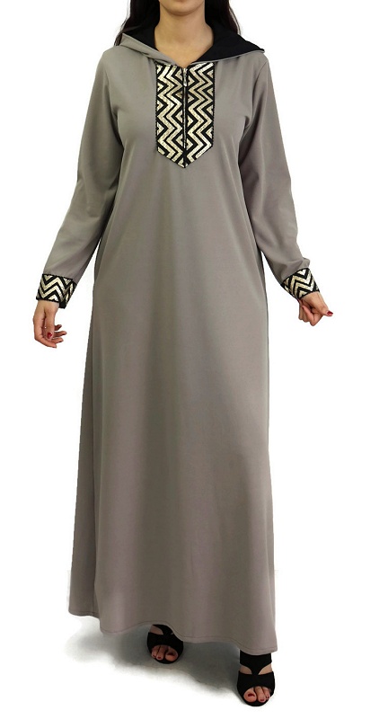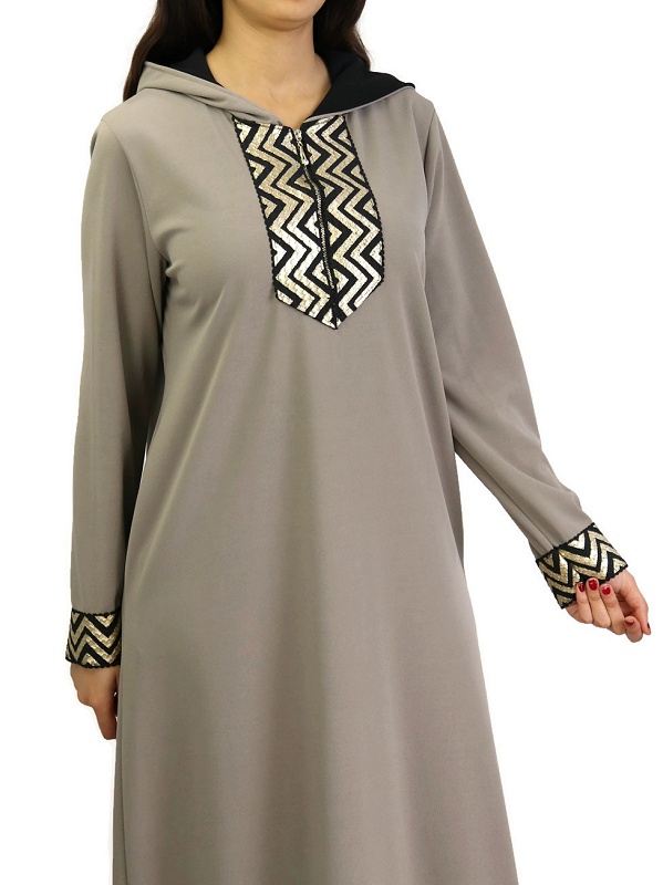 Robe longue type abaya marocaine pour femme avec capuche et motifs dorés - Couleur taupe Vetement & Accessoire