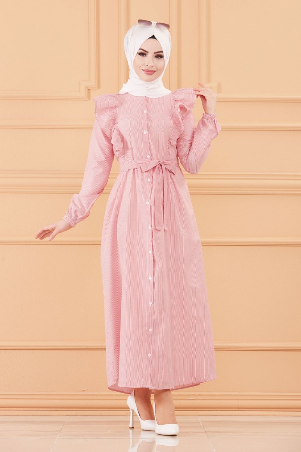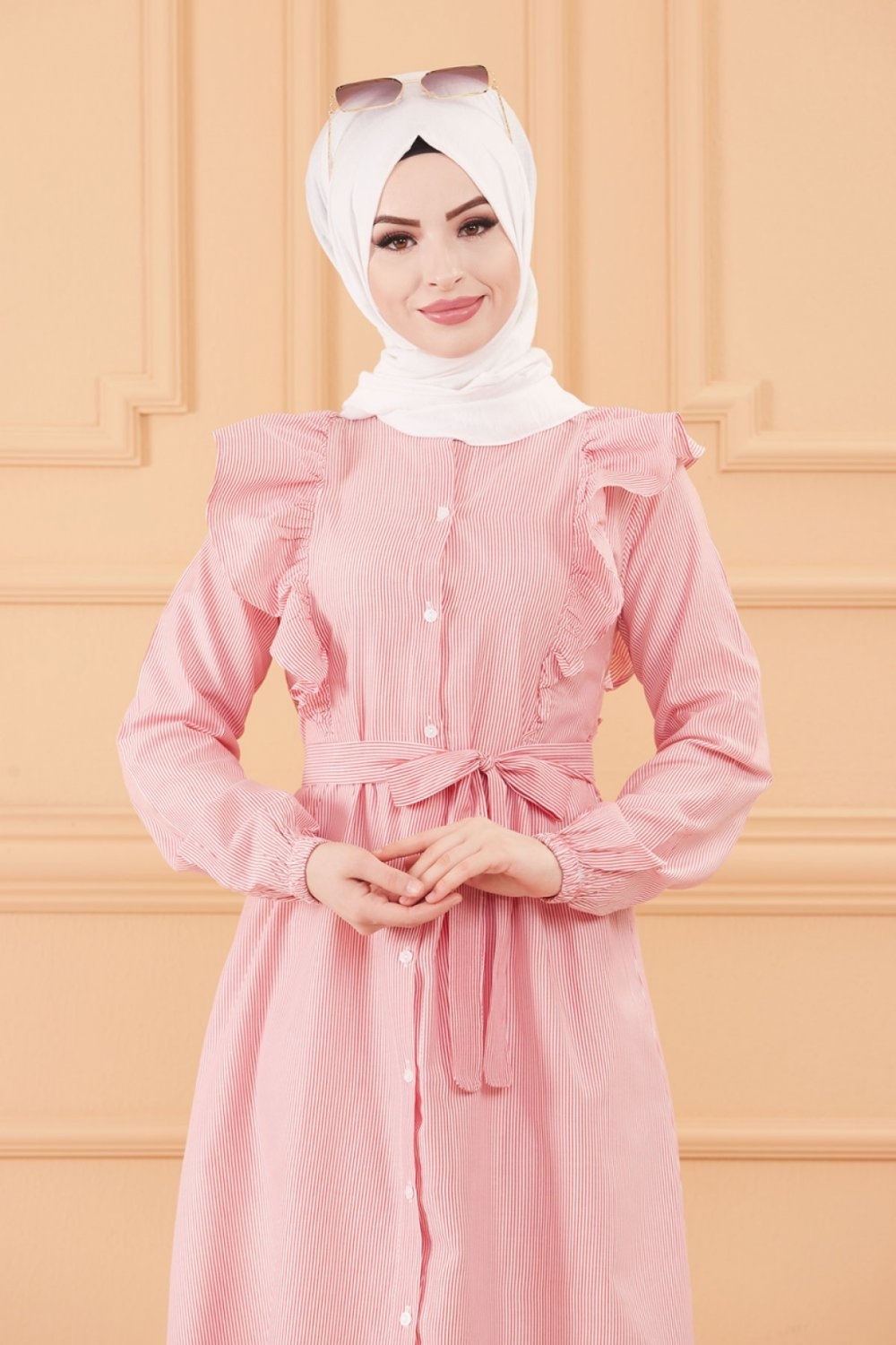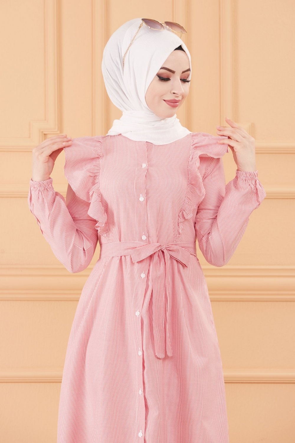 Robe longue type chemise boutonnée (Vêtement Hijab pour femme - Boutique islamique en ligne) - Rayures couleur rouge Vetement & Accessoire