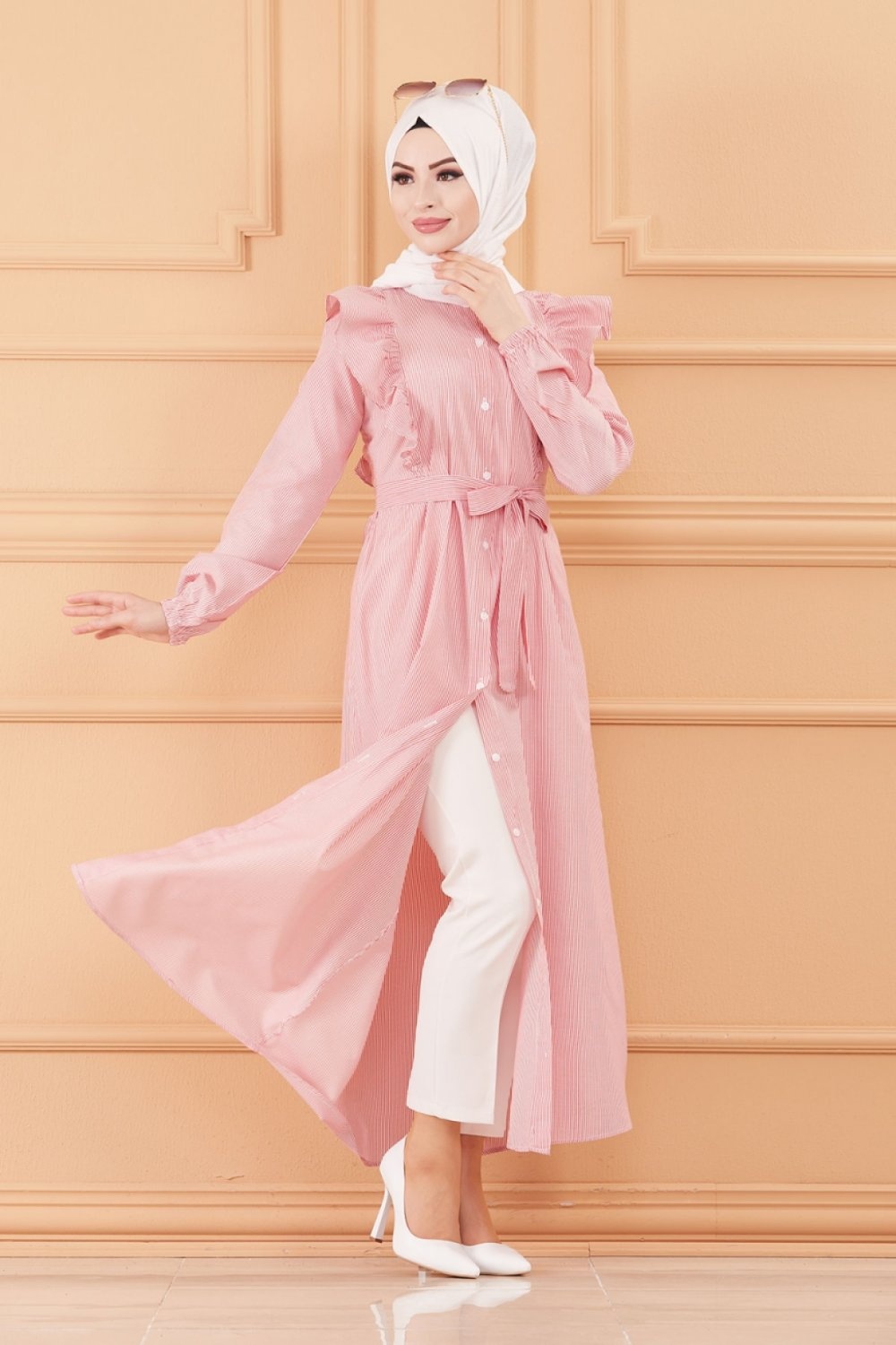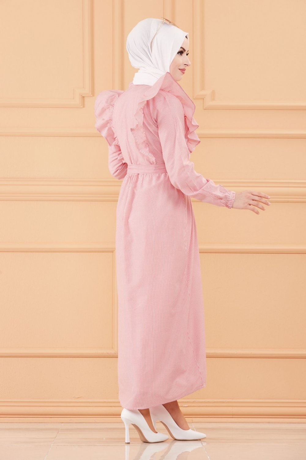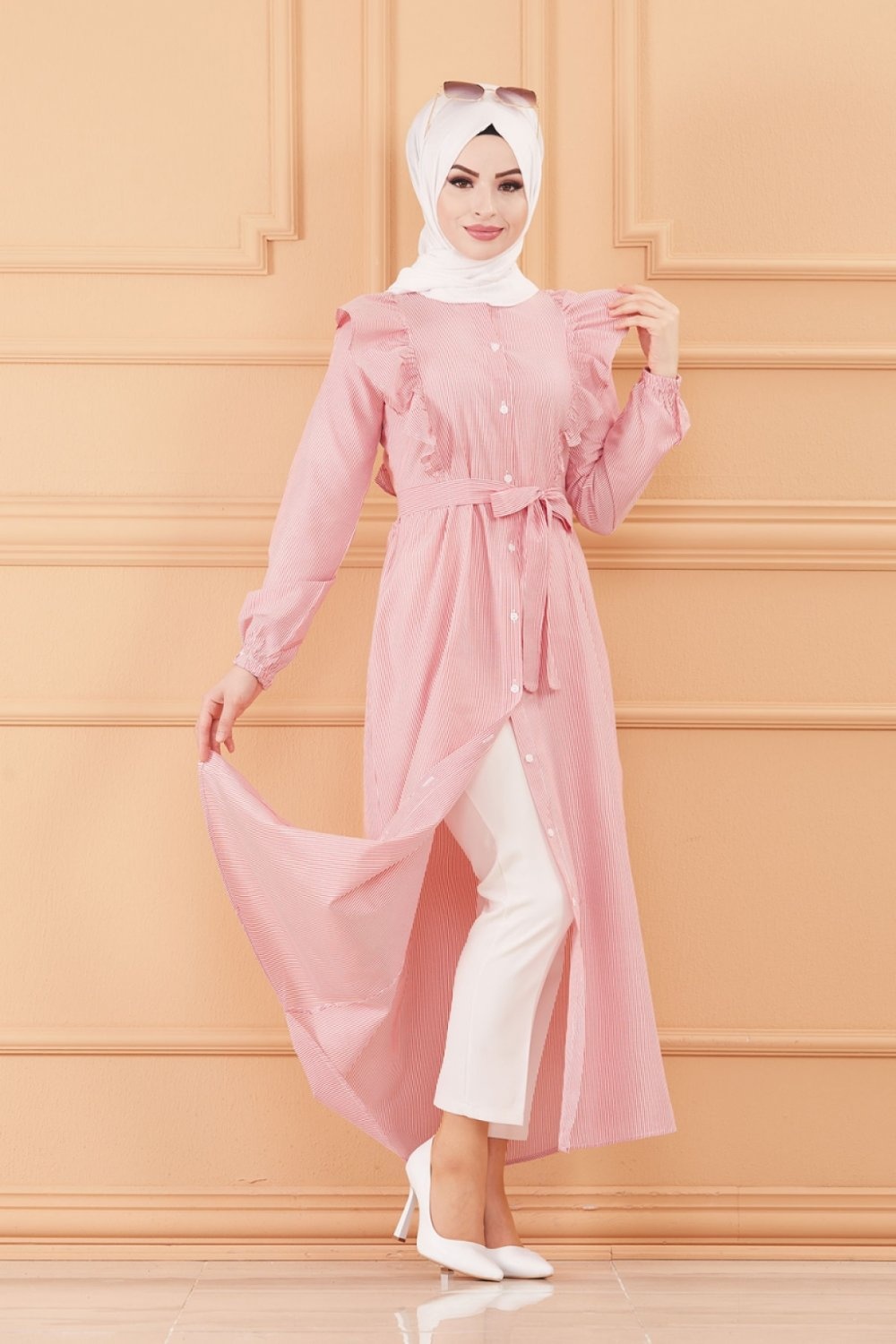 Robe longue type chemise boutonnée (Vêtement Hijab pour femme - Boutique islamique en ligne) - Rayures couleur rouge Vetement & Accessoire