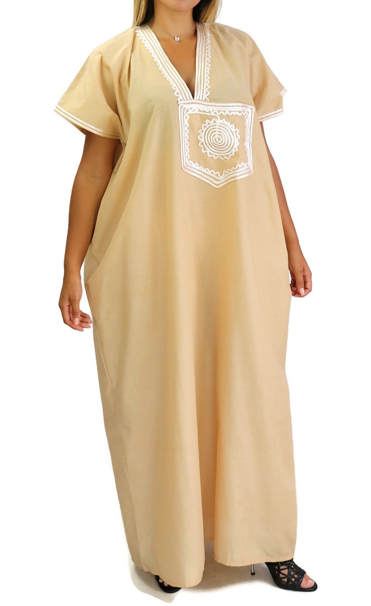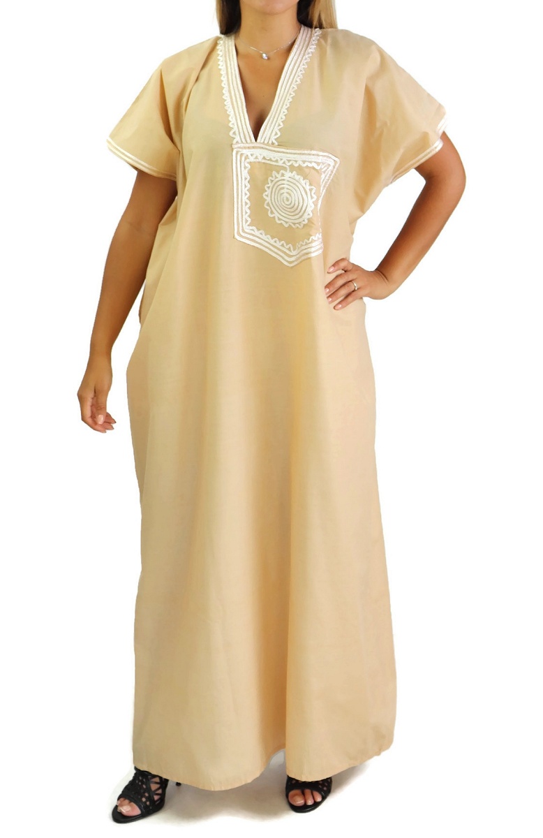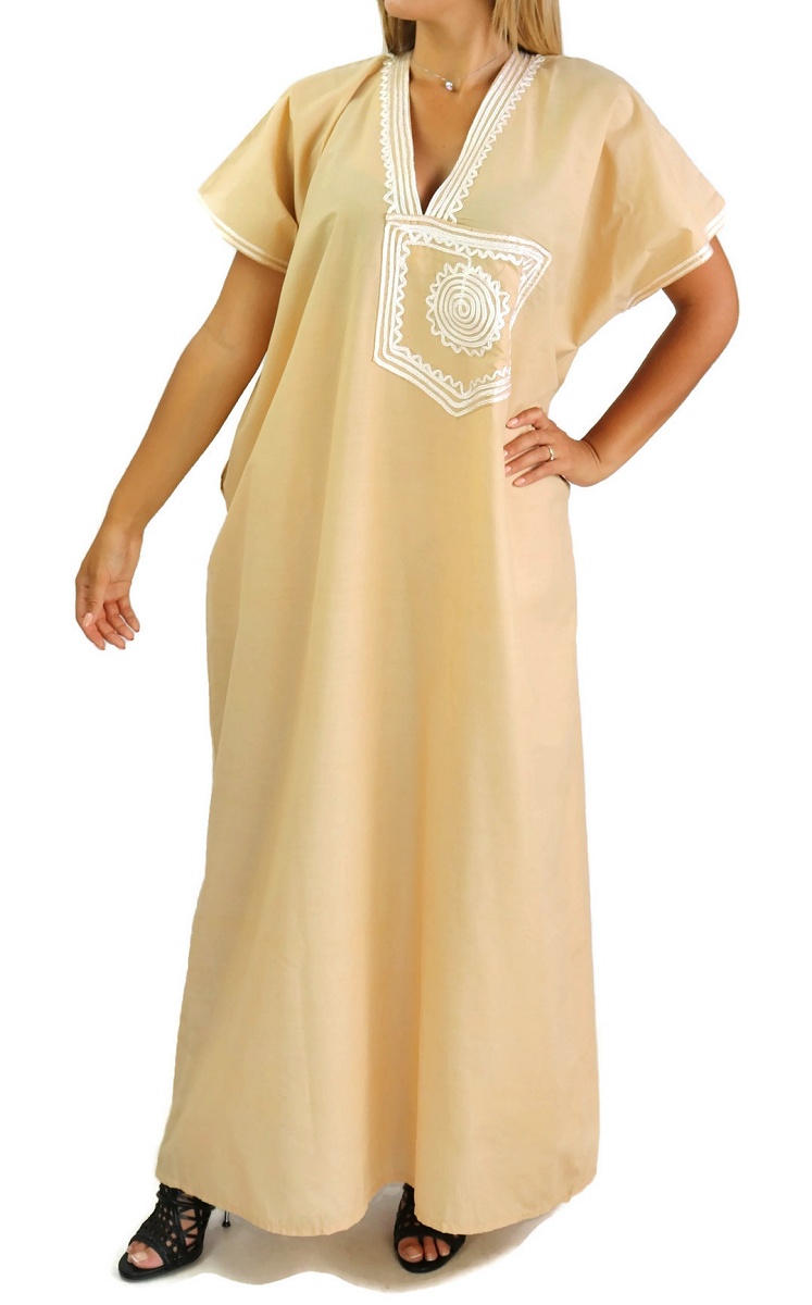 Robe orientale coupe droite col en V ,très agréable à porter, broderies blanches et deux fentes latérales.