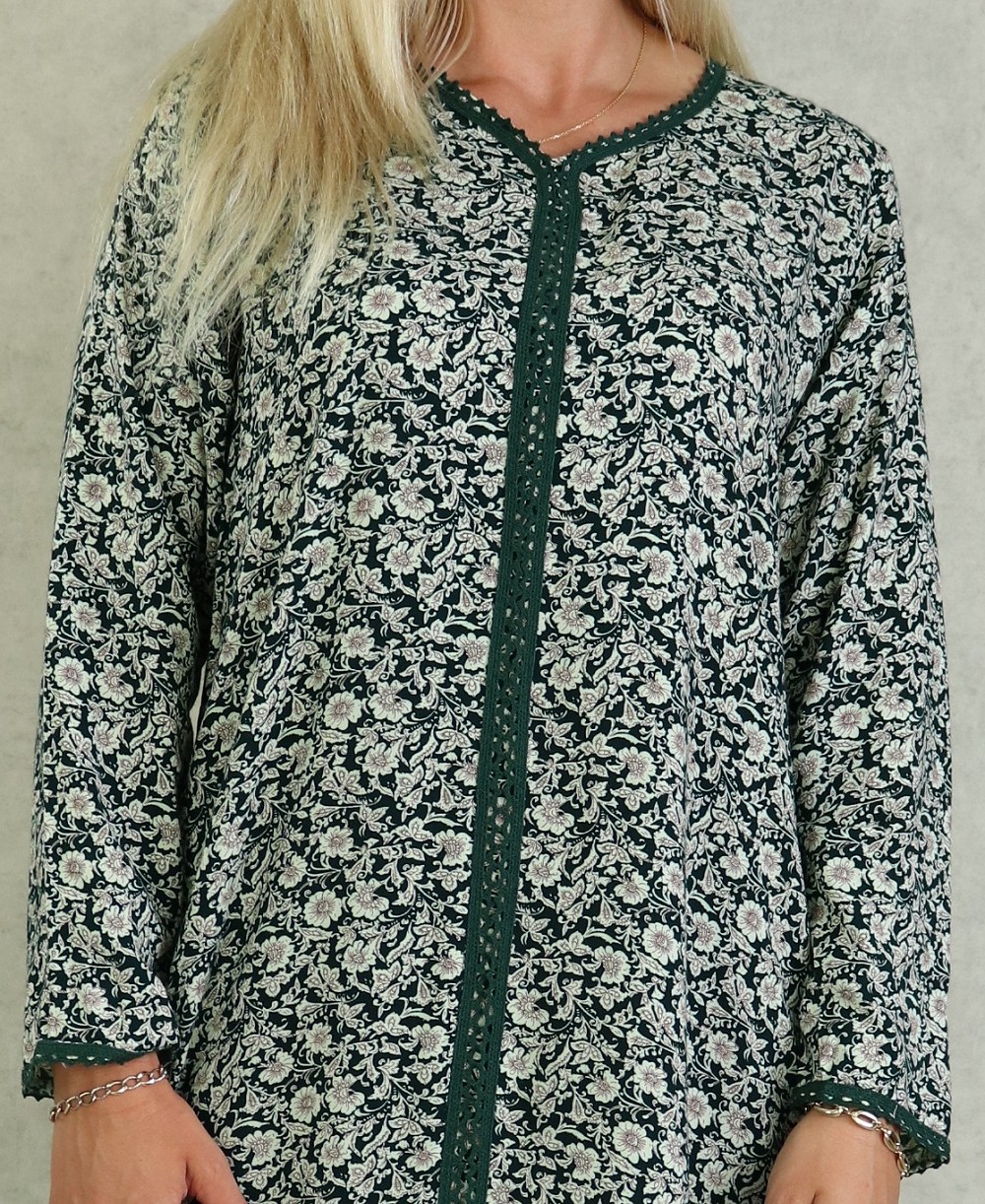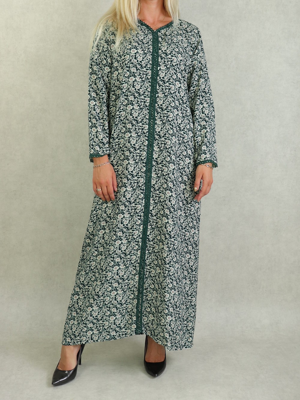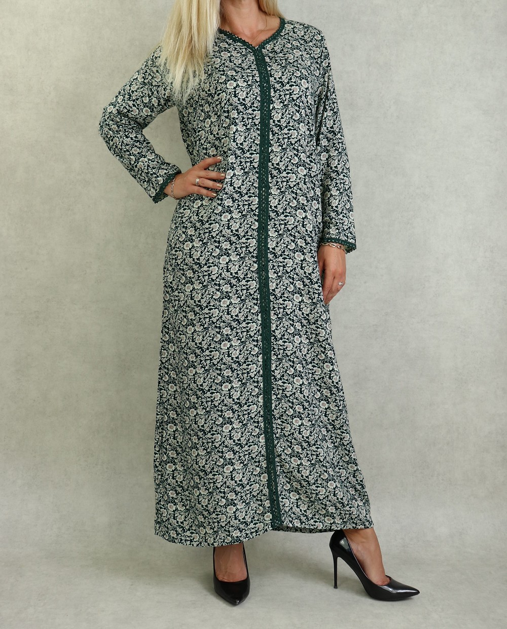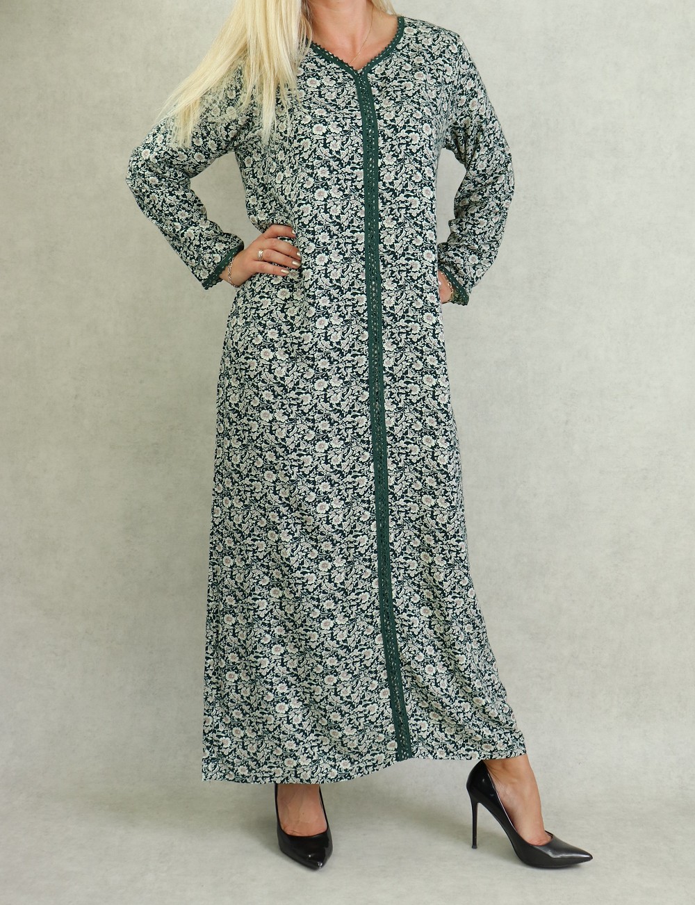 Robe longue, tissu léger de type soie (rayonne), imprimé floral, Col en V, manches longues. Ce modèle est décorée d'une fine broderie sur toute la longueur ainsi que sur les manches.