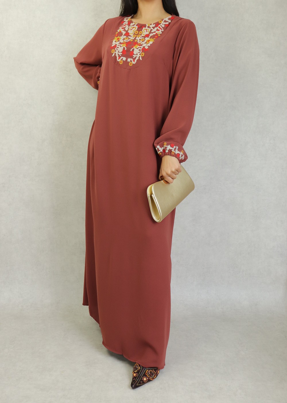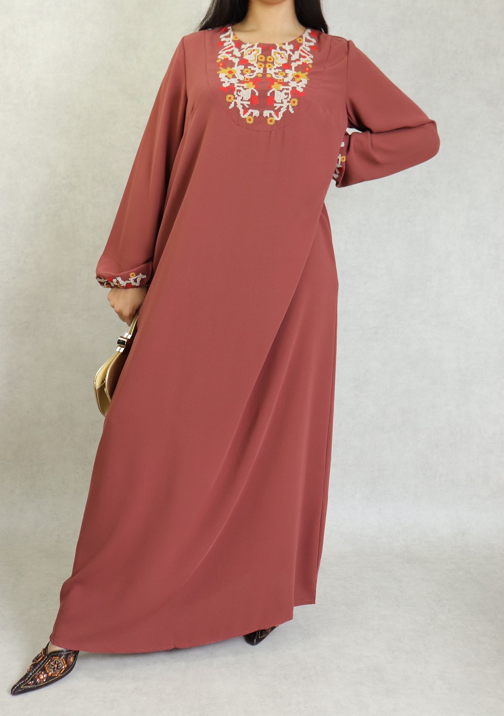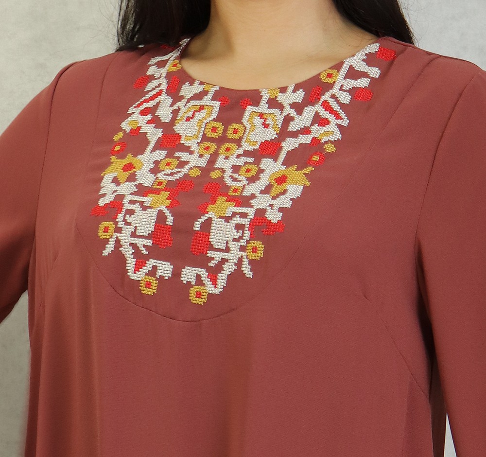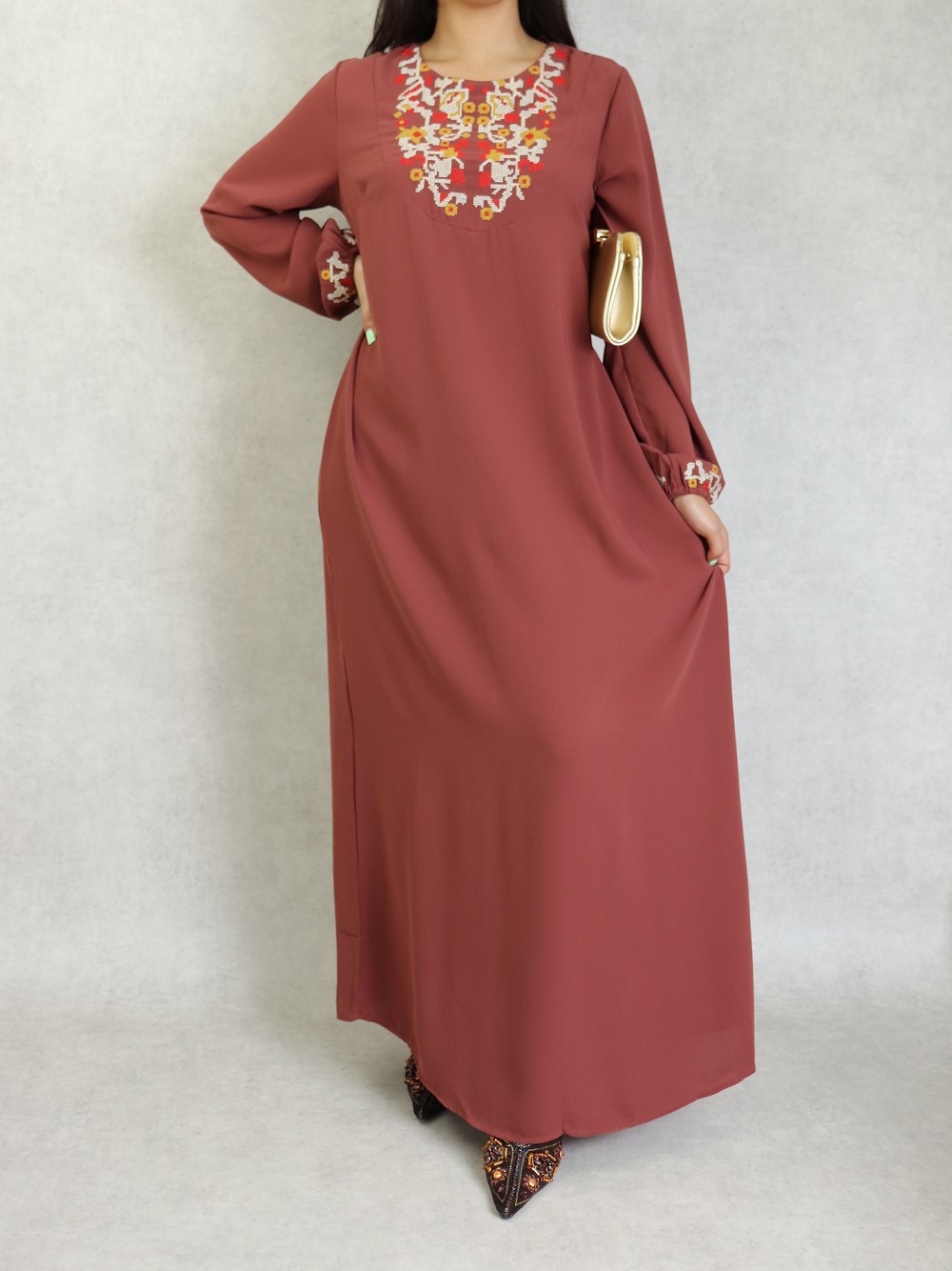 Robe longue, col rond, brodé sur le buste ainsi que sur les manches bouffantes élastique au poignets. Cette robe par sa broderie originale vous apportera un supplément d'élégance.
