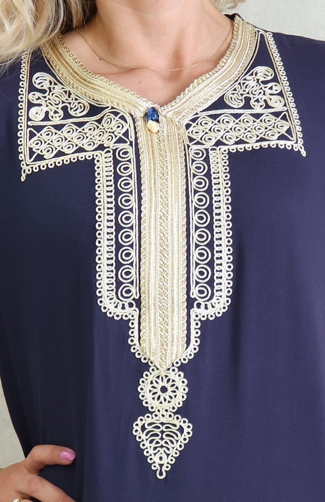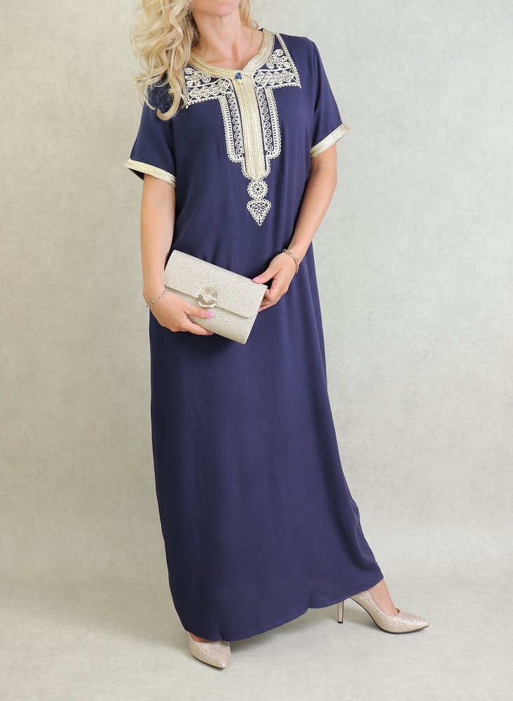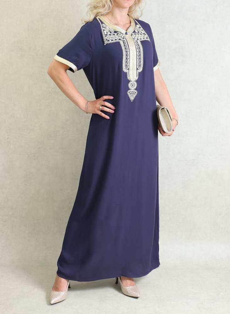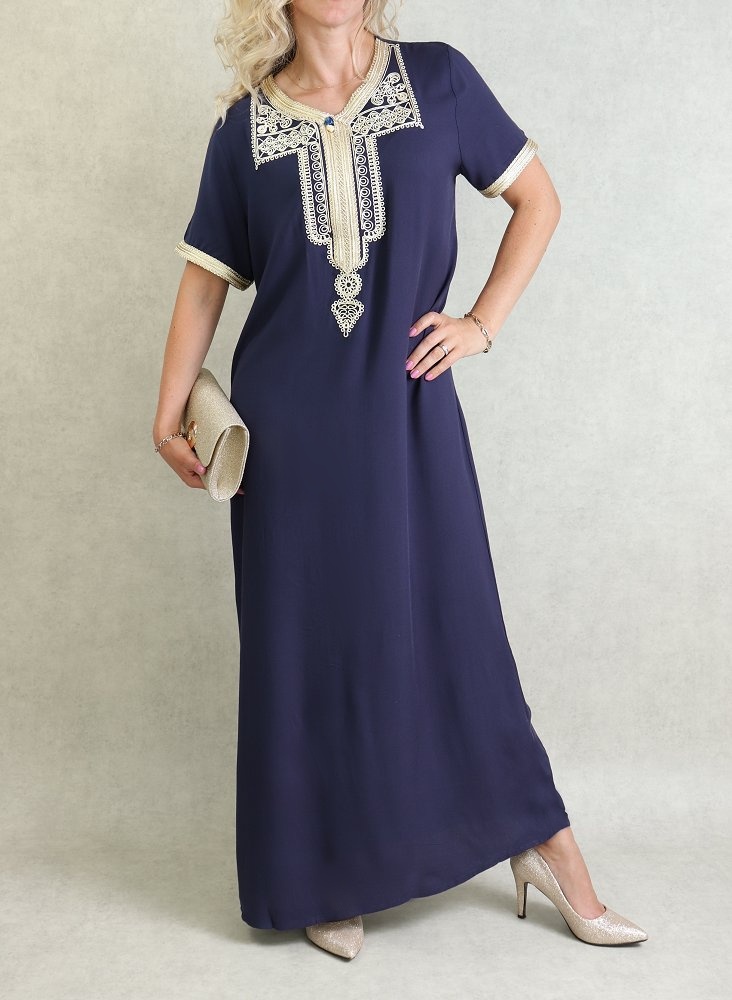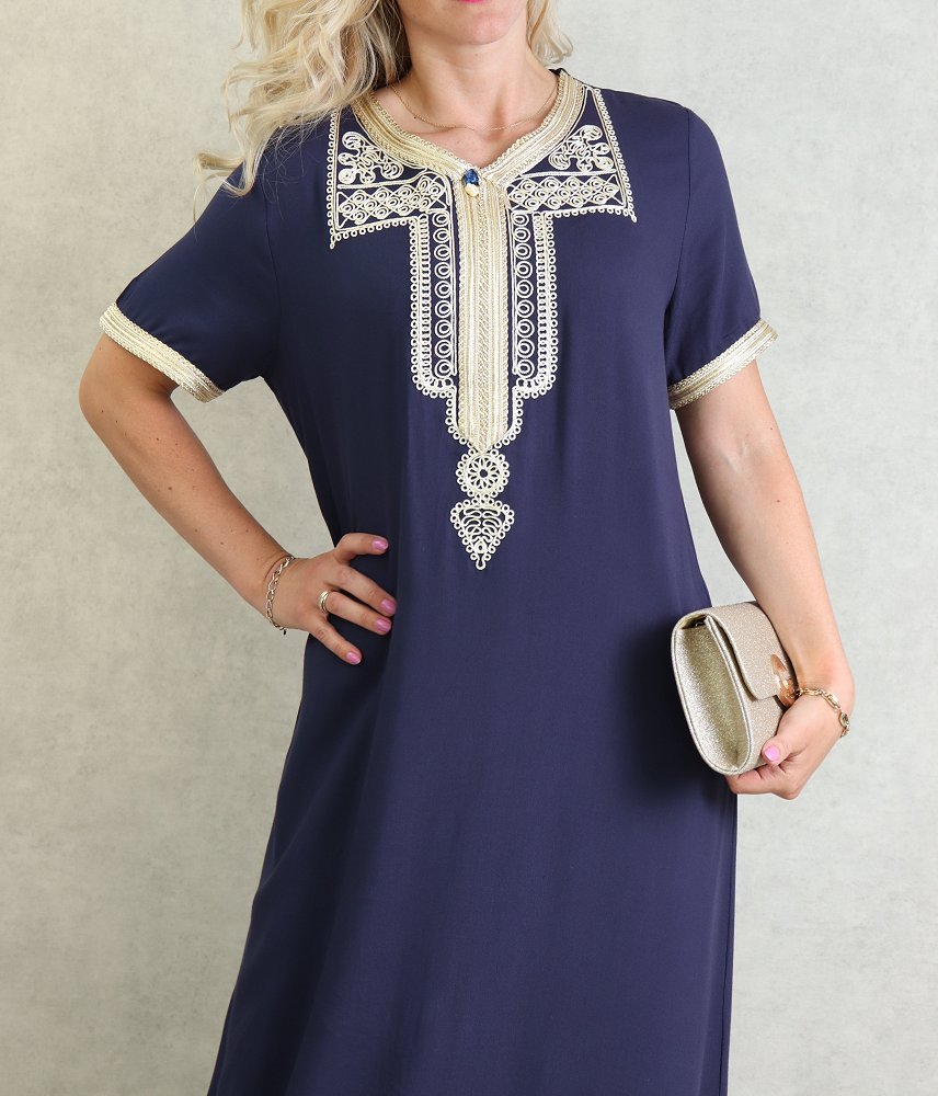 Robe marocaine d'ete manches courtes avec broderies - Couleur Bleu marine