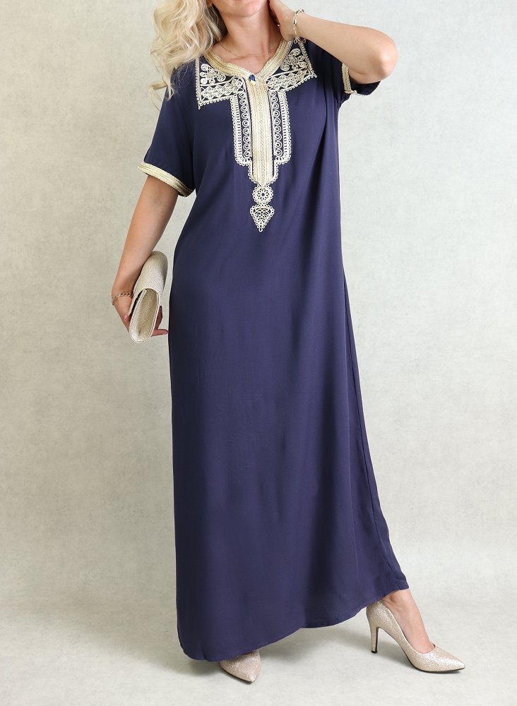 Robe marocaine d'été manches courtes avec broderies - Couleur Bleu marine Vetement & Accessoire