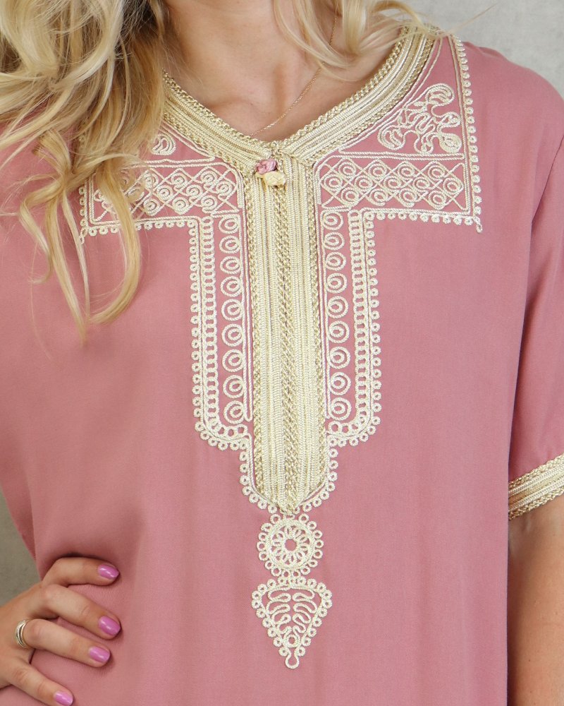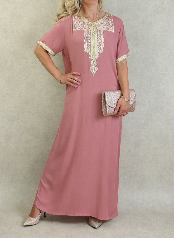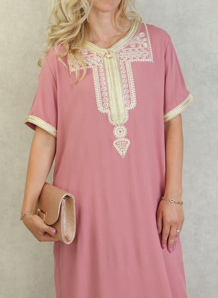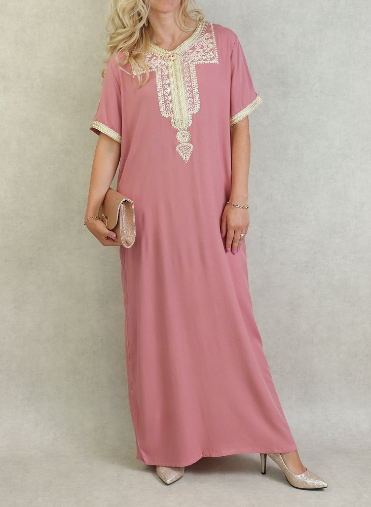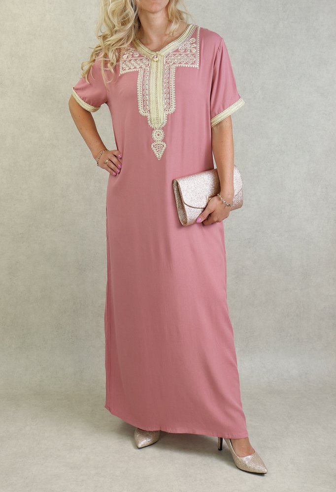 Robe marocaine d'été manches courtes avec broderies - Couleur Vieux Rose Vetement & Accessoire