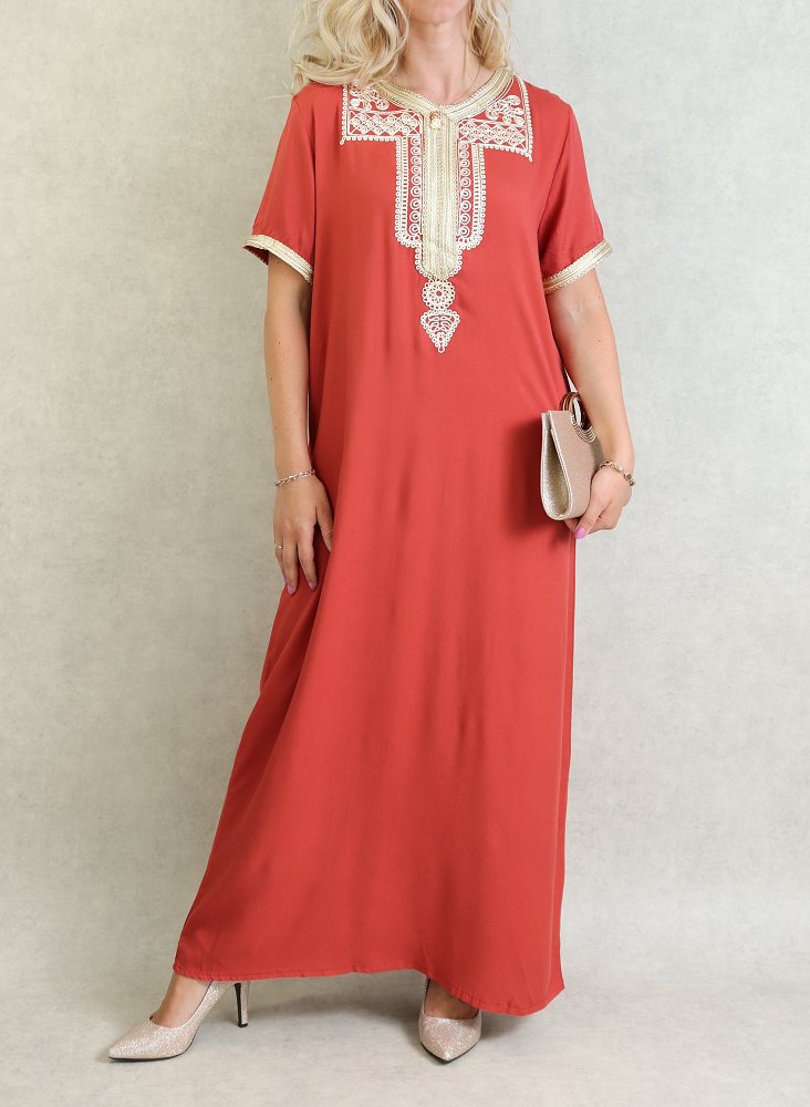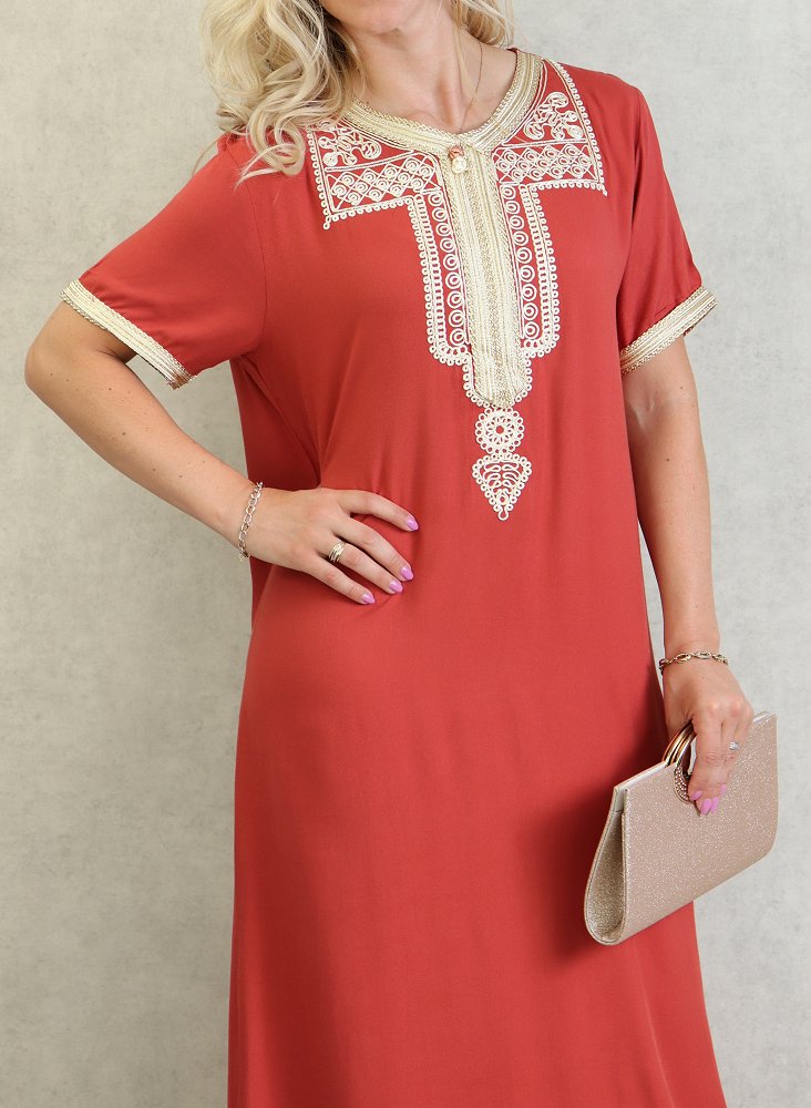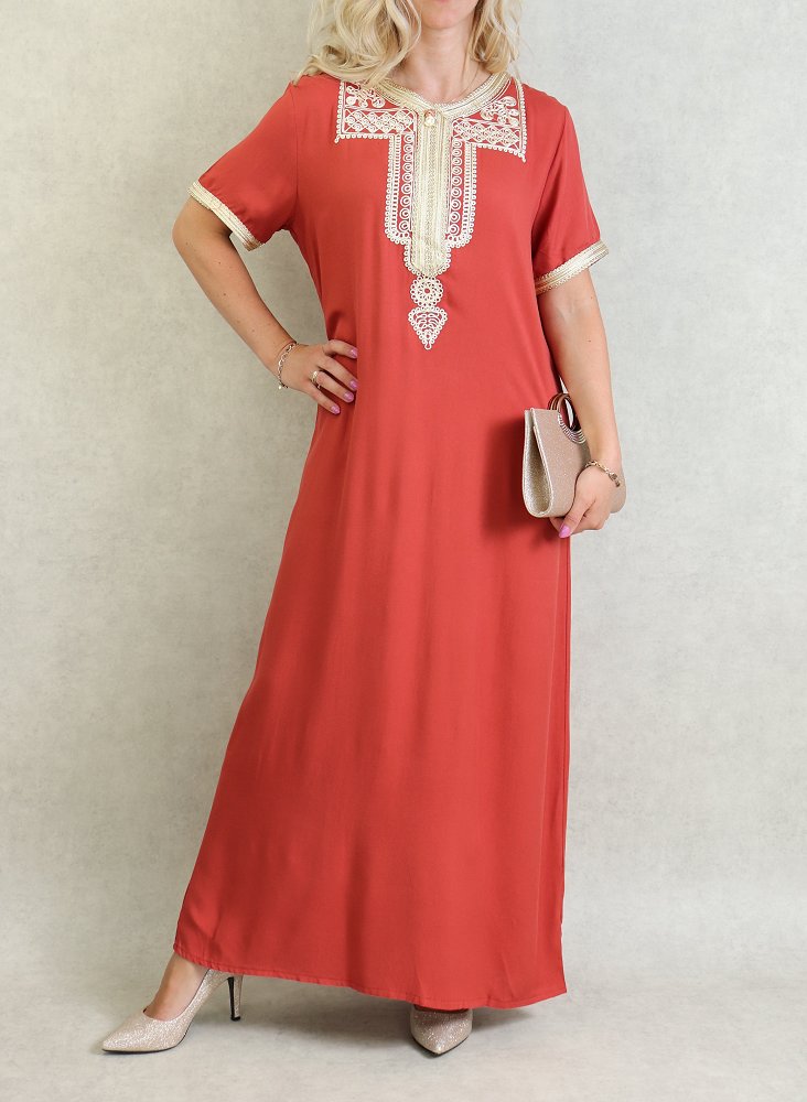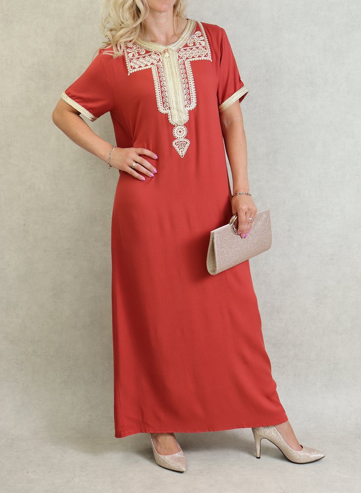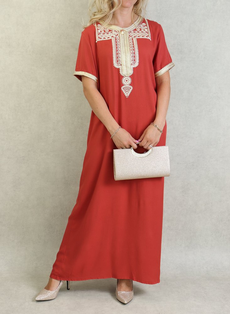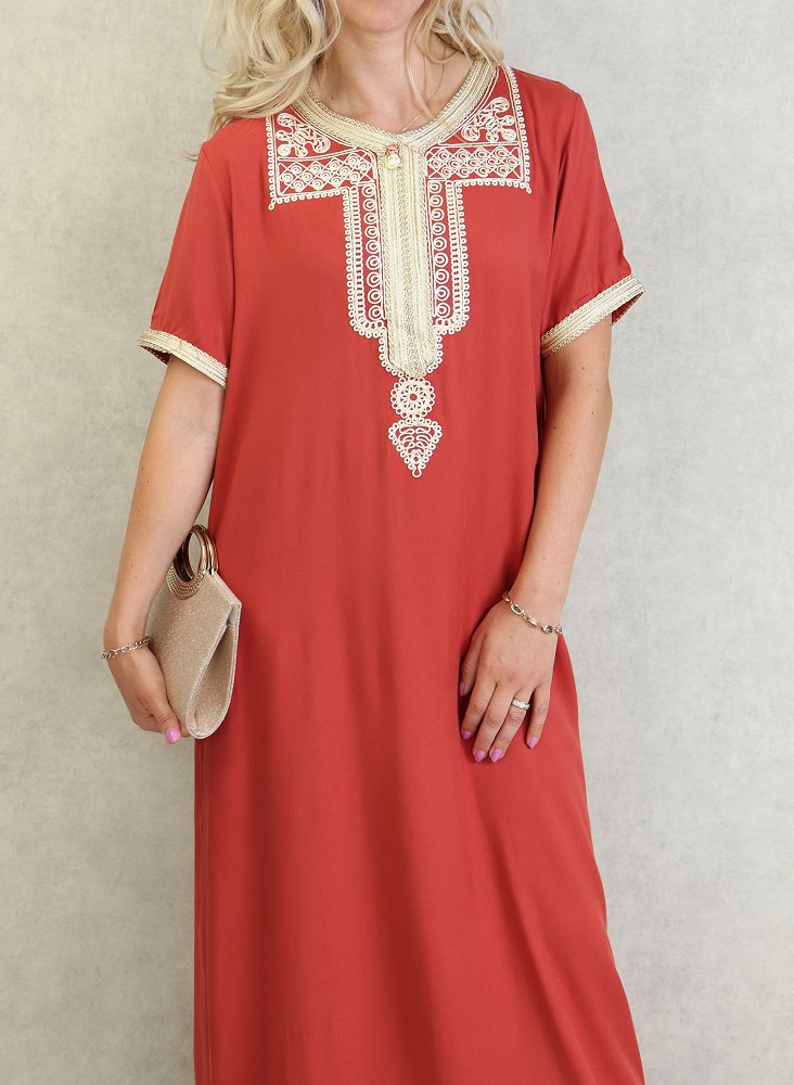 Robe marocaine d'ete manches courtes avec broderies - Couleur rouge brique