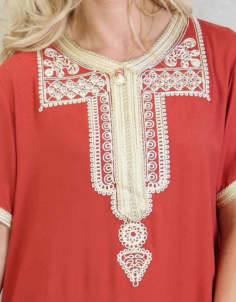 Robe marocaine d'été manches courtes avec broderies - Couleur rouge brique Vetement & Accessoire