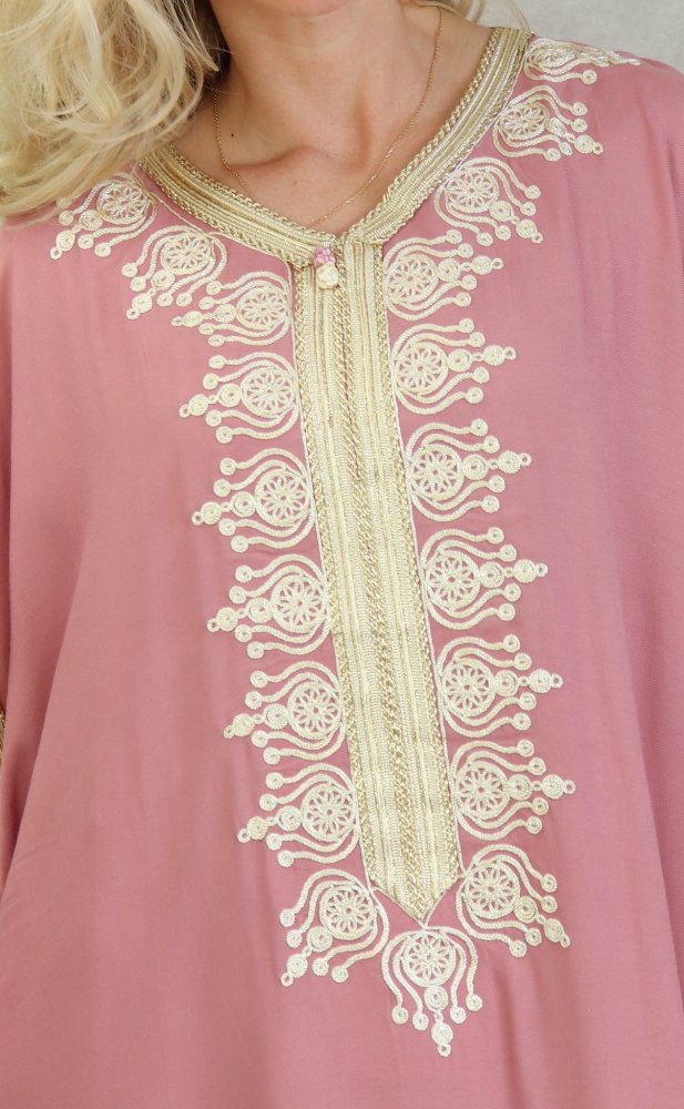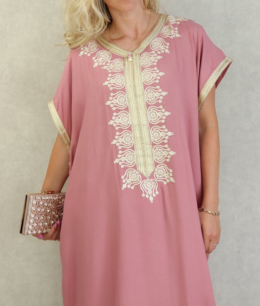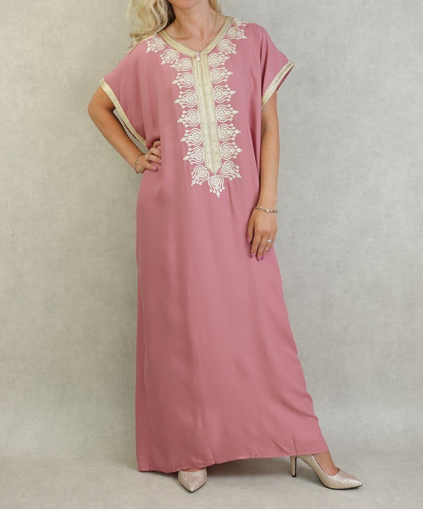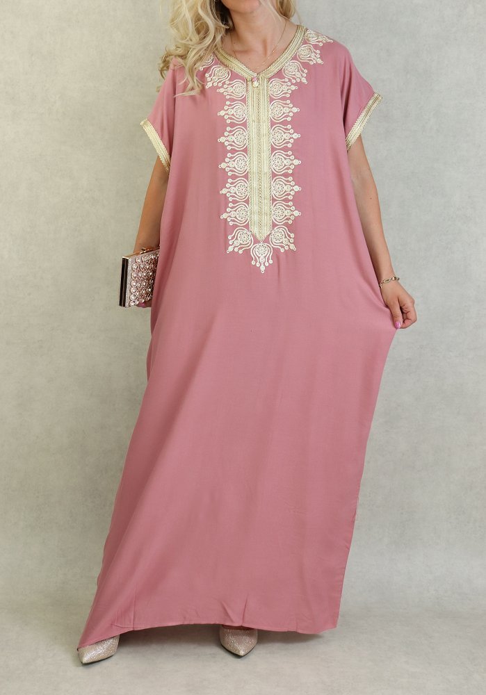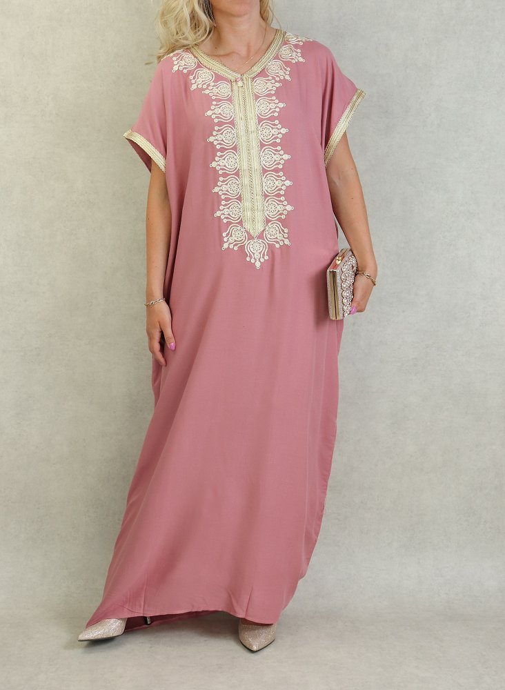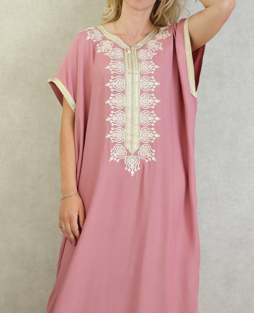 Robe marocaine manches courtes avec broderies - Couleur Vieux Rose Vetement & Accessoire