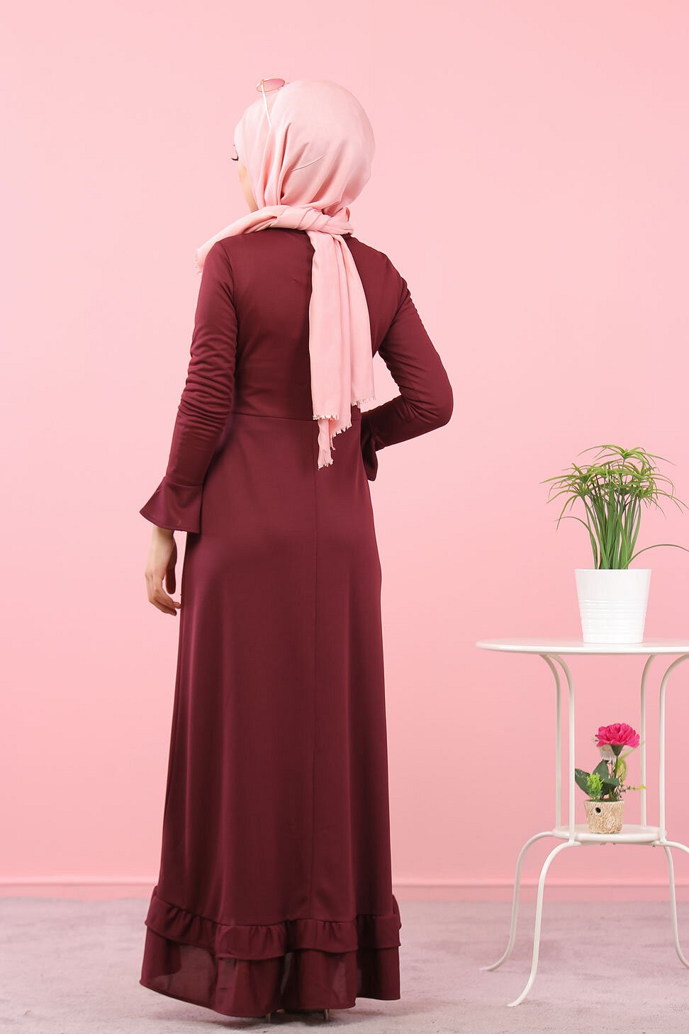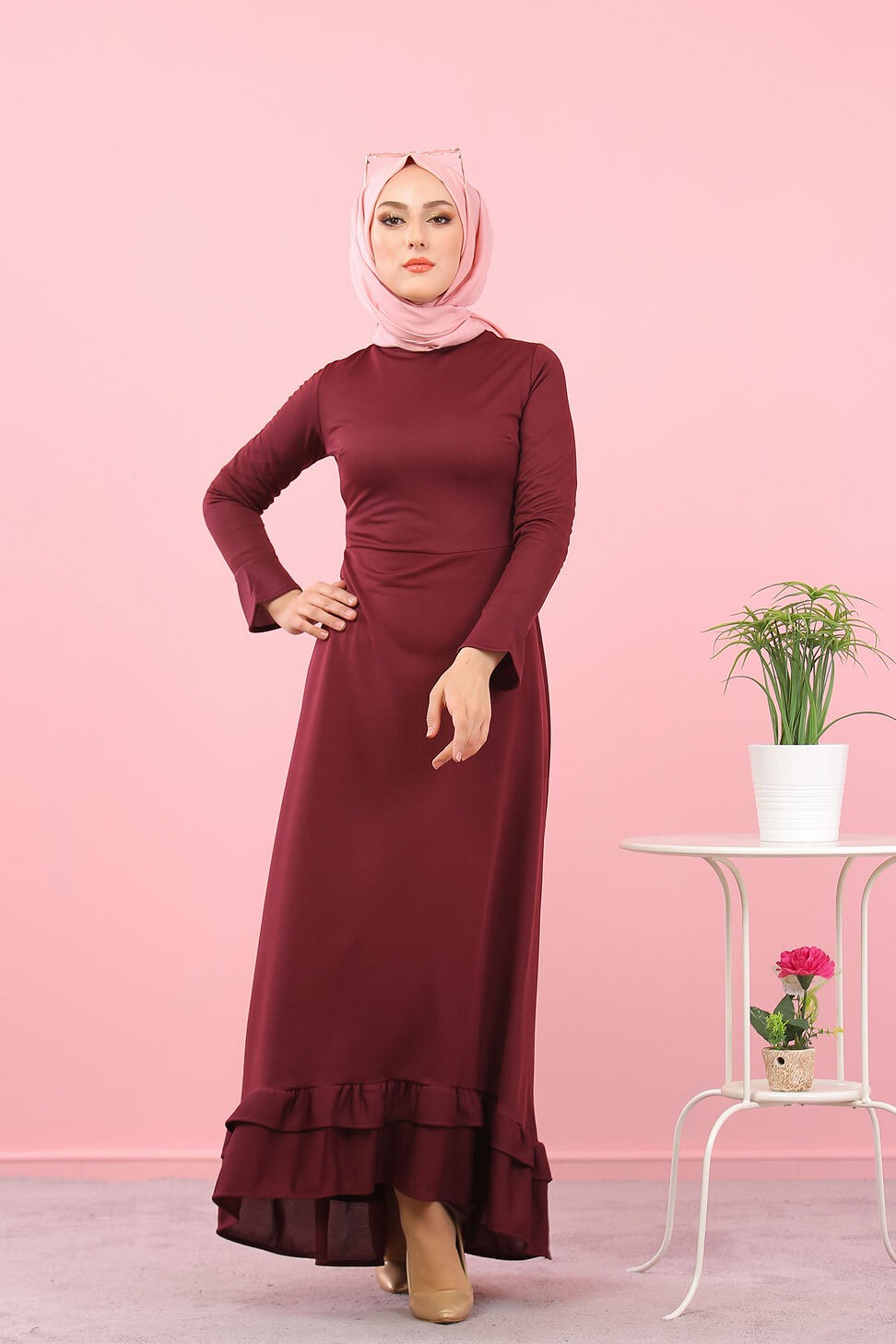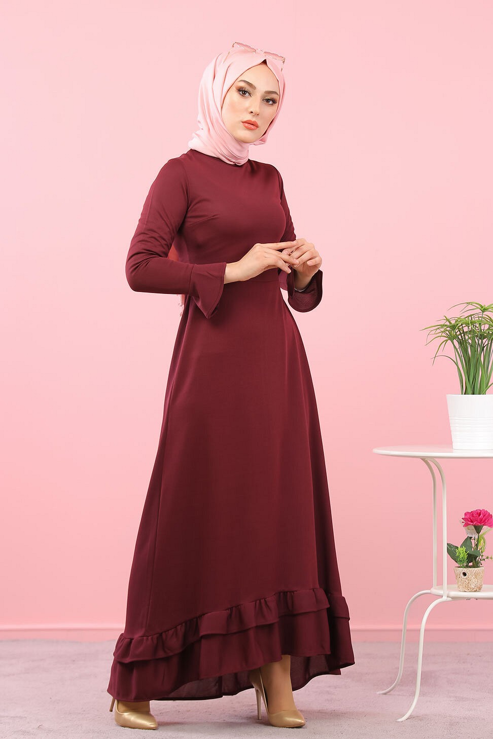 Robe maxi-longue a volants (Vetement femme voilee) - Couleur Grenat