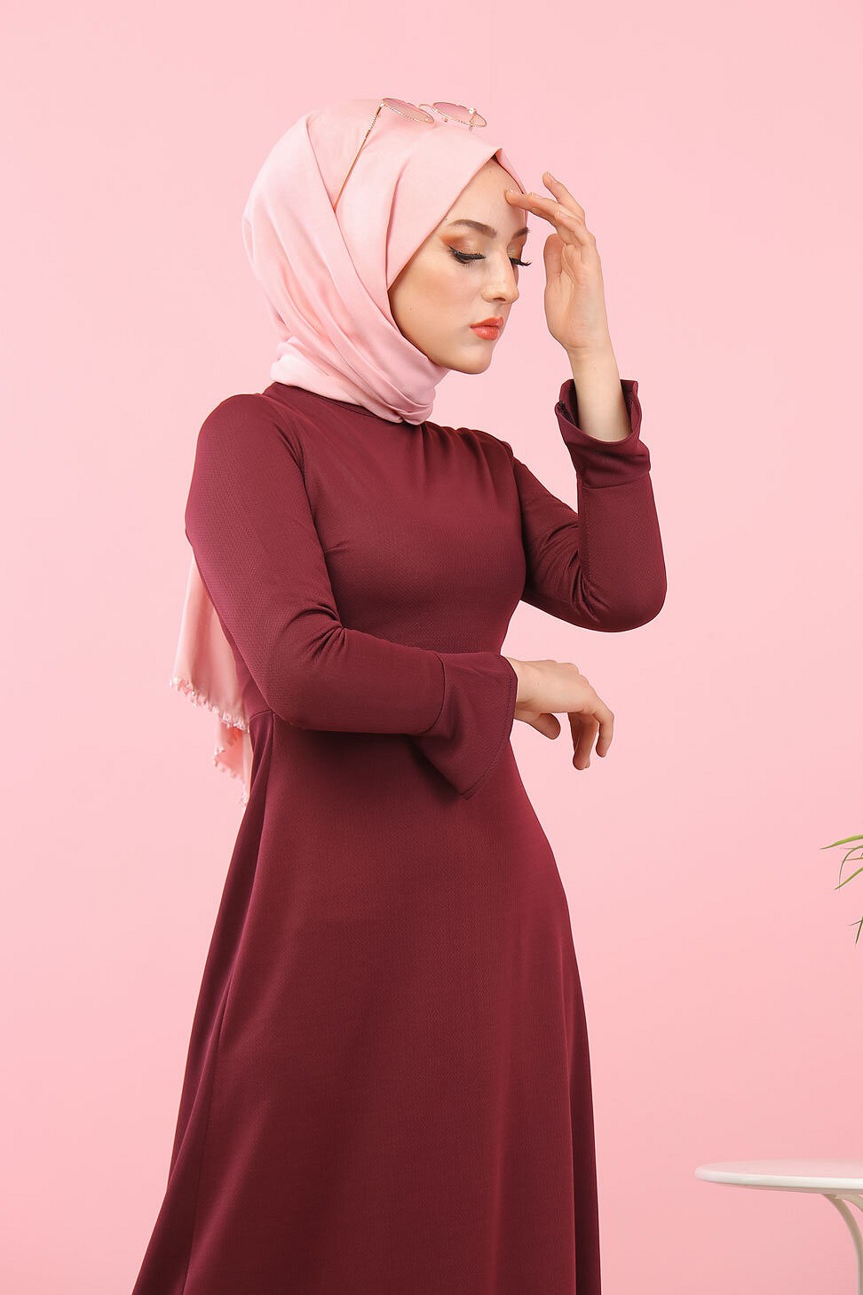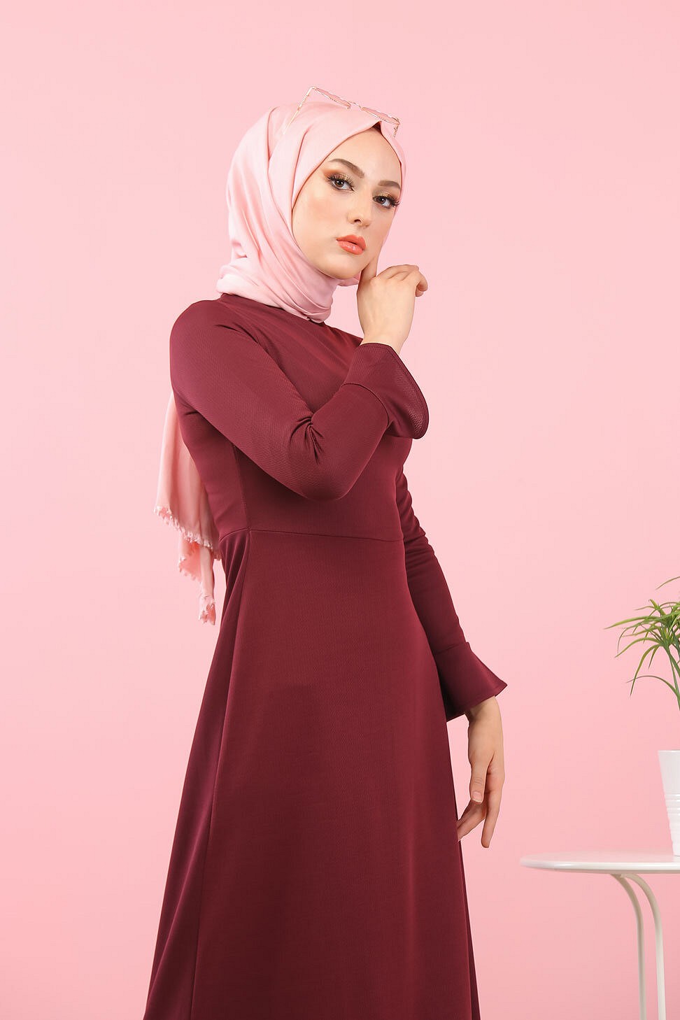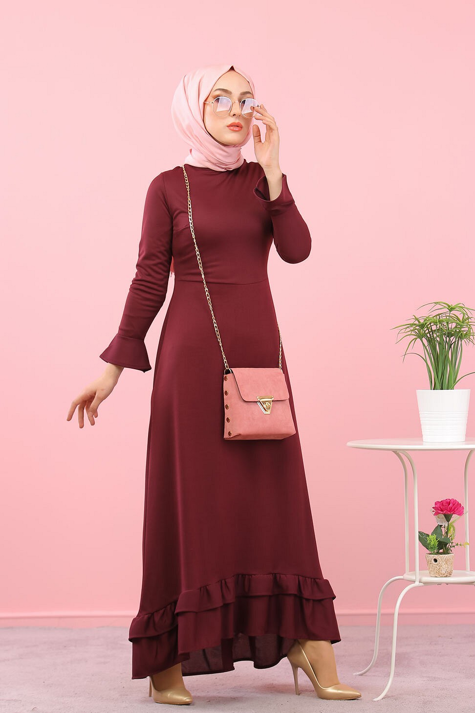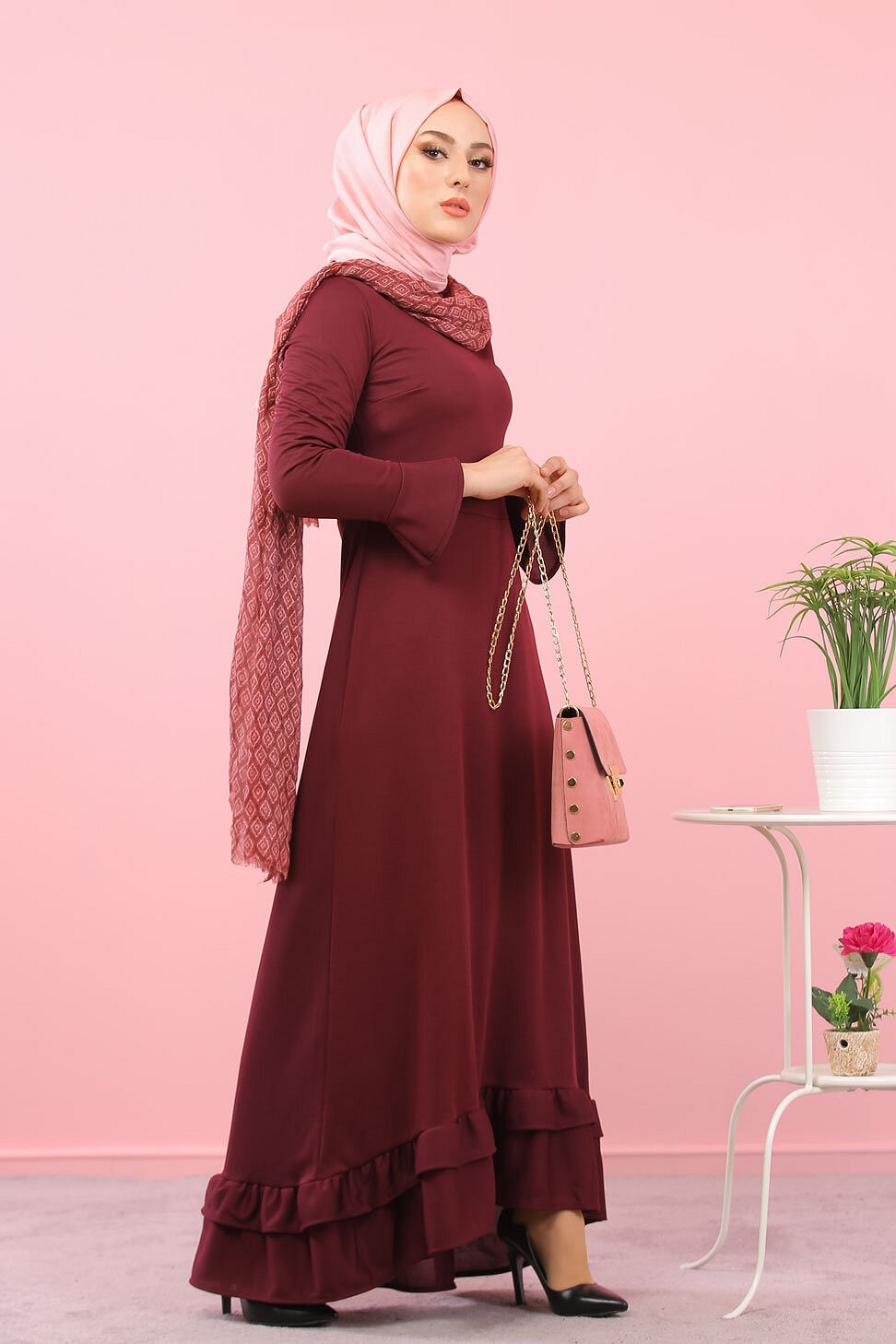 Robe maxi-longue a volants (Vetement femme voilee) - Couleur Grenat