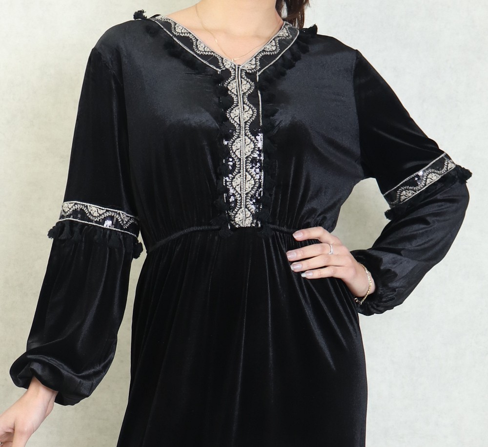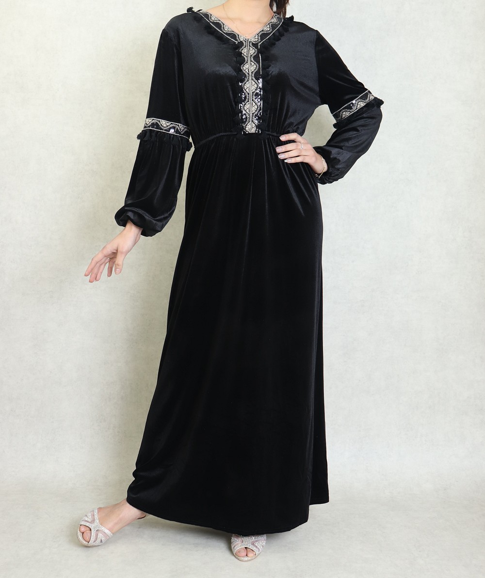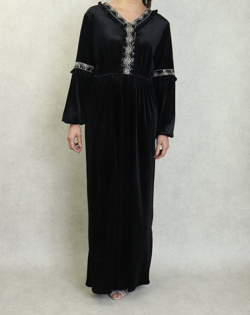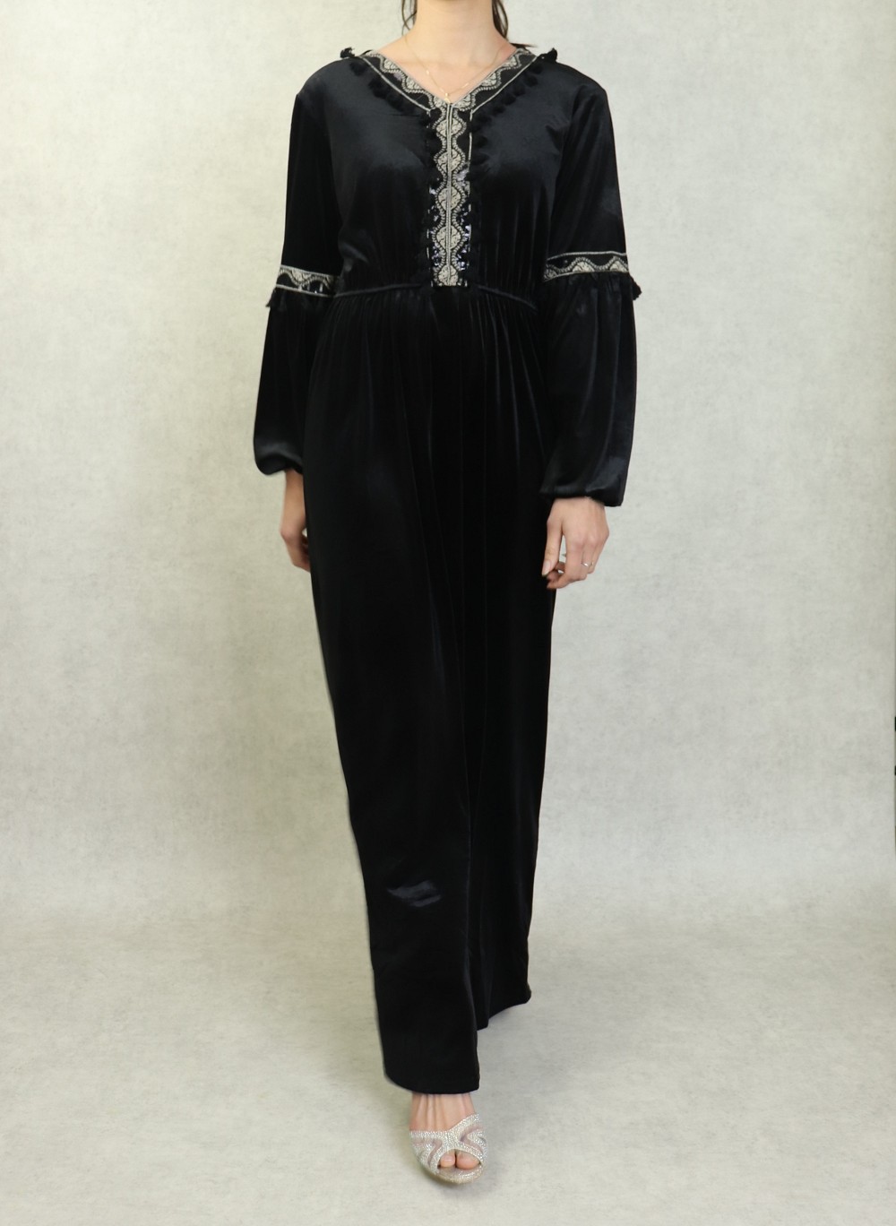 Robe maxi-longue en velours avec broderies et pompons (Saison Automne Hiver) - Couleur Noir Vetement & Accessoire