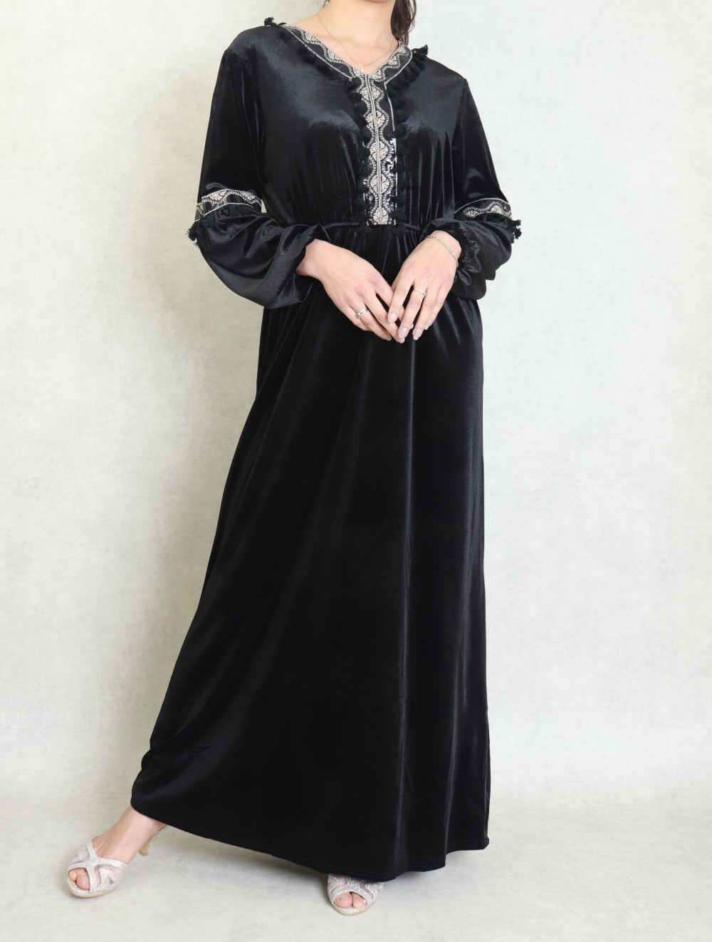 Avec un style chic et classique, cette robe longue en velours saura vous satisfaire avec ses broderies fines.